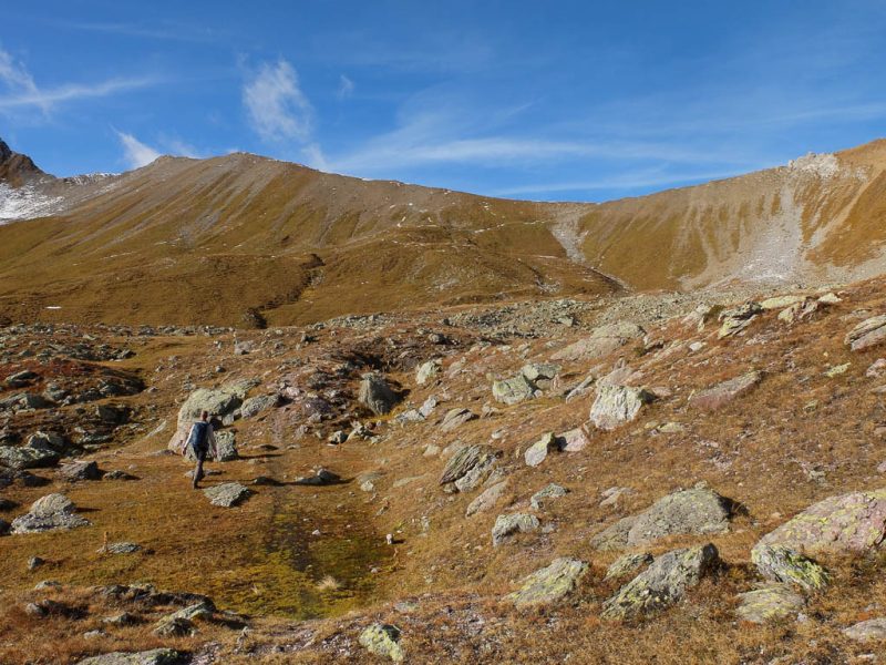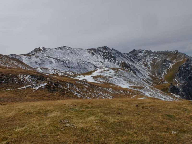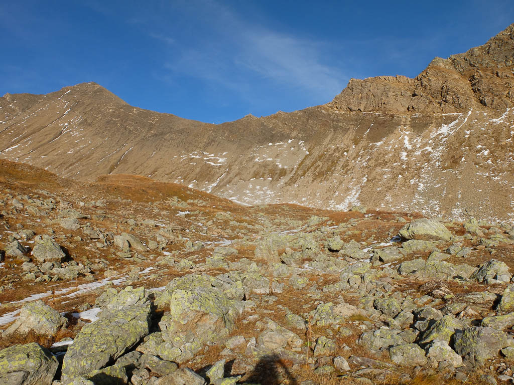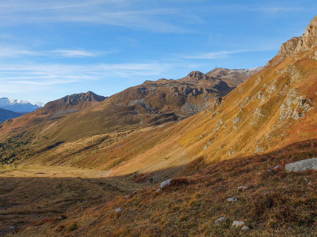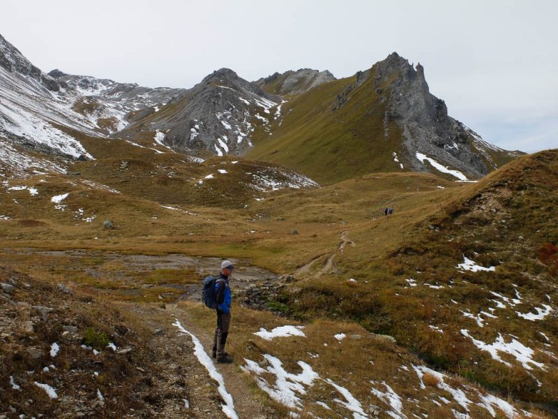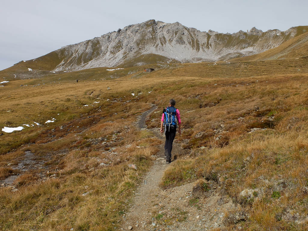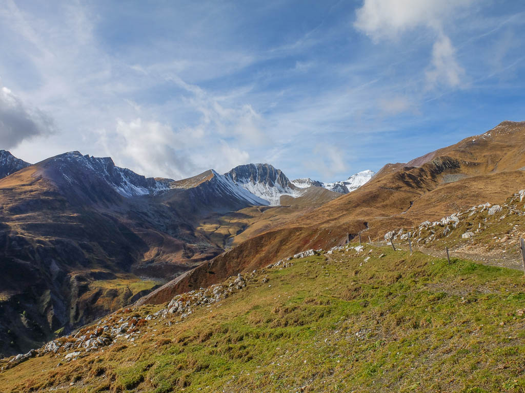 Die vor uns liegenden, leicht bezuckerten Gipfel sind das Tällihorn und das Wuosthorn. Schließlich macht der sich südwestlich hinziehende Wanderweg einen Bogen und geht Richtung Norden weiter. Hier erblicken wir zum ersten Mal die Tällifurgga: