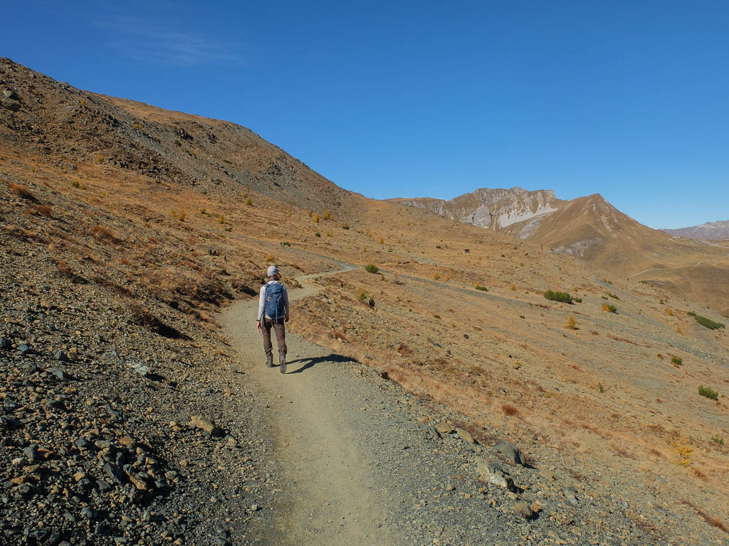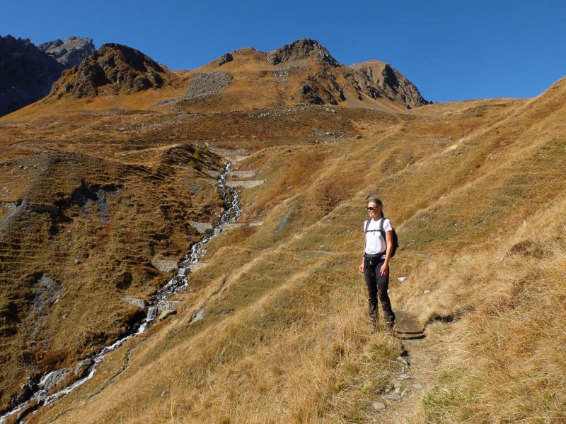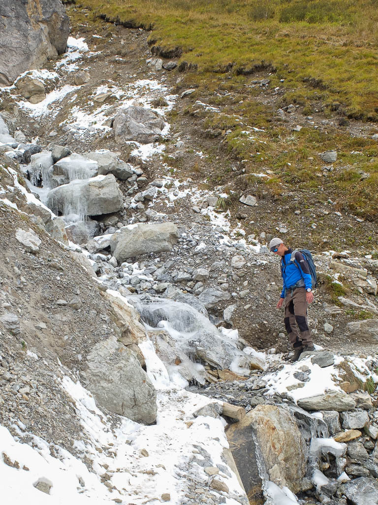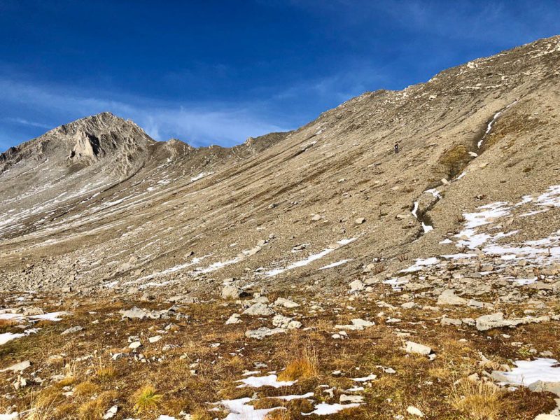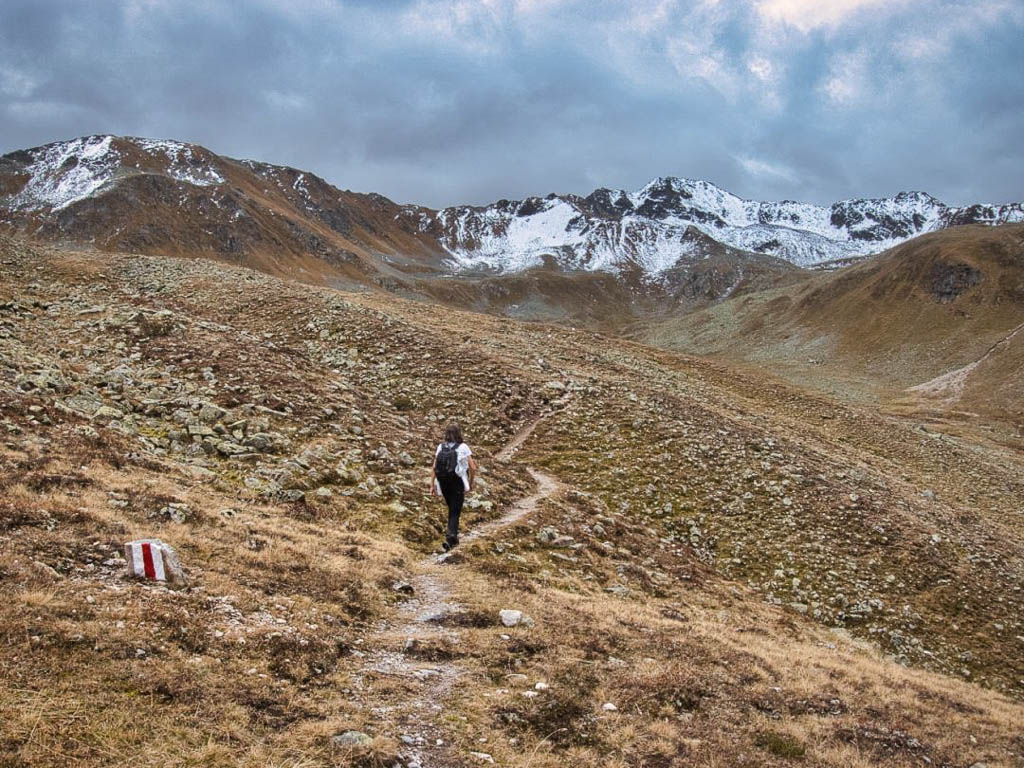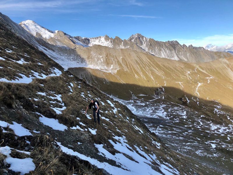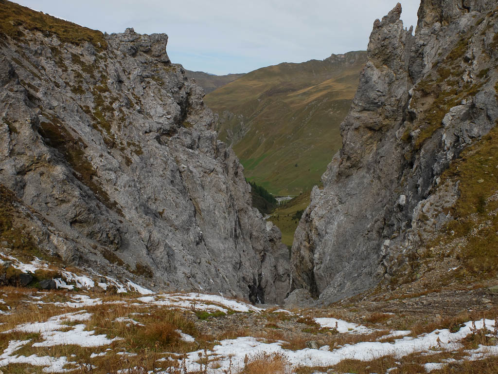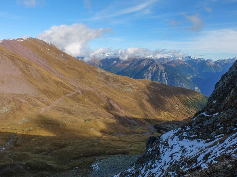 Die vor uns liegenden, leicht bezuckerten Gipfel sind das Tällihorn und das Wuosthorn. Schließlich macht der sich südwestlich hinziehende Wanderweg einen Bogen und geht Richtung Norden weiter. Hier erblicken wir zum ersten Mal die Tällifurgga: