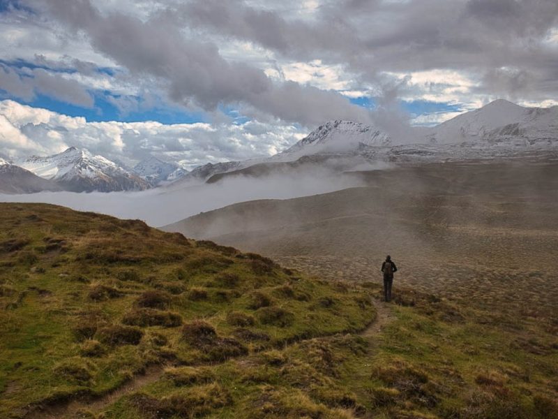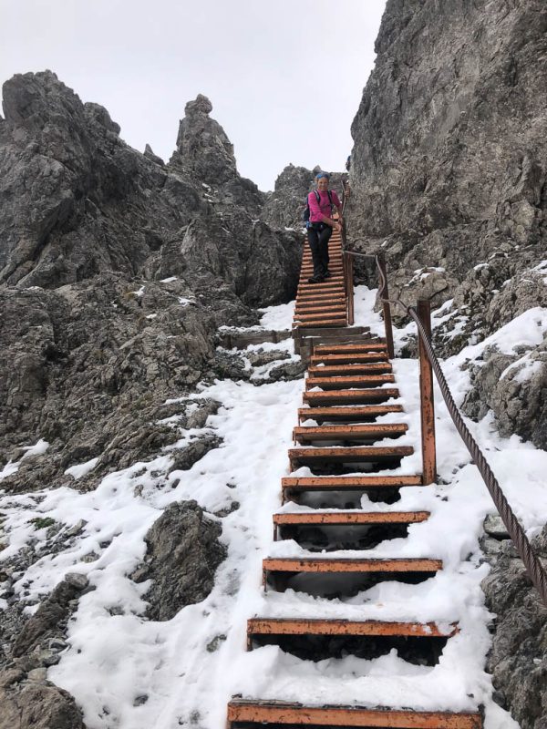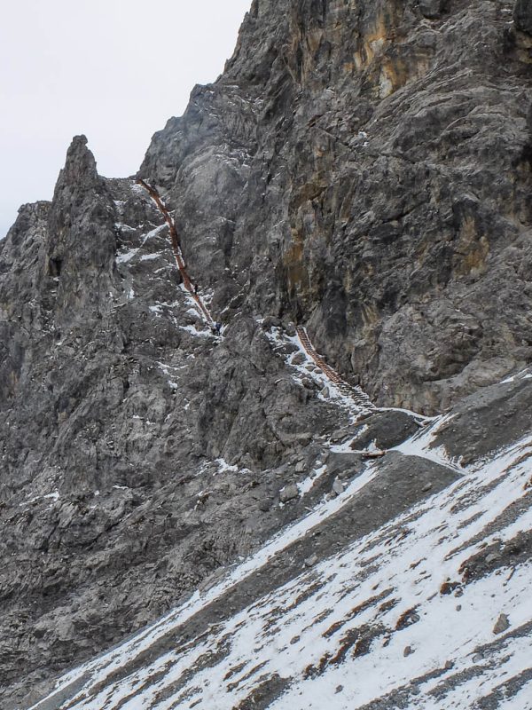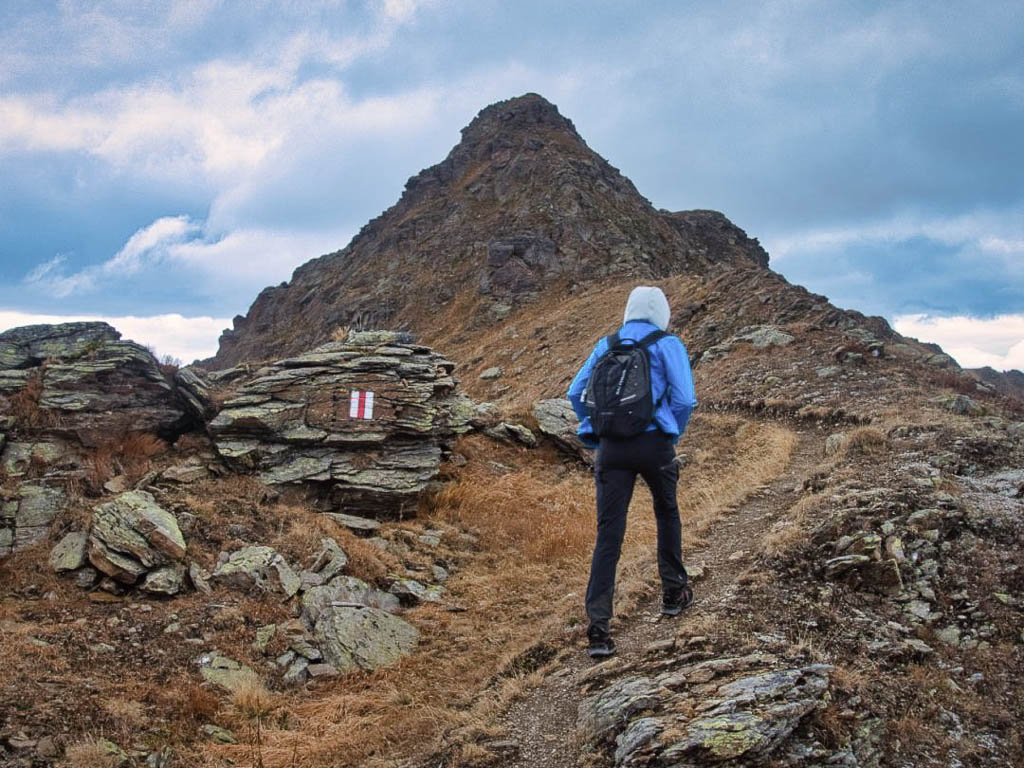 Auf dem Grat ist es ziemlich kalt und windig, außerdem fängt es leicht an zu regnen. Eine weitere Jacke und eine Kapuze halten mich aber einigermaßen warm und trocken: