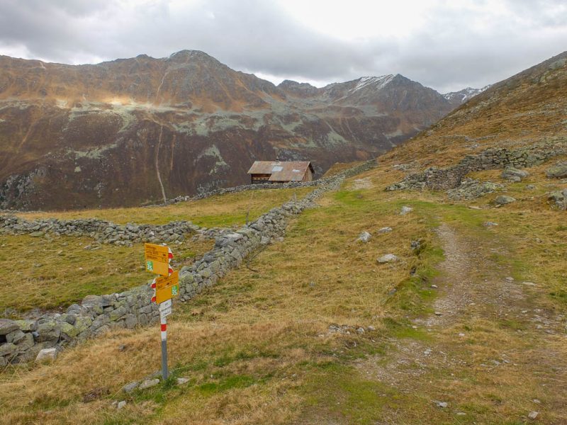 Der Pfeil markiert den mit bloßem Auge sichtbaren Wegweiser. An der Tällifurgga: