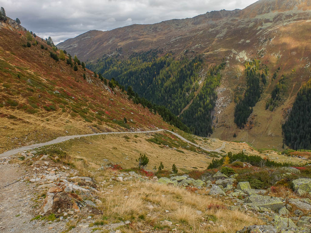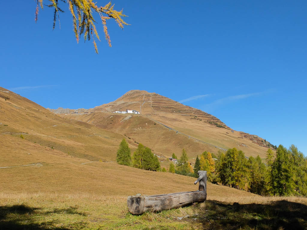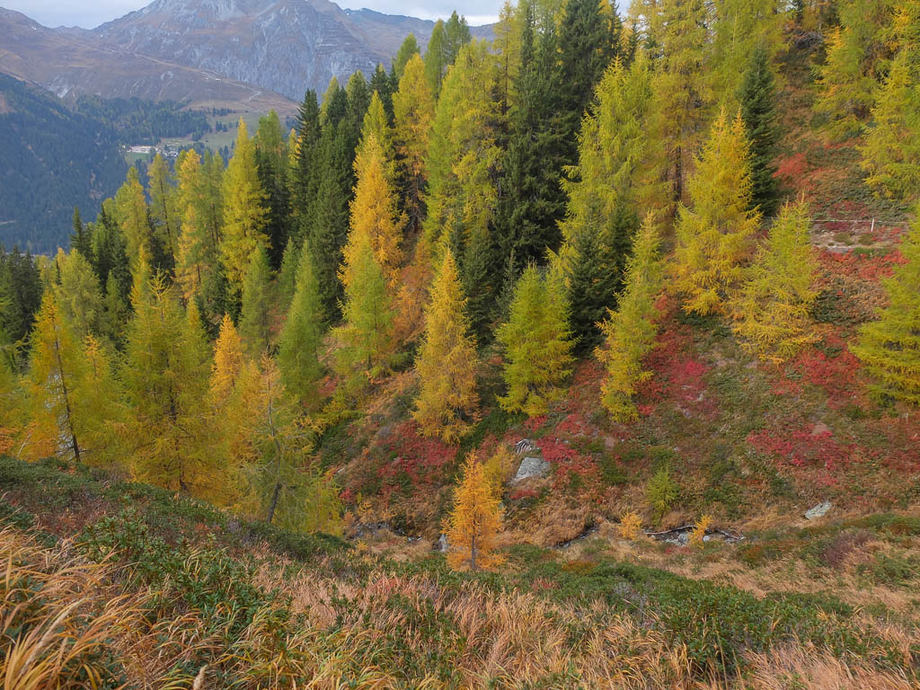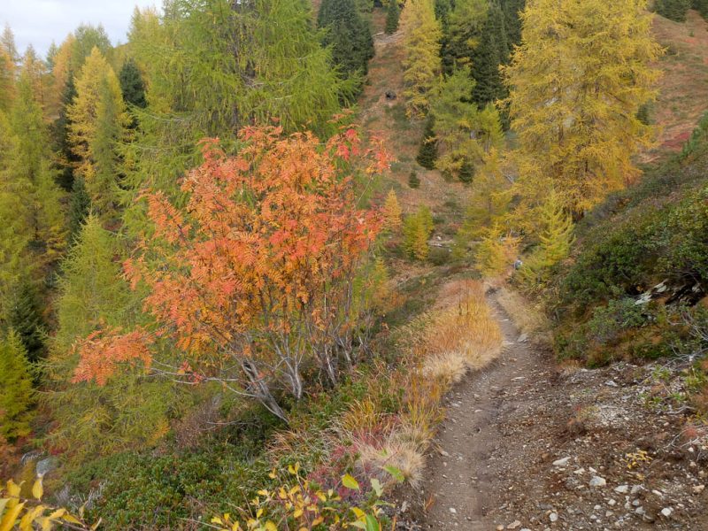 Wie man sieht, stehen die Schneekanonen überall schon parat. Energiesparen ist hier wohl kein Thenma! Wir erreichen die Baumgrenze und tauchen in den bunten Herbstwald ein: