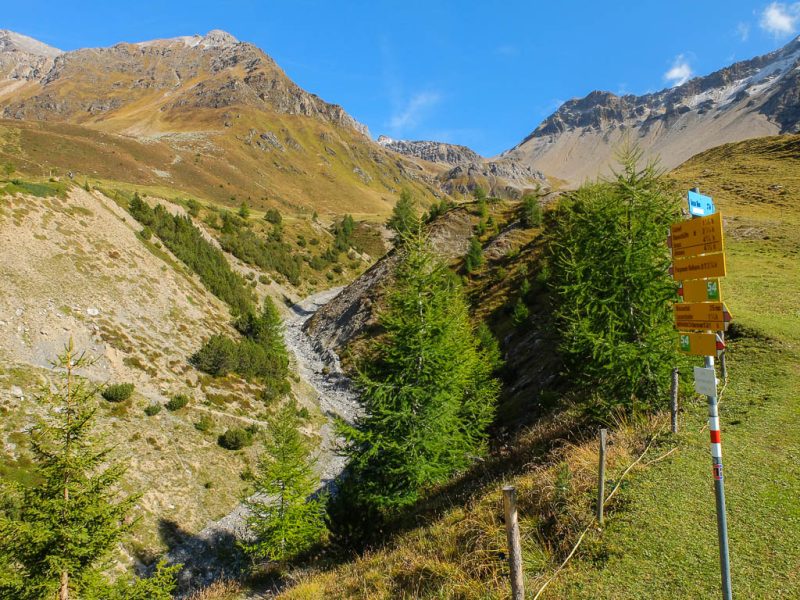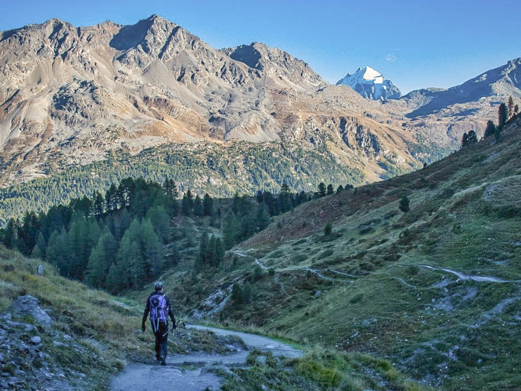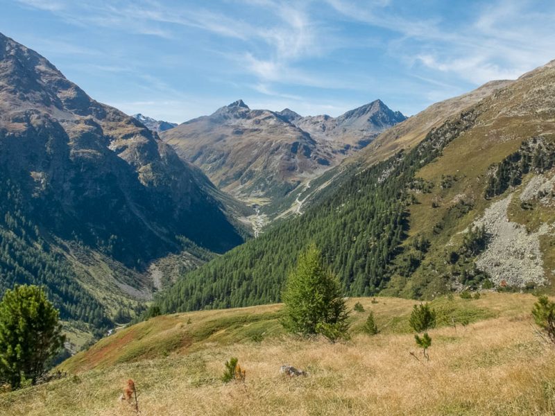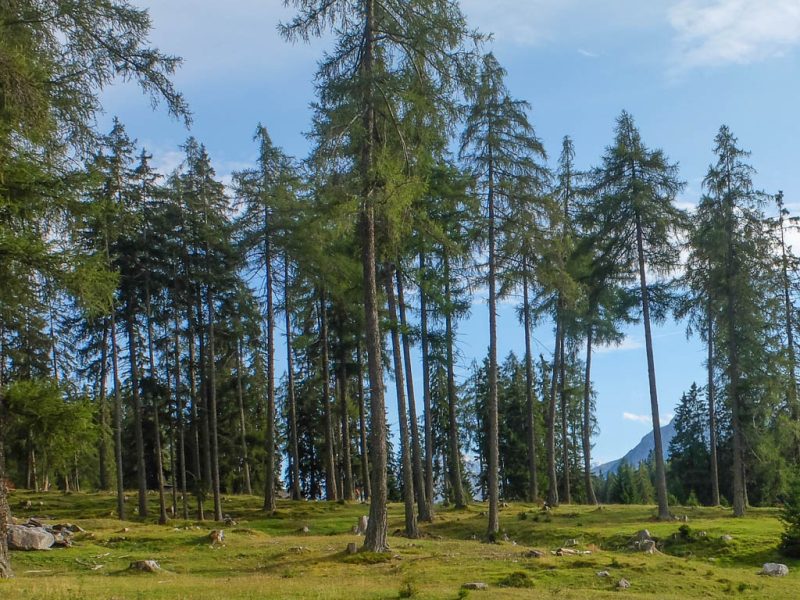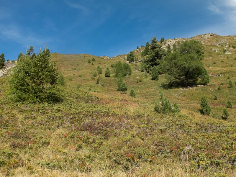 Mittlerweile haben wir so viel Zeit gut gemacht, dass wir langsamer machen und die letzten Kilometer nochmals intensiv genießen können: Die Vegetation mit den vielen Arven rund um uns herum ist für mich Seelenbalsam.