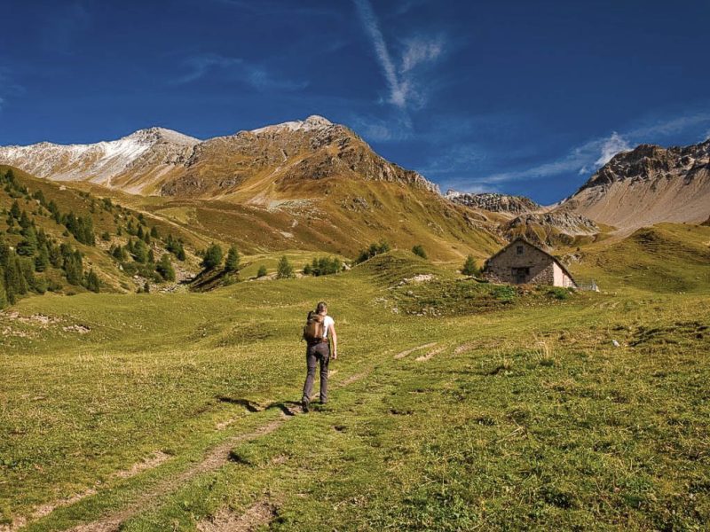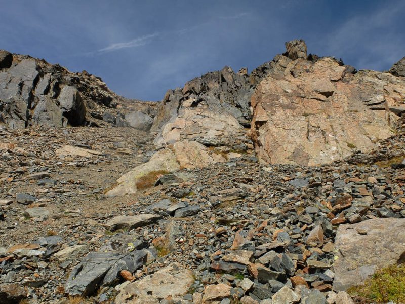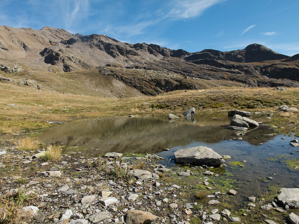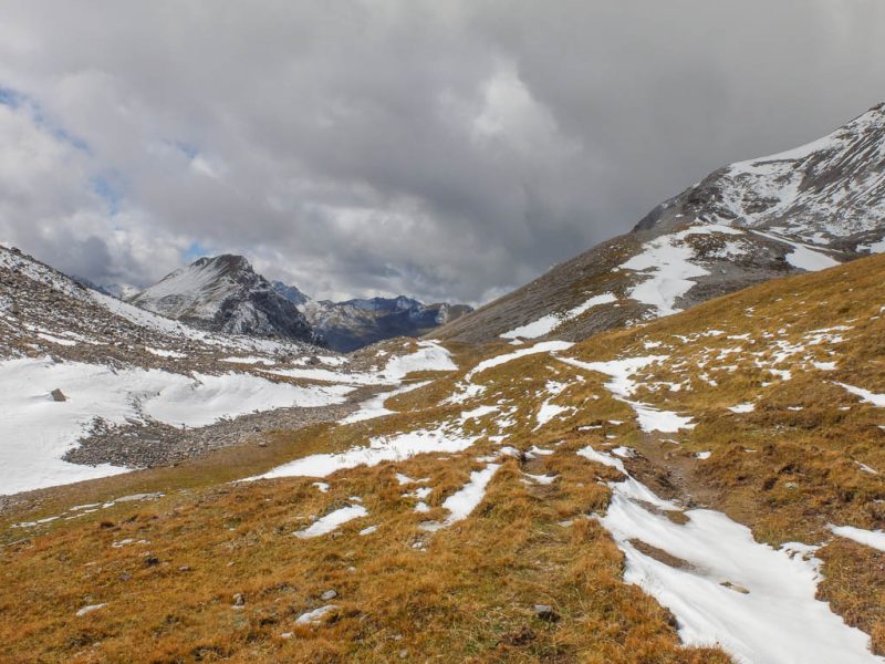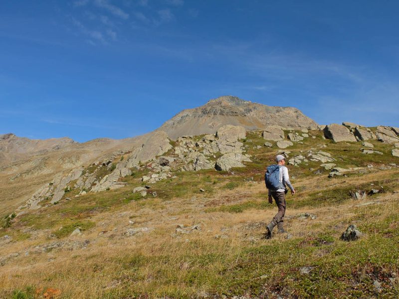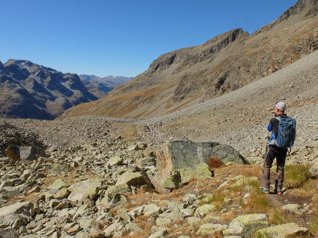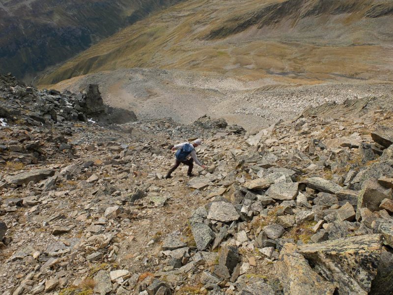 Von der Fuorcla geht es über die Nordflanke zügig hinunter Richtung Champfer. Damit es noch zügiger gehen kann, tausche ich bei Caschigna meine Bergschuhe, ich bin heute mit den Hanwag Bergschuhen unterwegs, gegen „normale“ Wanderschuhe aus. So angenehm der steigeisentaugliche Bergschuh in felsigem Gelände ist, wird es flacher, tun mir darin – und auch in anderen Bergschuhen – die Fußsohlen weh. Ich nehme daher zum Wohle meiner Füße meist zwei Paar Schuhe mit auf unsere Touren. Der Abstieg entlang der Ova da Suvretta: