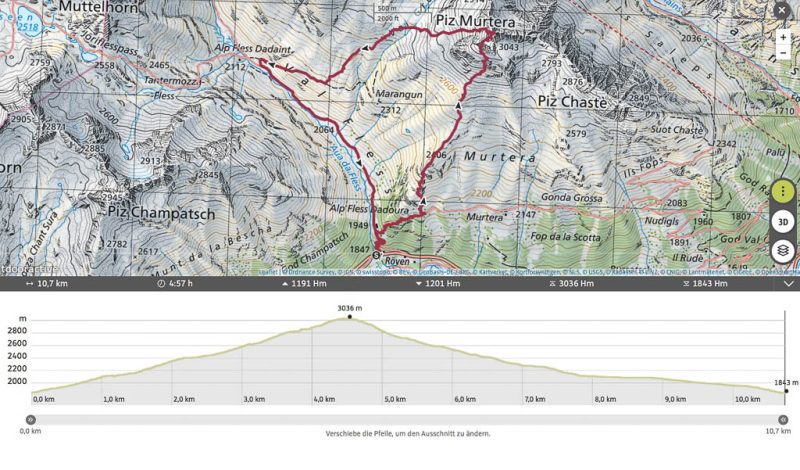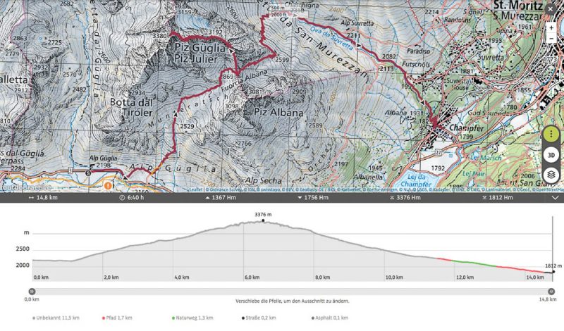 Die Zeiten des Tourenplaners sind hier nicht ganz realistisch, da das Gelände bei der Berechnung nicht berücksichtigt wird. Mein Fazit: Die Besteigung des Piz Juliers über den Crasta da la Senda ist ein Vergnügen der Extraklasse, setzt aber trotz der guten Absicherung des Wegs Schwindelfreiheit und Trittsicherheit voraus. Sind beides vorhanden, gehört dieser Gipfel sicherlich mit zu den schönsten Dreitausendern der Alpen.