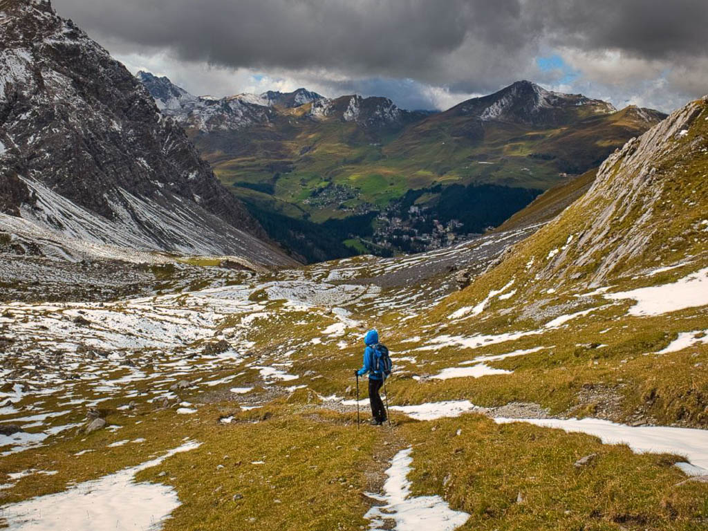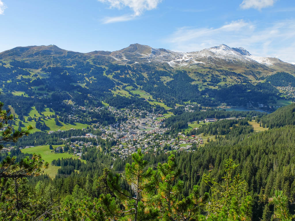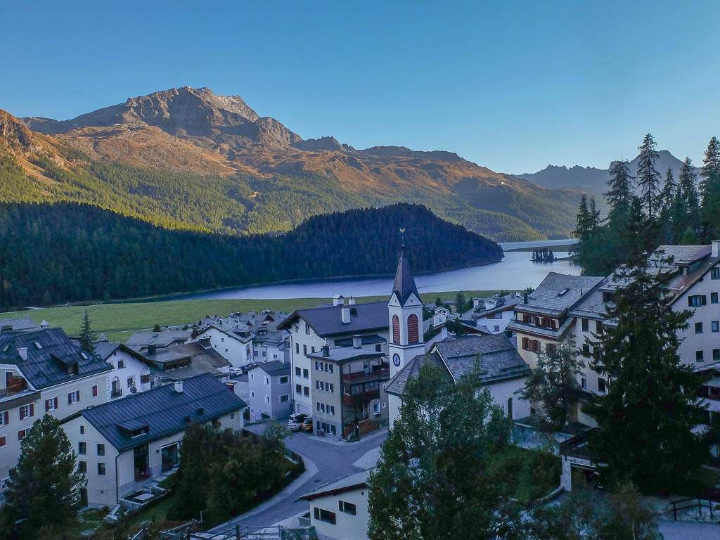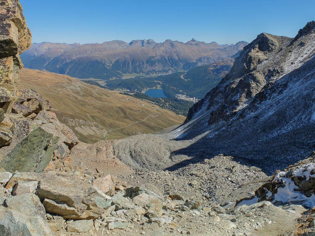 Schließlich erreichen wir die Fuorcla Albana, von der aus man hinunter auf St. Moritz blickt: