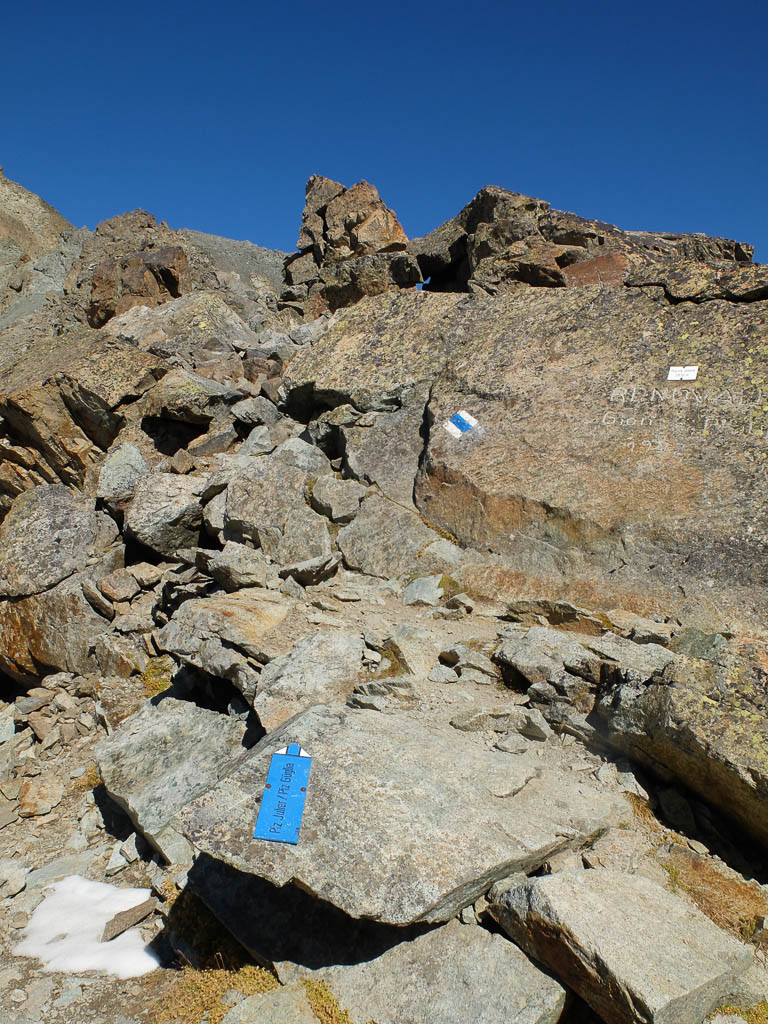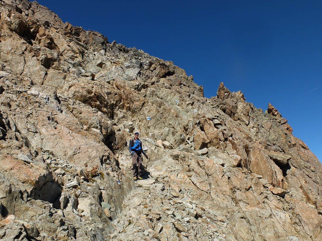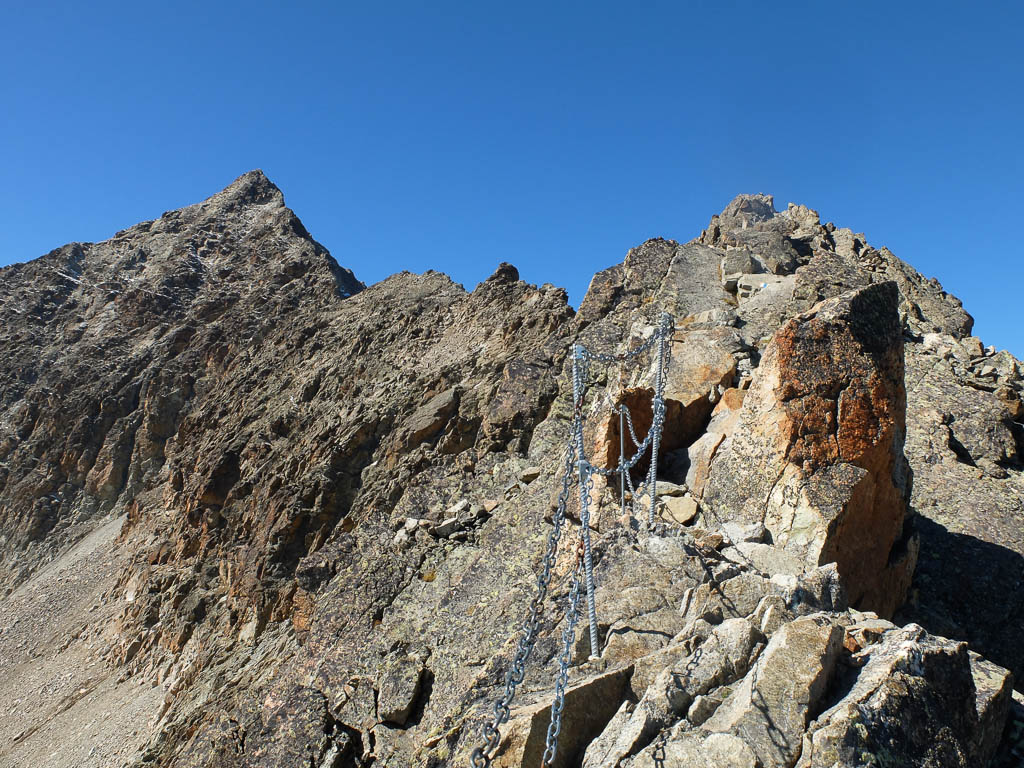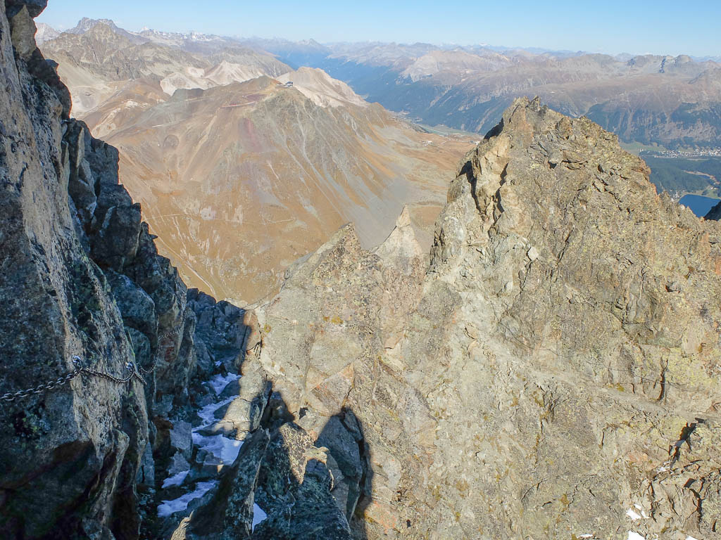 Bei guten Verhältnissen braucht man diese Hilfen wohl eher nicht. Aber wenn es so wie heute teilweise über Schnee geht, ist man doch sehr dankbar, sich irgendwo festhalten zu können. Alles in allem ist es aber ein wunderbarer Aufstieg ganz nach meinem Geschmack: Kurze, einfache Klettereien wechseln sich mit Gehpassagen ab, die Wegführung ist abwechslungsreich und spannend. Mit zunehmender Höhe werde ich allerdings immer langsamer, die letzten einhundert Höhenmeter geht es gefühlt nur noch im Schneckentempo weiter. Aber schließlich ist es geschafft, wir stehen auf dem Gipfel des Piz Julier: