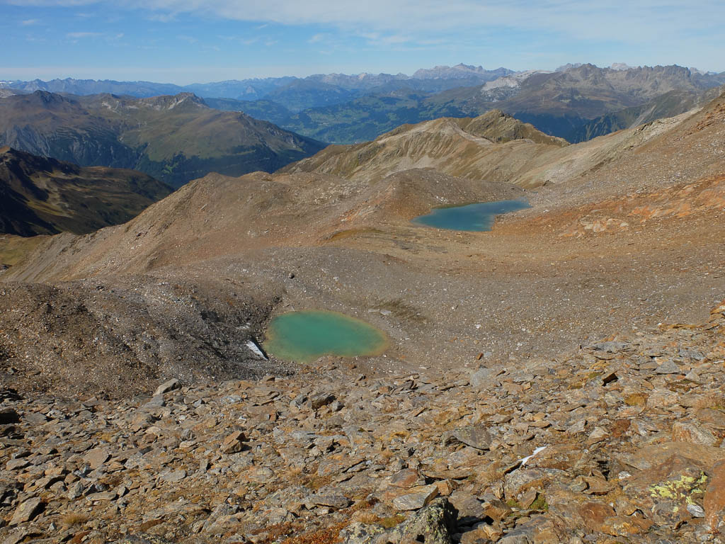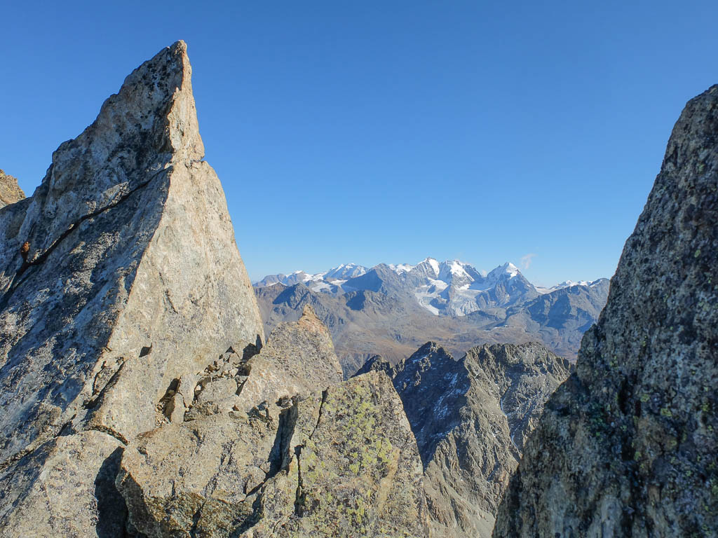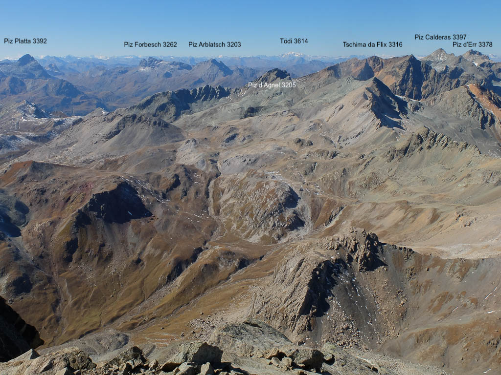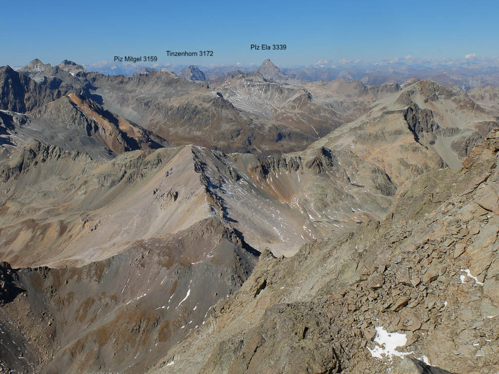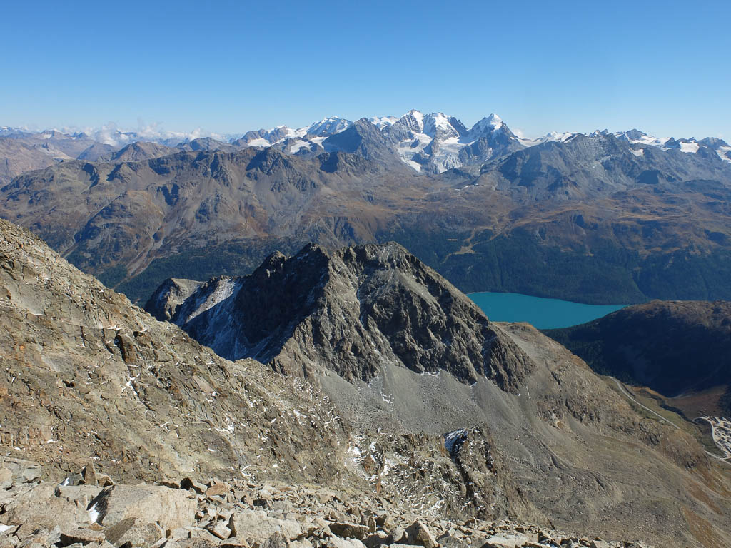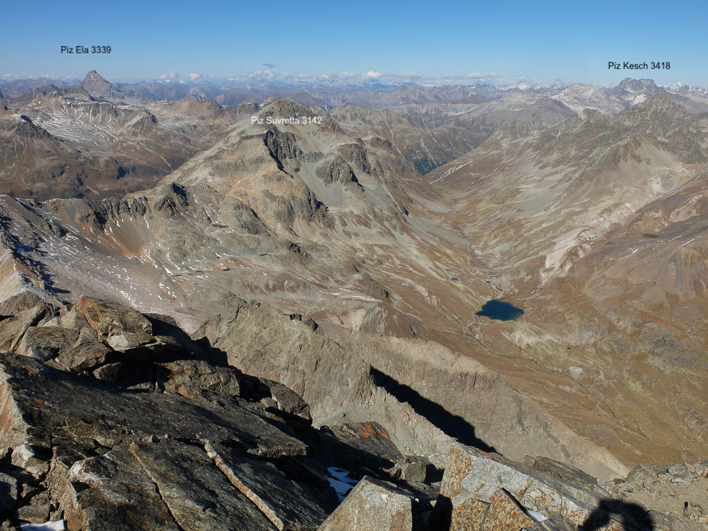 Ein paar Grat weiter Richtung Norden, nochmals Piz Ela, Piz Suvretta mit See und Piz Kesch: