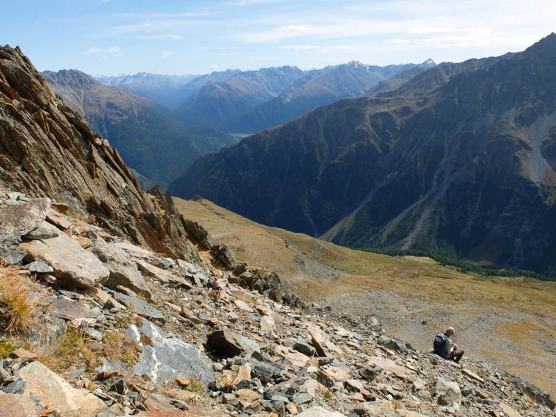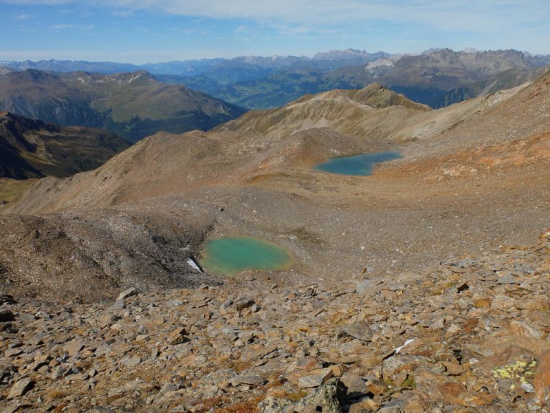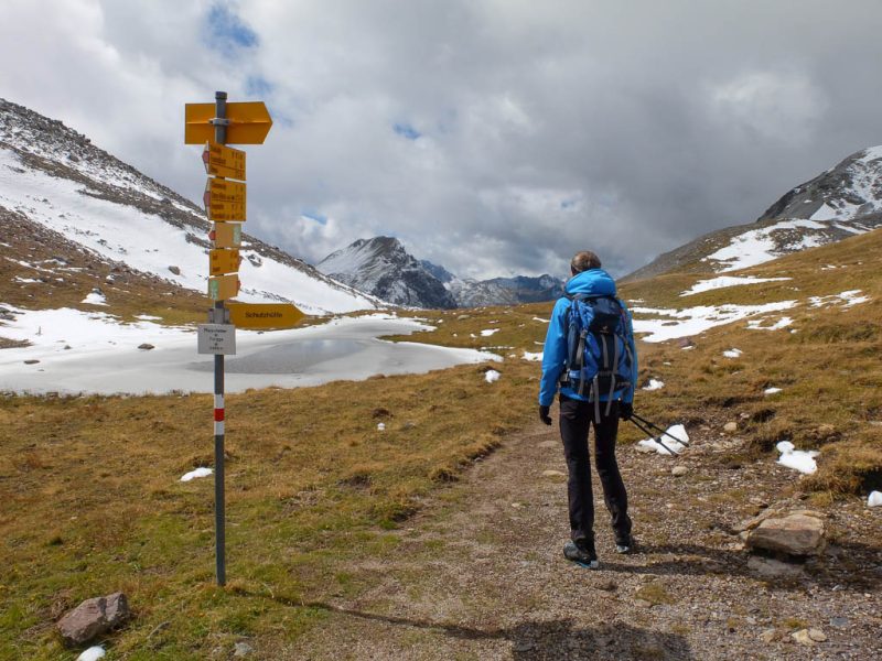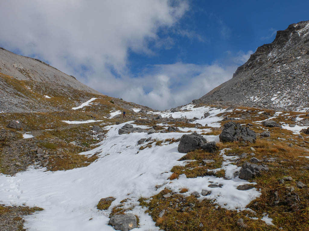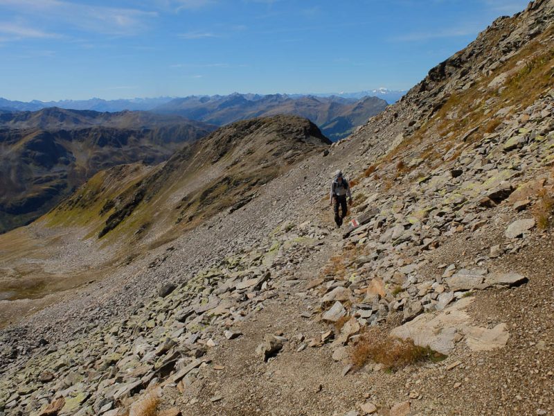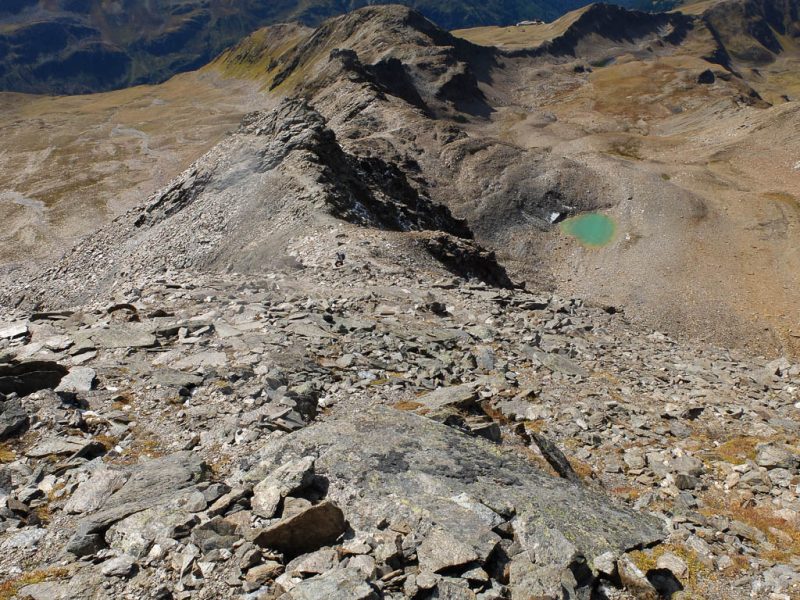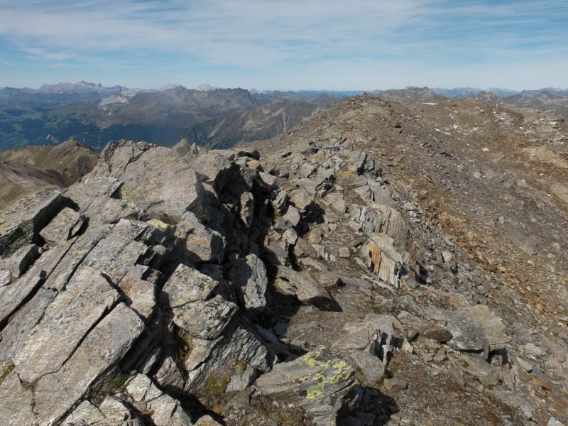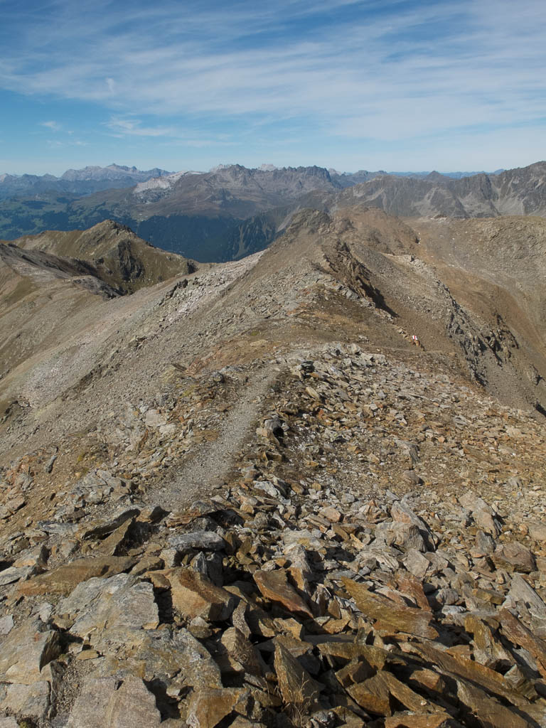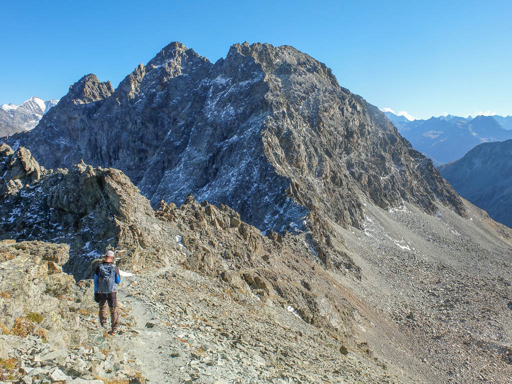 So schön wie es hier oben auch ist, lange können wir nicht verweilen: Der Abstieg über den Grat braucht genau wie der Aufstieg seine Zeit und laut Tourenplaner können wir in Champfer, unserem Zielort, gerade noch so den letzten Bus Richtung Schmitten erreichen. So und ähnlich spannend und abwechslungsreich geht es hinunter:
