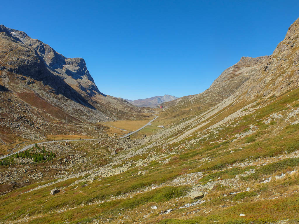 Wir sind heute früher als üblich startklar und so können wir ein Gipfelziel anvisieren, das schon lange auf unserer Wunschliste steht, nämlich den 3380 Meter hohen Piz Güglia bzw. Piz Julier. Der Piz Julier ist die höchste Erhebung in weitem Umkreis und soll dank seiner isolierten Lage eine weite Aussicht über das Oberengadin bieten. Die meisten Gipfelstürmer reisen mit dem Auto an und starten von der an der Julierpassstraße gelegenen „Chamanna dal Stradin“ Richtung Gipfel. Reist man wie wir mit dem Bus an, startet man von der Bushaltestelle „Alp Güglia“ aus und läuft gut einen guten Kilometer bis zur Chamanna dal Stradin der Straße entlang. Das ist kein Vergnügen, aber die Strecke lässt sich Gott sei Dank weglos abkürzen. Bis zum Gipfel sind es von der Chamanna dal Stradin aus „nur“ 1200 Höhenmeter, die es aber in sich haben. Da wir darauf angewiesen sind, mit Hilfe öffentlicher Verkehrsmittel wieder zurück nach Hause zu kommen, laufen wir recht zügig los. Ein Blick zu Beginn der Tour auf die Julierpassstraße und das auf der Passhöhe stehende Juliertheater: