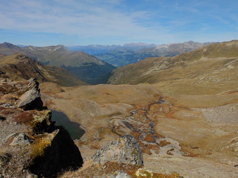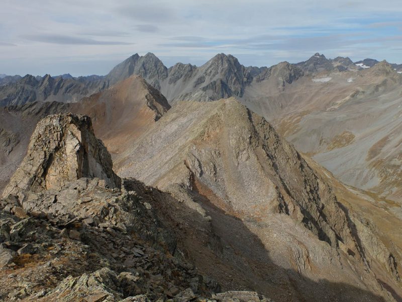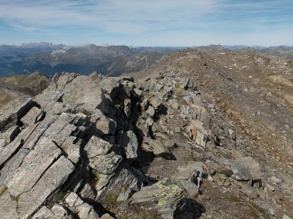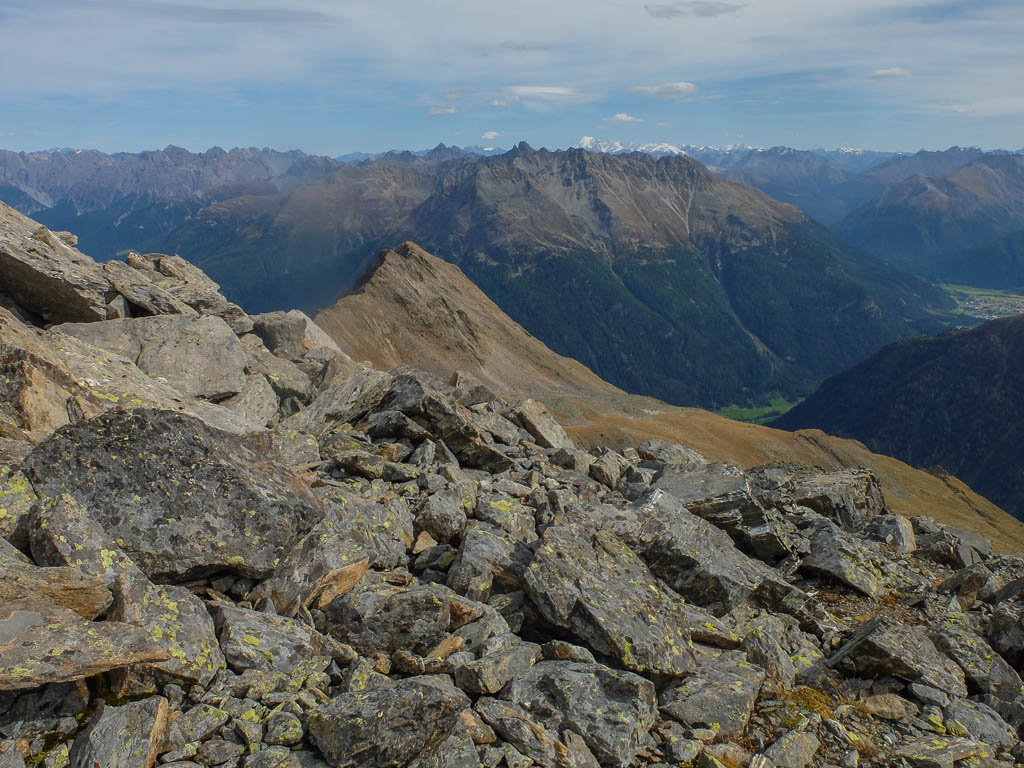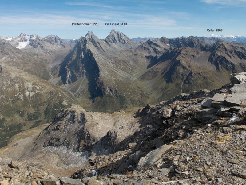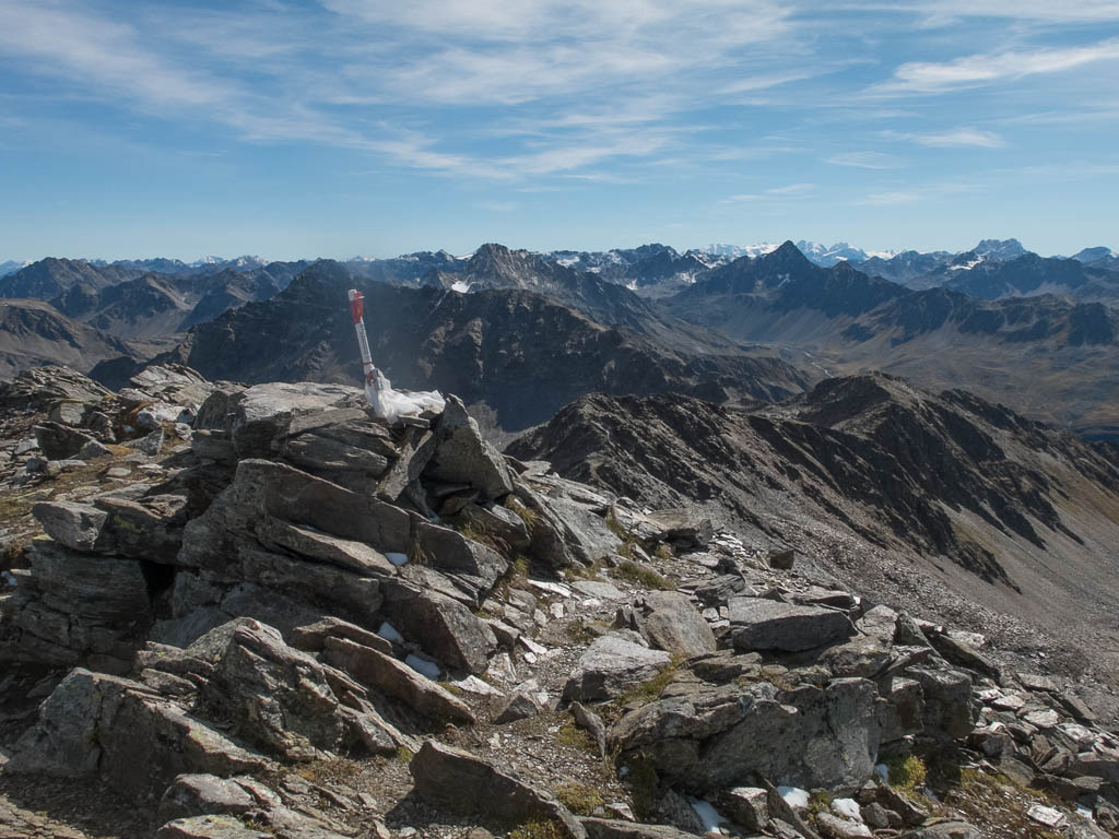 Der Gipfel selbst ist unspektakulär, bietet aber eine grandiose Aussicht auf den Ortler, die Bernina-Alpen, Gipfel der Albula-Alpen sowie des Oberhalbsteins und im Norden sind sogar die Churfirsten zu erkennen. Besonders beeindruckend ist der mächtige, im Nordosten liegende Piz Linard: