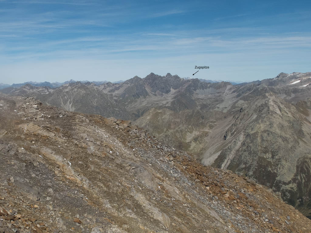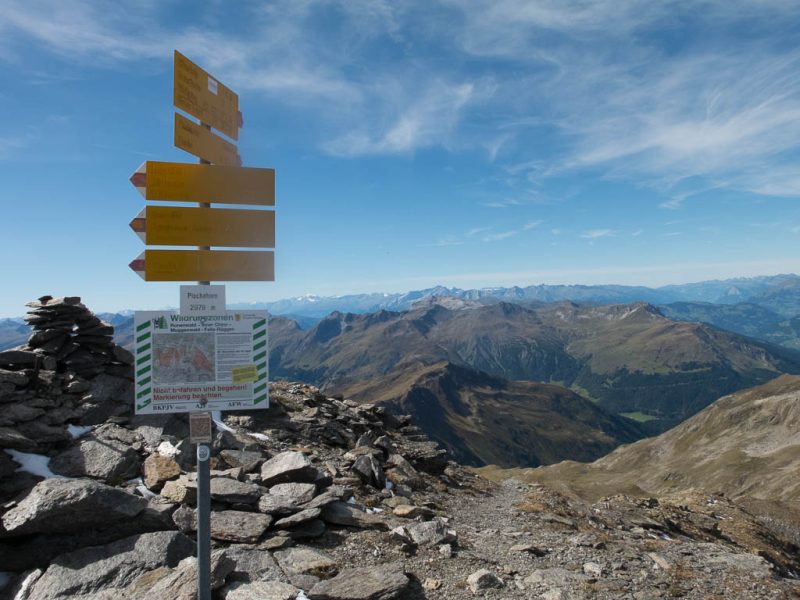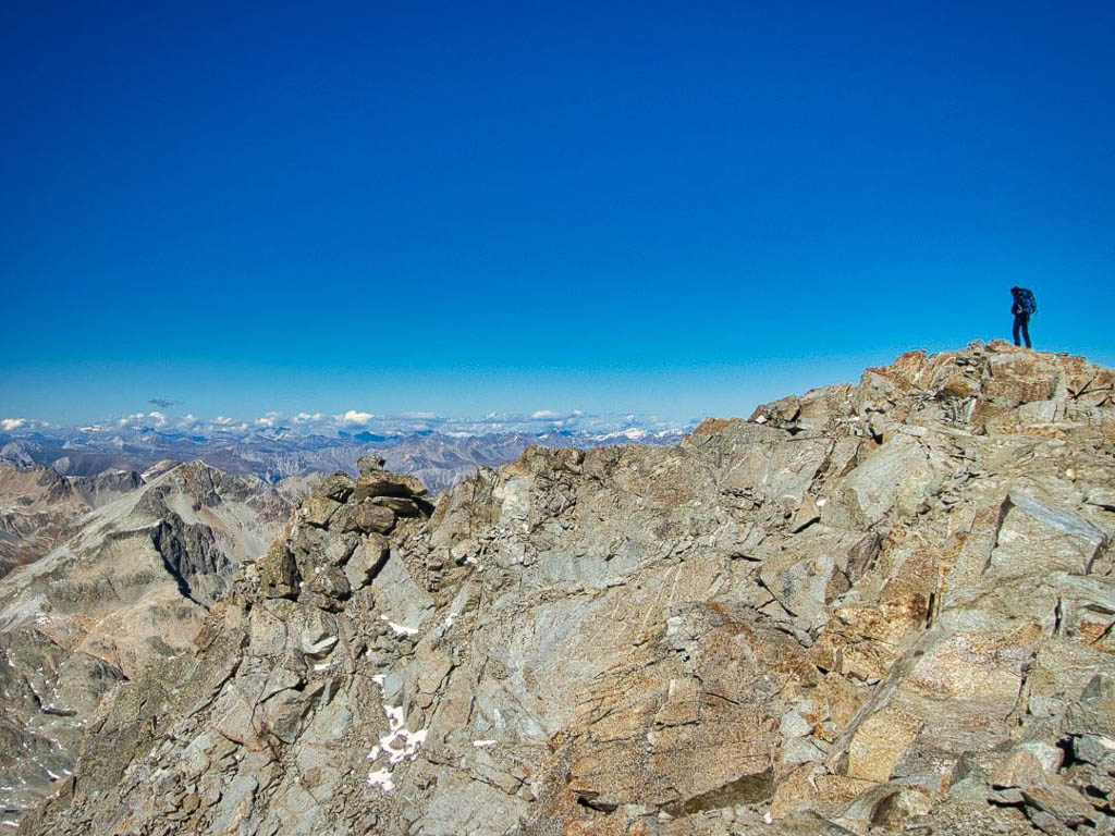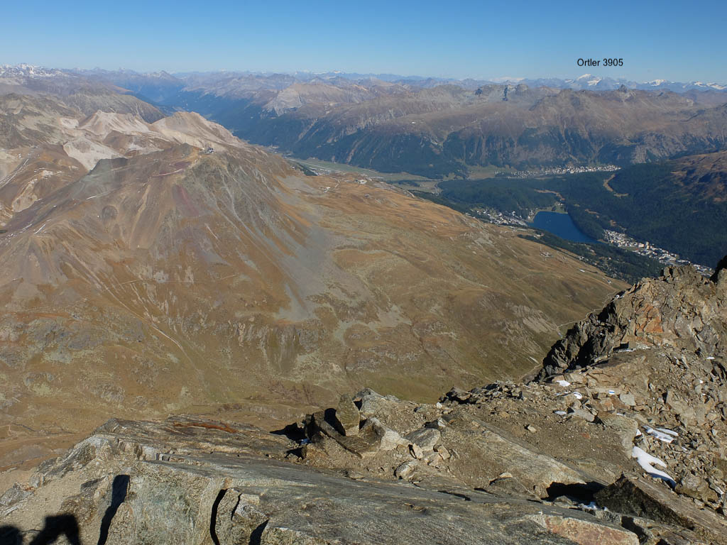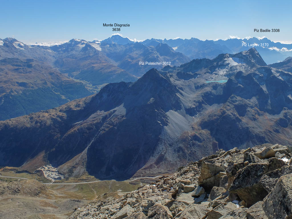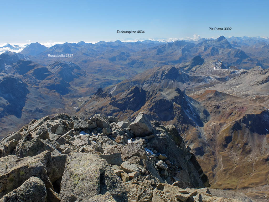 Im Tal ist die Julierpassstraße zu sehen. Roccabella, verschwommen, aber doch sichtbar die Dufourspitze, der höchste Gipfel der Walliser Alpen bzw. der Schweiz und der Piz Platta im Westen:
