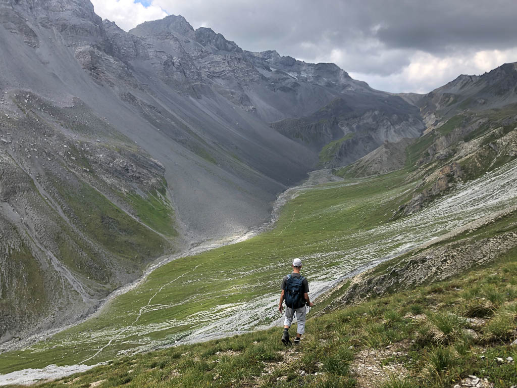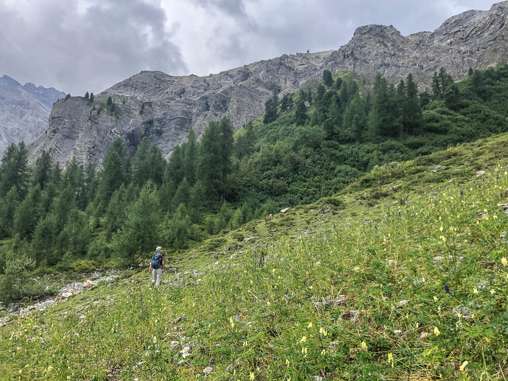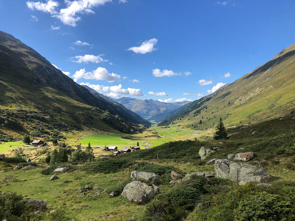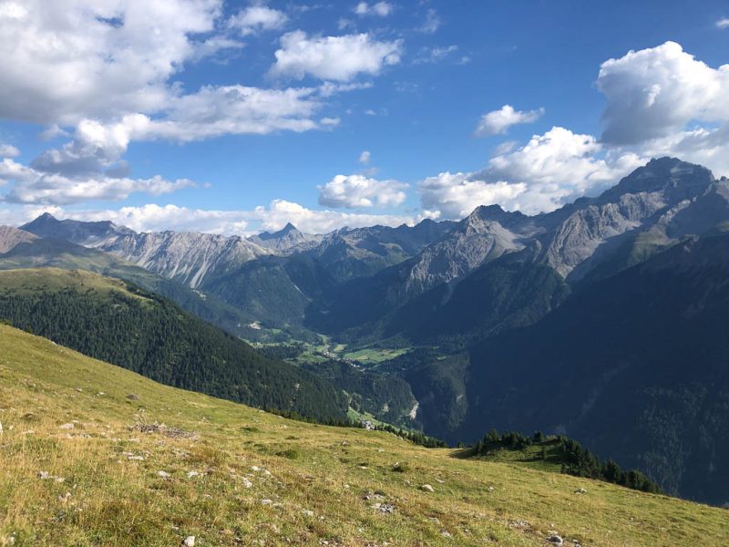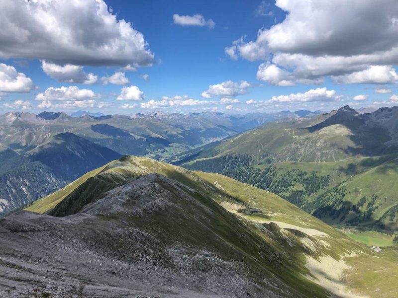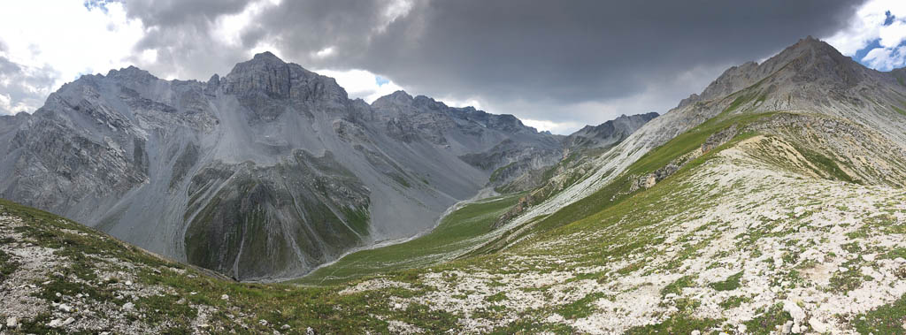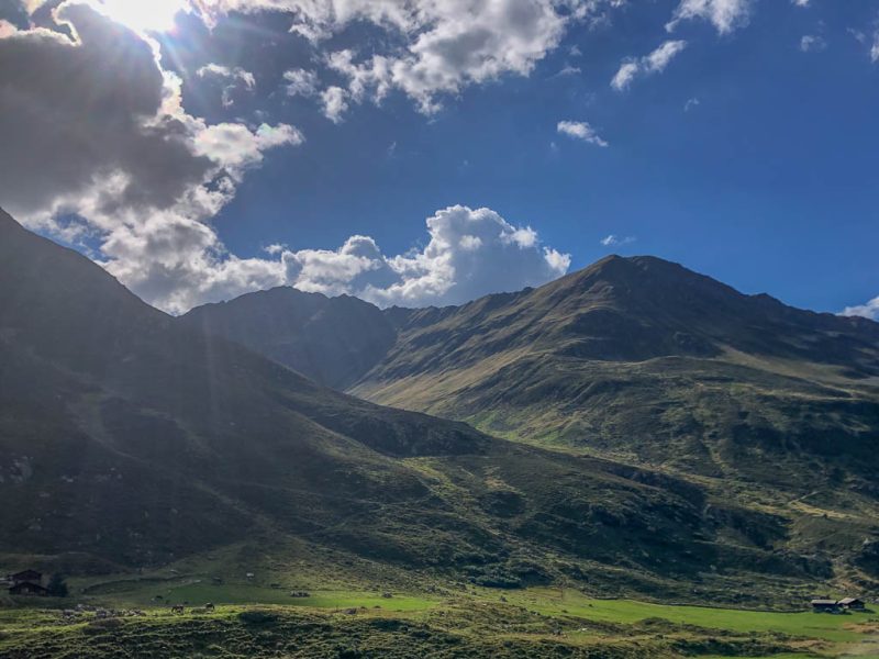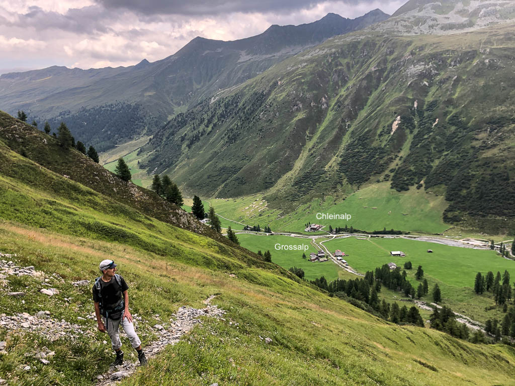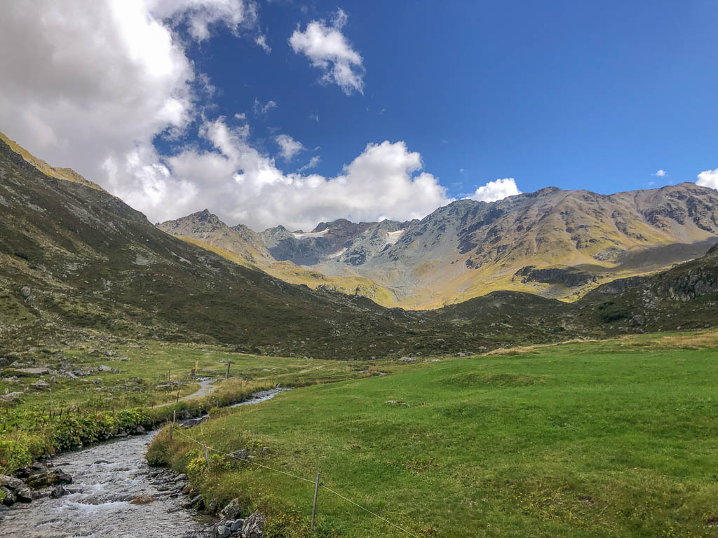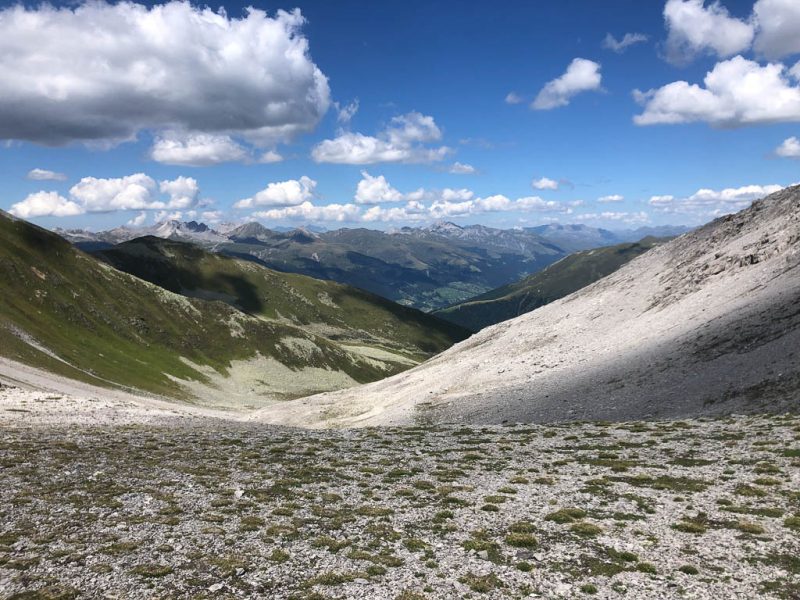 Als Guido mir vorschlägt, nachmittags durch das Dischmatal zu wandern, kann ich daher nicht Nein sagen, obwohl ich meinem Knie eigentlich noch einen Tag Pause gönnen wollte. Aber ich bereue meine Entscheidung nicht, denn die Wanderung ist einfach und wunderschön. Startpunkt der acht Kilometer langen Strecke ist Dürrboden, eine Alp am Ende des Dischmatals. Der Blick von Dürrboden Richtung Talende auf das Scalettahorn und Piz Grialetsch mit den dazugehörigen Gletschern: