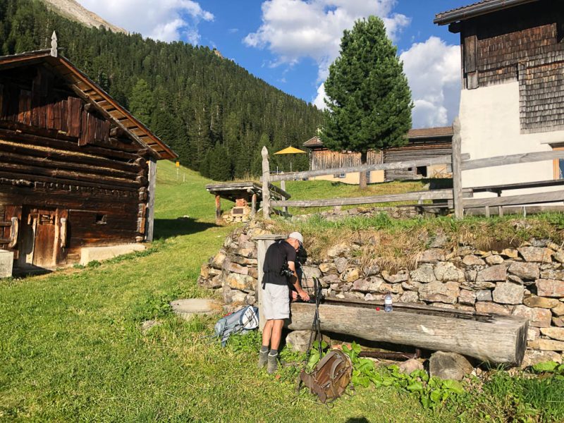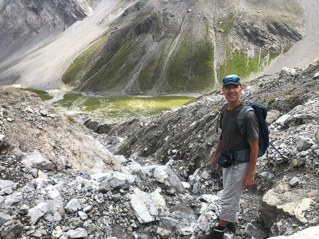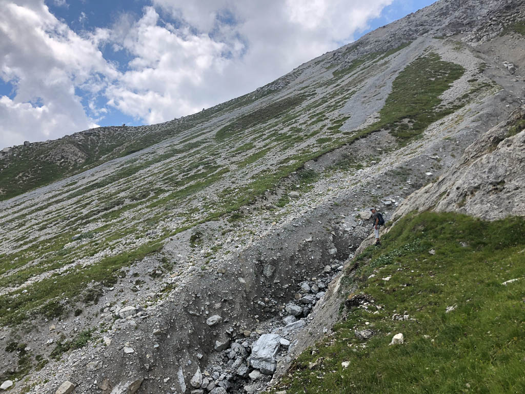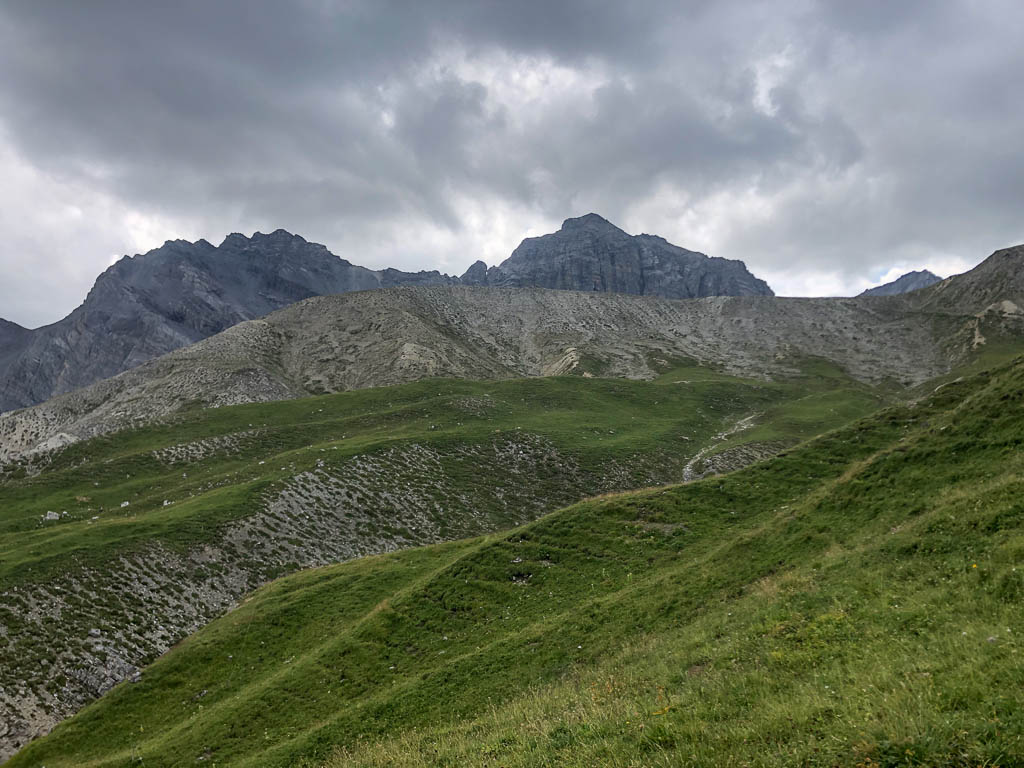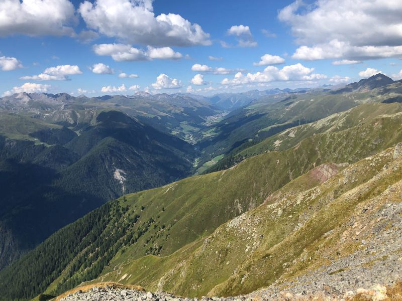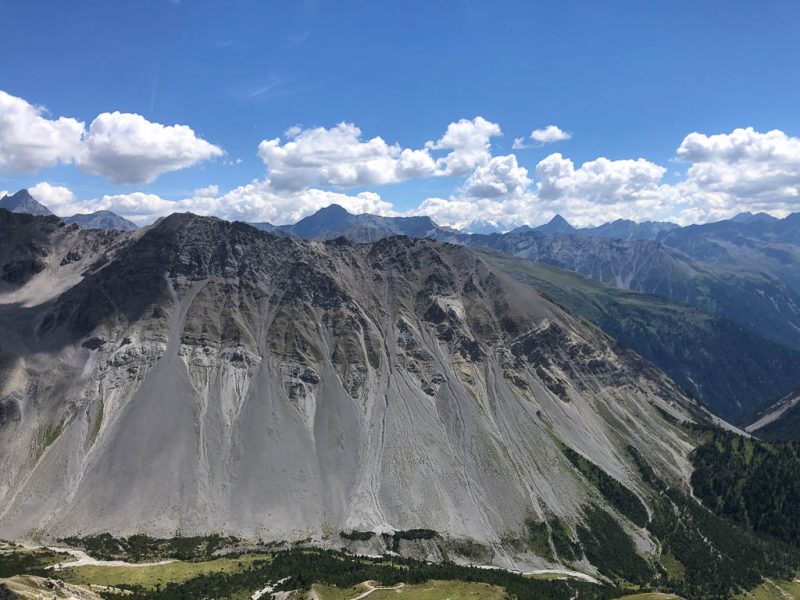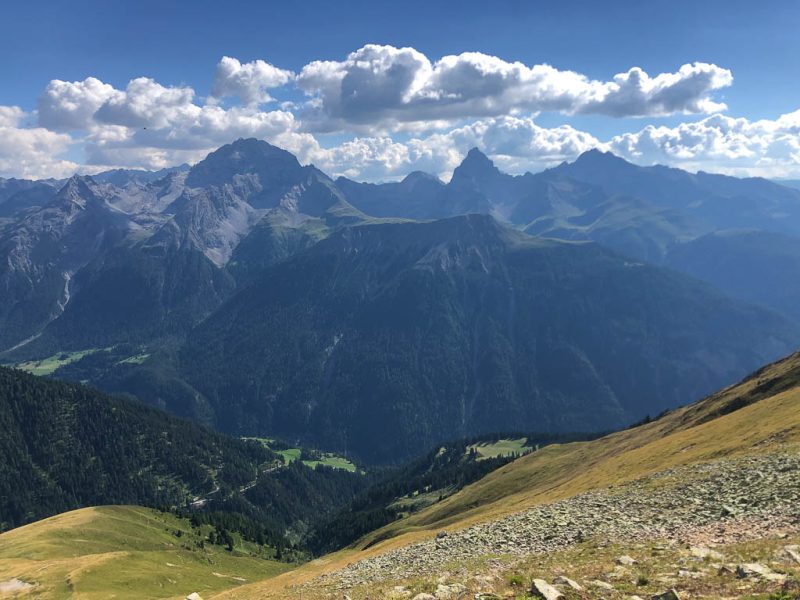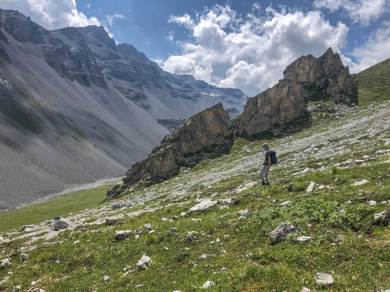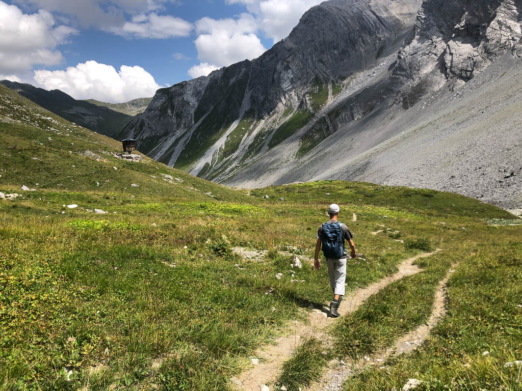 Als Guido mir vorschlägt, nachmittags durch das Dischmatal zu wandern, kann ich daher nicht Nein sagen, obwohl ich meinem Knie eigentlich noch einen Tag Pause gönnen wollte. Aber ich bereue meine Entscheidung nicht, denn die Wanderung ist einfach und wunderschön. Startpunkt der acht Kilometer langen Strecke ist Dürrboden, eine Alp am Ende des Dischmatals. Der Blick von Dürrboden Richtung Talende auf das Scalettahorn und Piz Grialetsch mit den dazugehörigen Gletschern: