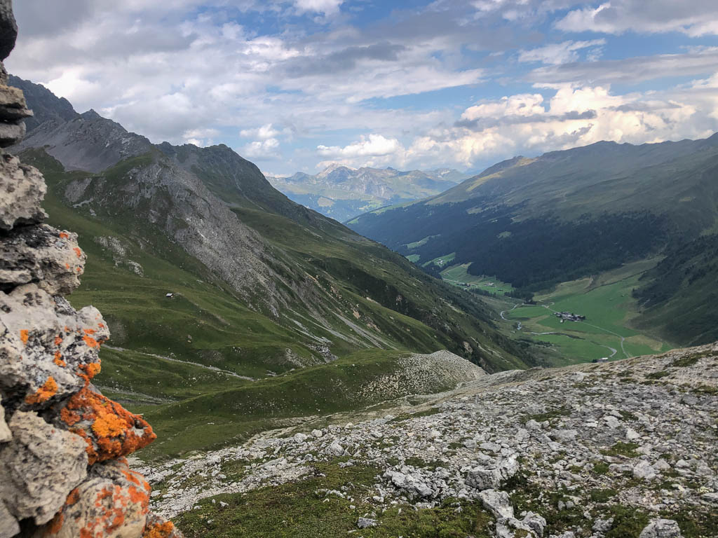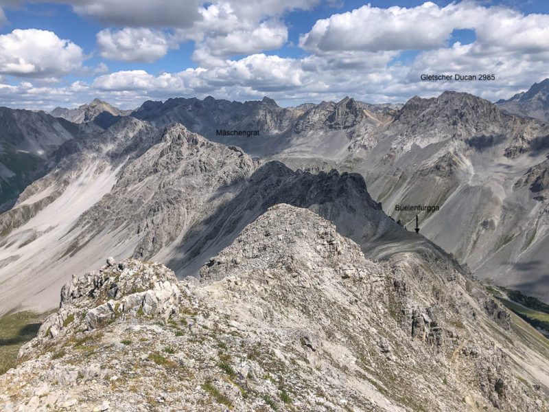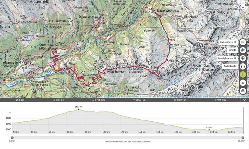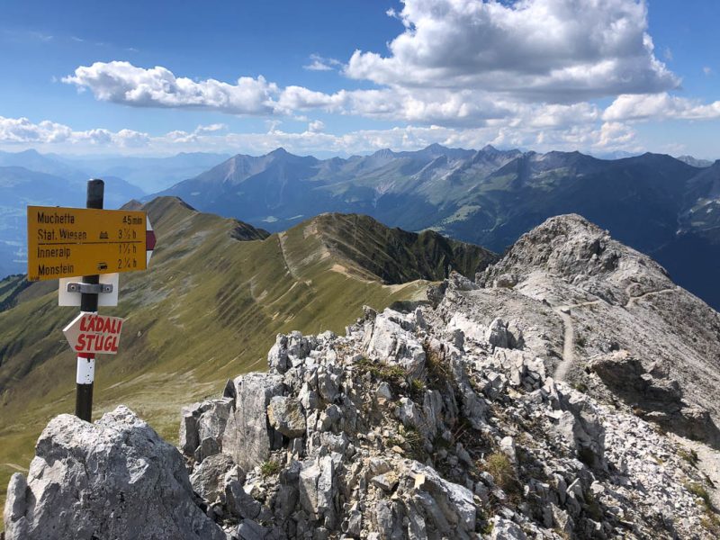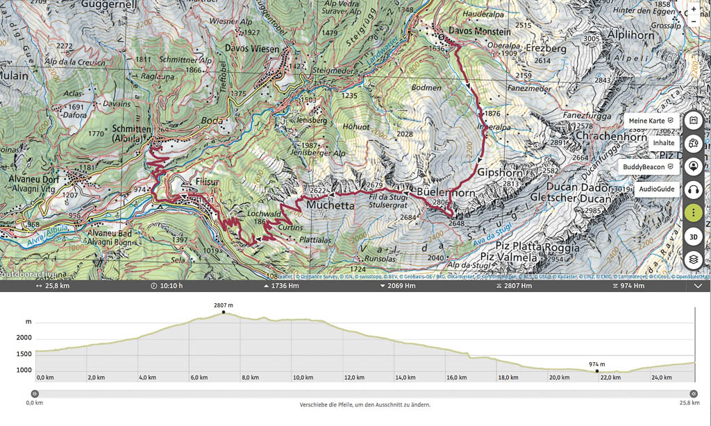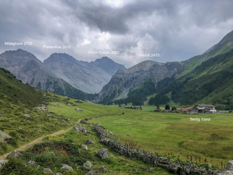 Der Ausgangspunkt der heutigen Tour ist Monstein, das wir mit Postbussen erreichen. Das erste Gipfelziel ist das Büelenhorn, danach wollen wir weiter über den Stulsergrat zum Muchetta. Auf dem Büelenhorn waren wir zum ersten Mal am 9. Juli 2021. Damit es uns nicht langweilig wird, gehen wir heute nicht über den Normalweg hoch, sondern verlassen diesen auf etwa 2400 Höhenmetern und steigen zur Büelenfurgga auf. Im SAC-Führer „Bündner Alpen 6“ steht über den Normalweg: