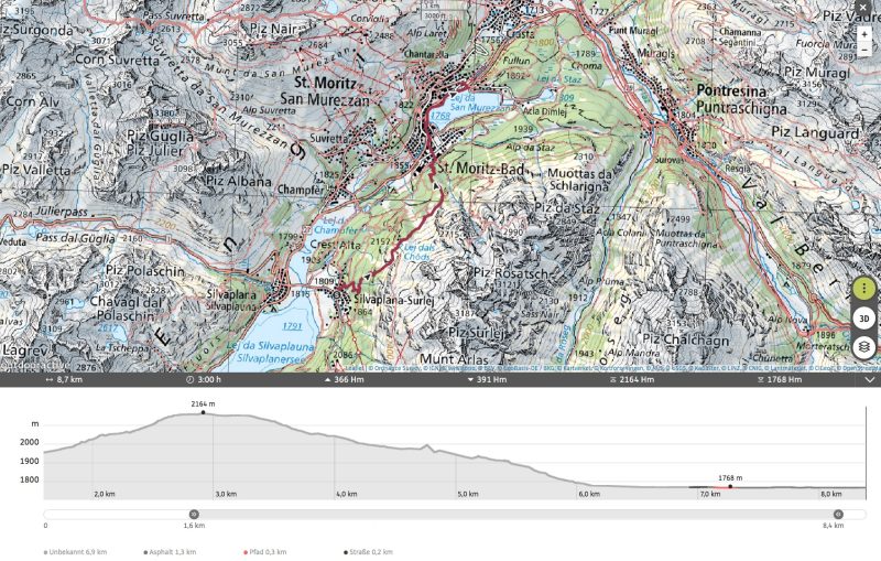 Das Fazit der Wanderung: Es ist eine wunderschöner, von Arven und Tannen gesäumter Weg mit herrlichen Aussichten über Silvaplaner, Silser und St. Moritzer See, der das Prädikat „sehr empfehlenswert“ verdient hat. Für mein Knie war die Wanderung eine ziemlich Herausforderung, für meine Seele Balsam.