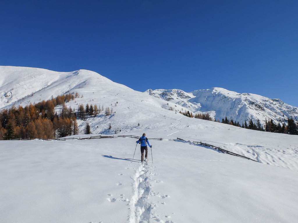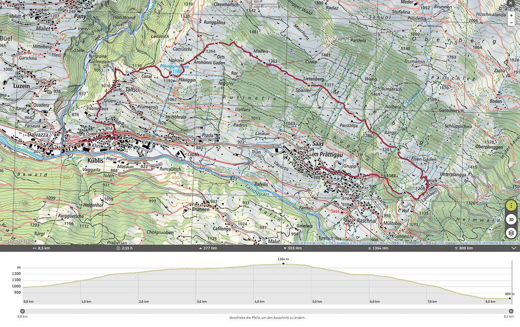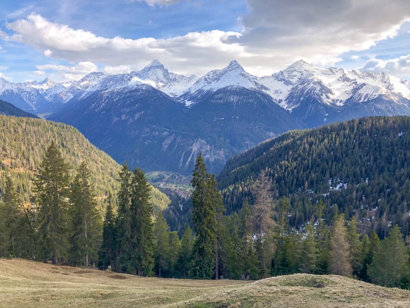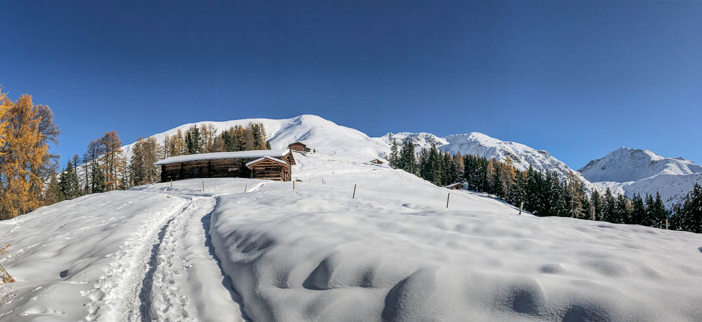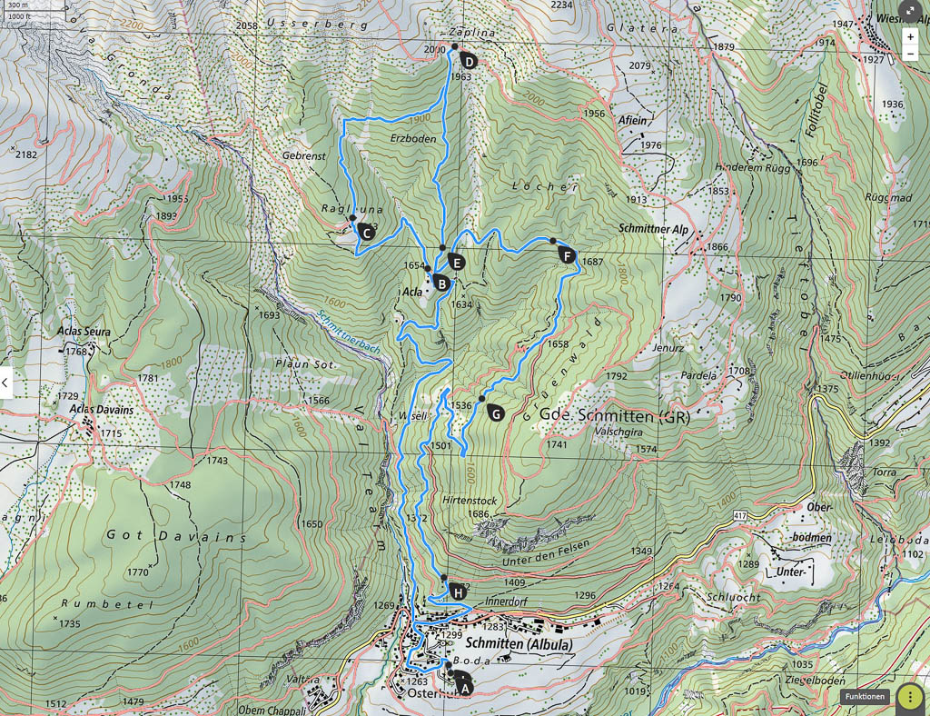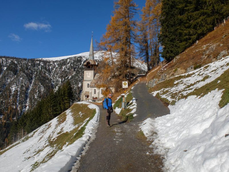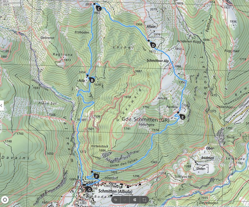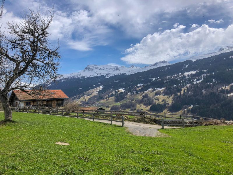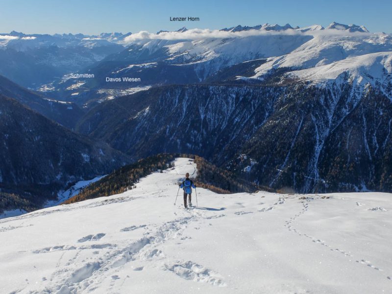 Als Guido um 16 Uhr eine kleinen Spaziergang machen will, mache ich allerdings Schluss mit der Arbeit. Nochmals eine kleine Runde an der frischen Luft zu drehen, ist reizvoller. So klein, ist die Runde, die wir drehen, dann aber gar nicht: Wir steigen über Acla und Raglauna nach Zaplina auf. Auf der gut fünf Kilometer langen Strecke sind über 700 Höhenmeter zu überwinden. Zurück laufen wir über den Fahrweg, der Schmitten und die Schmittner Alp verbindet: