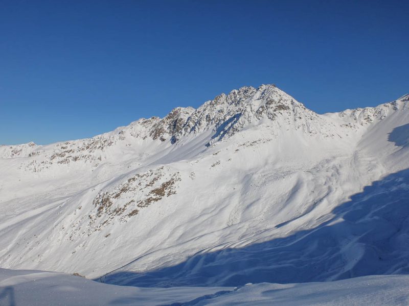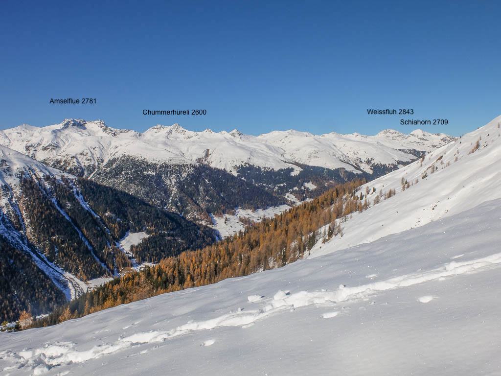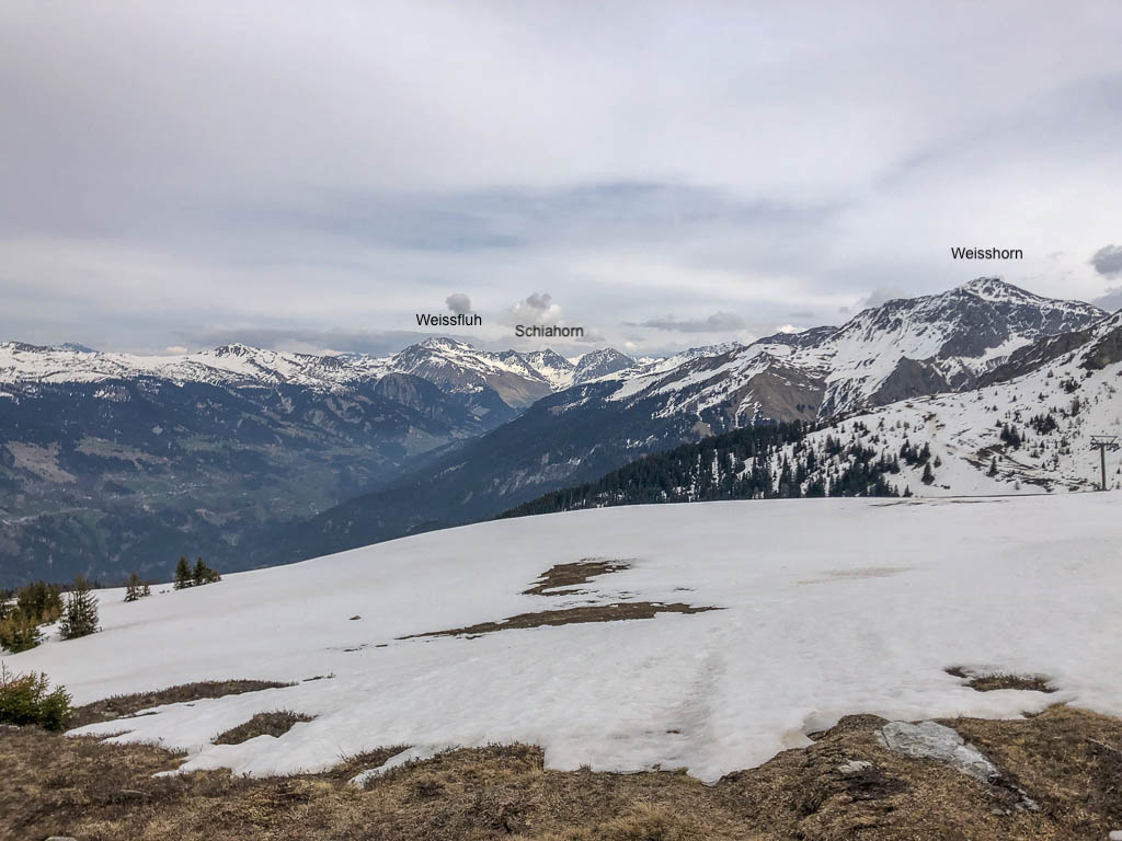 Im Osten der weitere Verlauf des Schanfiggs und zwei Gipfel der Landschaft Davos, Weissfluh und Schiahorn:
