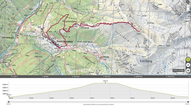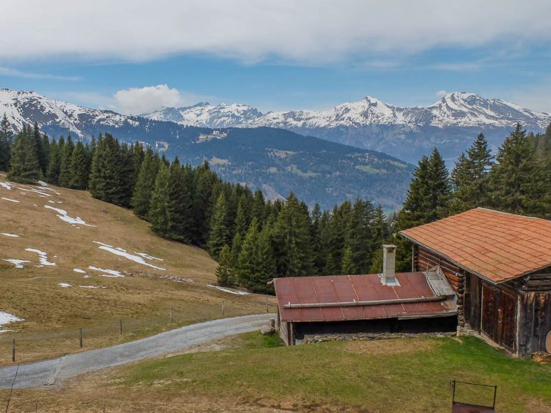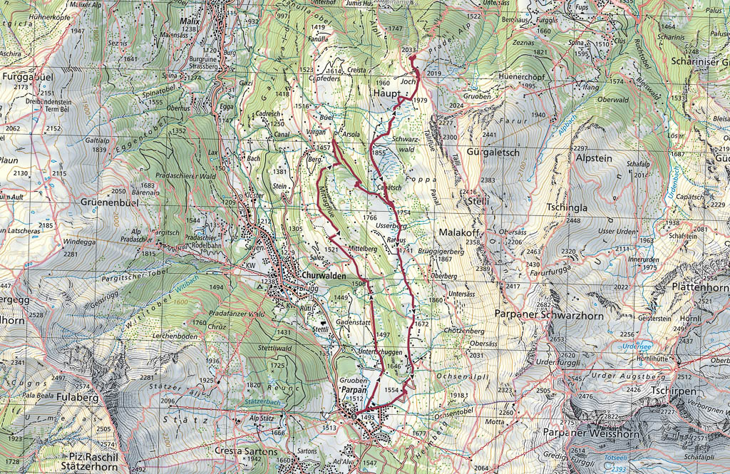 Eine andere Möglichkeit, dem Asphalt zu entgehen, ist der Aufstieg zum Joch von Tschiertschen aus. Dass der Weg, der von Parpan aus aufs Joch führt, asphaltiert ist, ist eigentlich kein Wunder: Rechts und links des Weges liegen zahlreichen Häuser. Es ist kaum anzunehmen, dass deren Eigentümer zu Fuß hier herauf kommen.