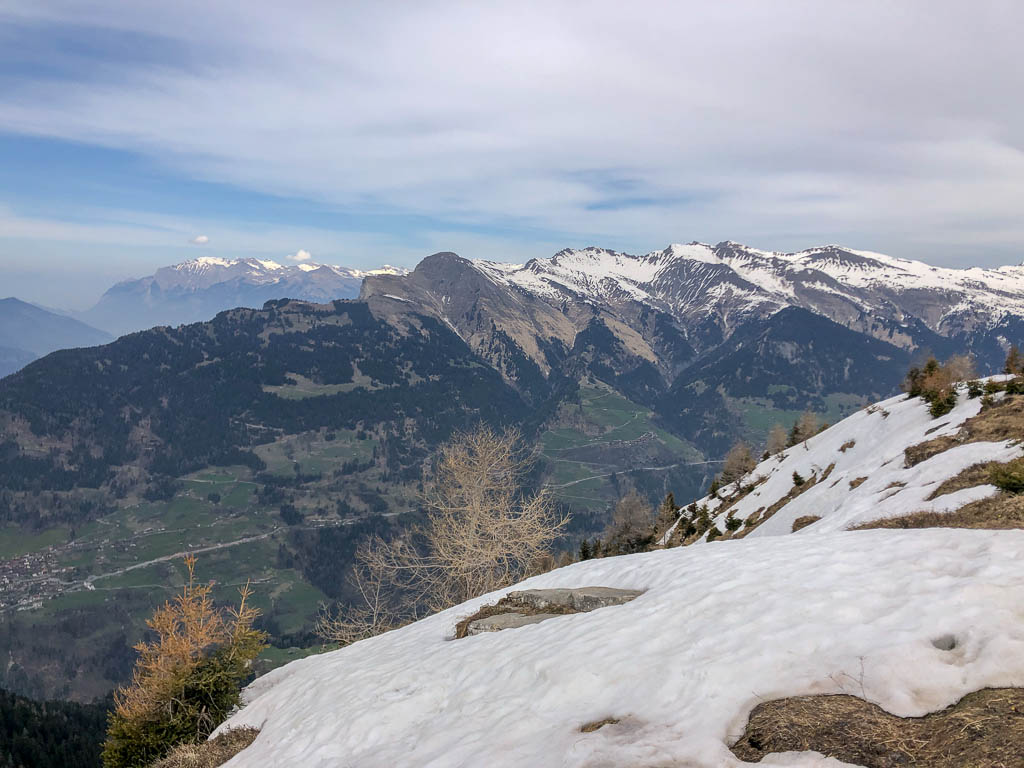 Schlussendlich hat sich der Aufstieg dann doch gelohnt, denn das vor uns liegende Panorama ist beeindruckend. Richtung Nordwesten liegen Ringelspitz, das Calandamassiv mit Felsenberg-Calanda und Haldensteiner-Calanda und im Tal Chur, die Hauptstadt Graubündens, vor uns: