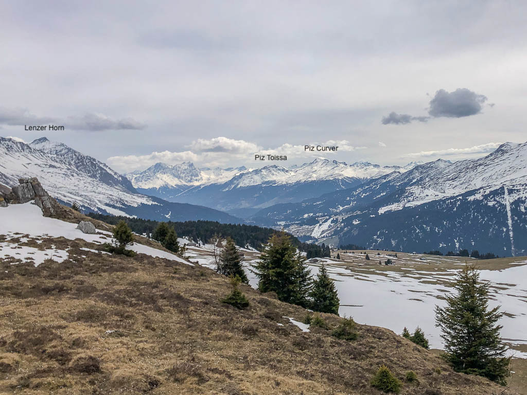 Richtung Südwesten fällt der Blick unter anderem auf das Lenzer Horn, Piz Toissa, Piz Curvér und Gipfel der Stätzer Horn-Kette: