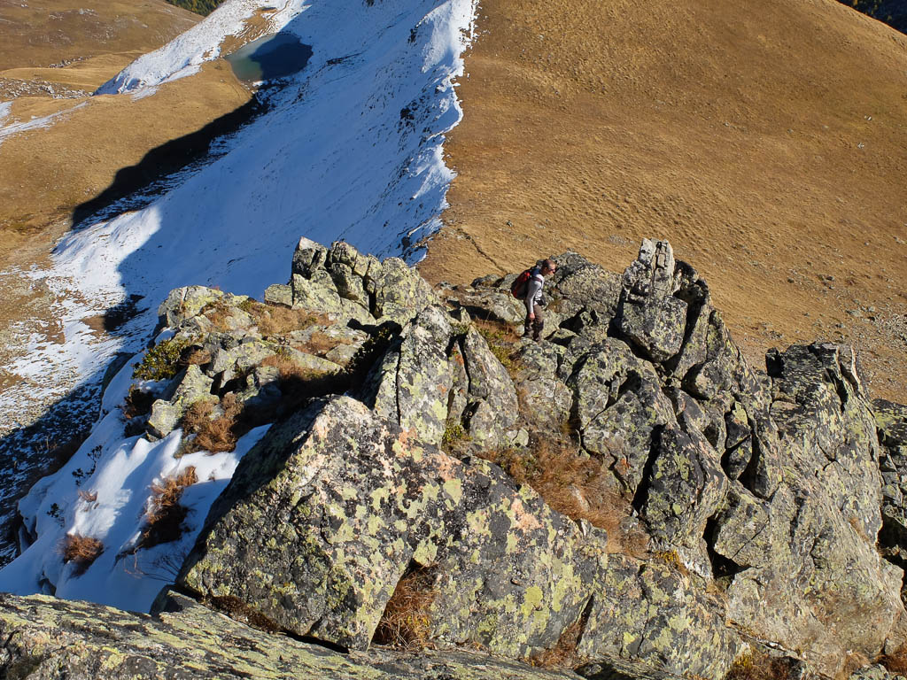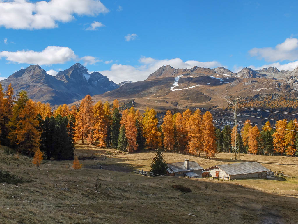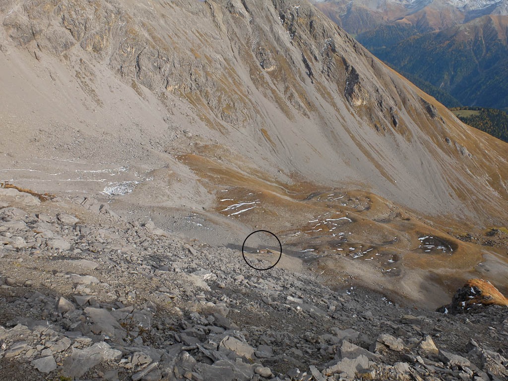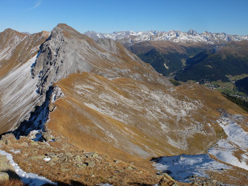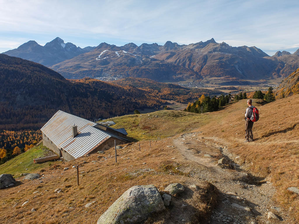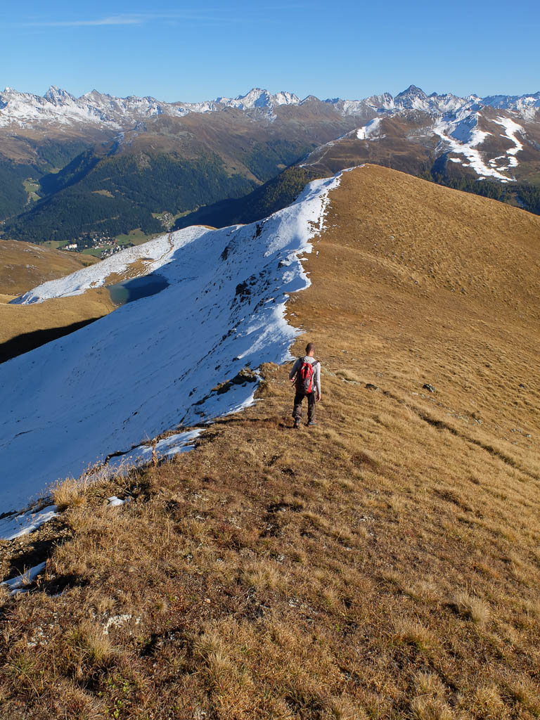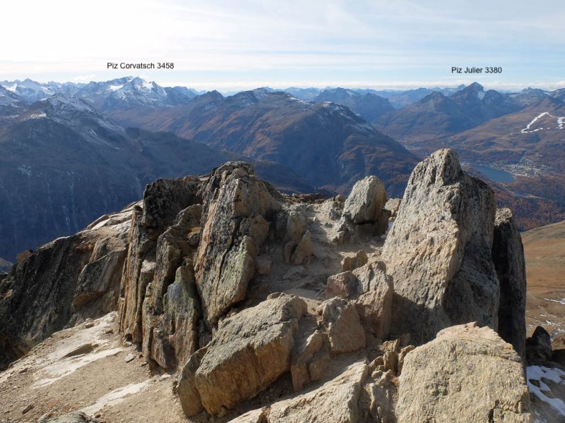 Wir halten uns nicht nur aus Zeitgründen nicht allzu lange auf dem Gipfel auf: Hier bläst der Wind noch stärker und kälter als während des Aufstiegs. Kein Wunder, dass außer uns beiden niemand hier oben ist. Aber die Kälte nehmen wir gerne in Kauf, wenn wir bedenken, was im Sommer hier für ein Trubel herrscht. Während des Abstiegs haben wir entweder die Berninagruppe vor Augen oder aber St. Moritz. Wobei der Blick meist zu unseren Füßen geht, um beim zügigen Bergablaufen nicht über die auf dem Weg liegenden Steine zu stolpern: