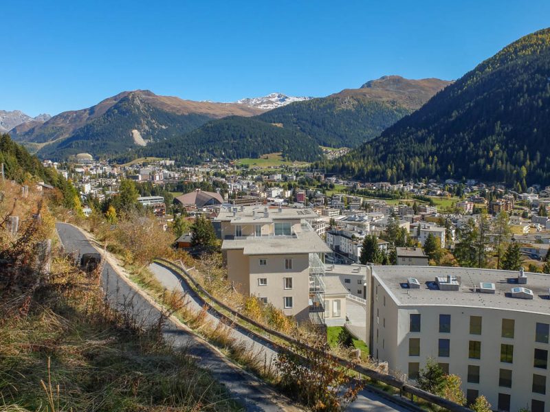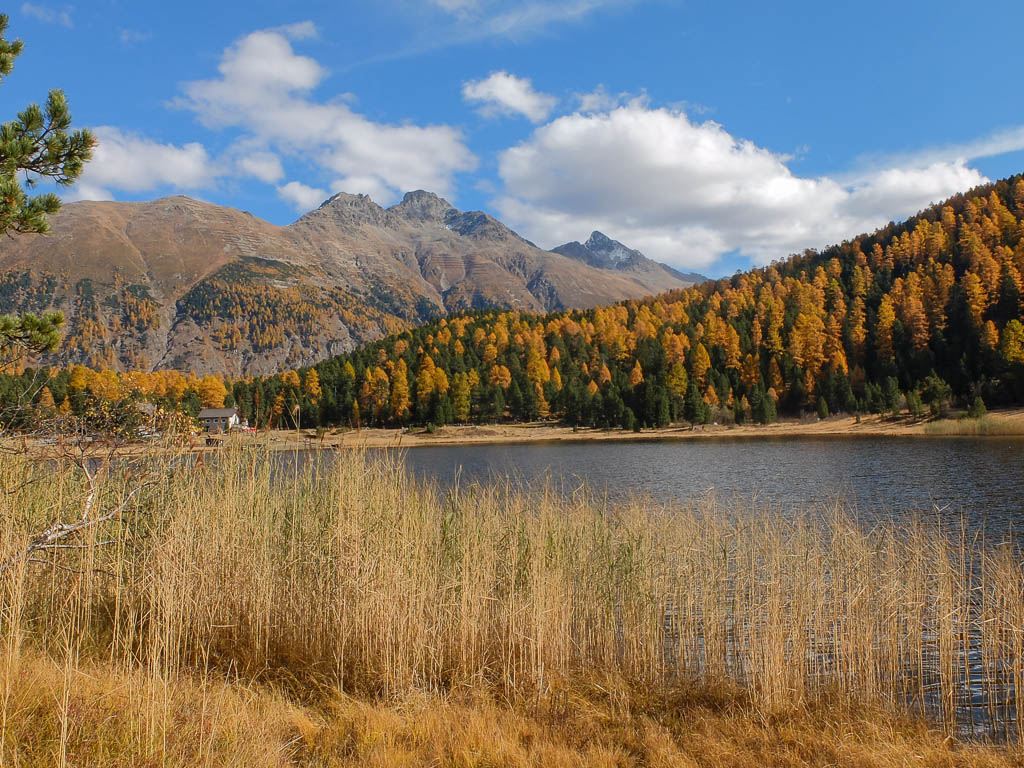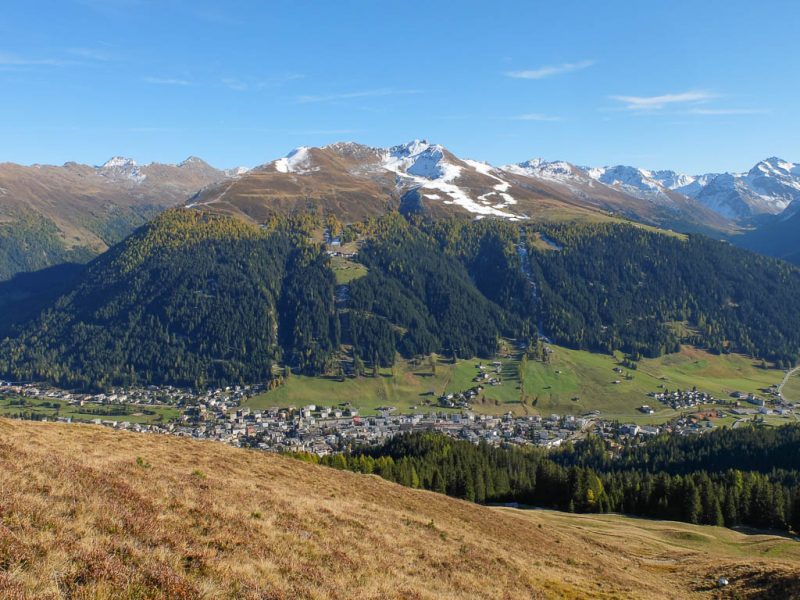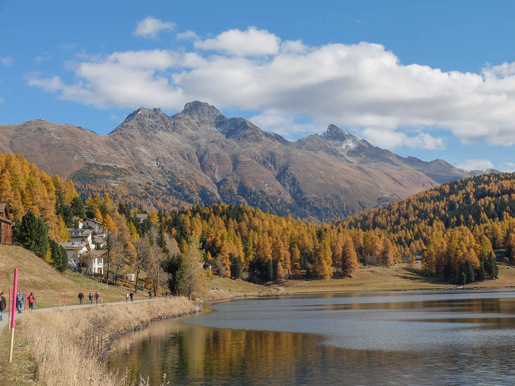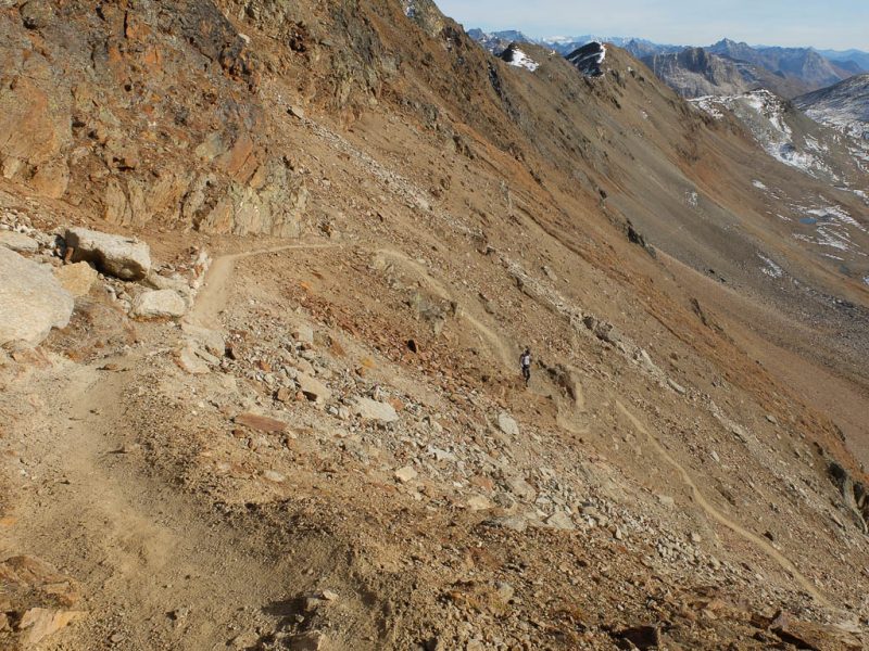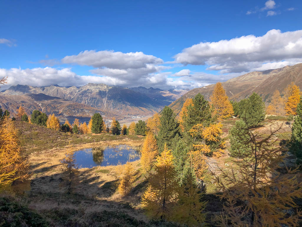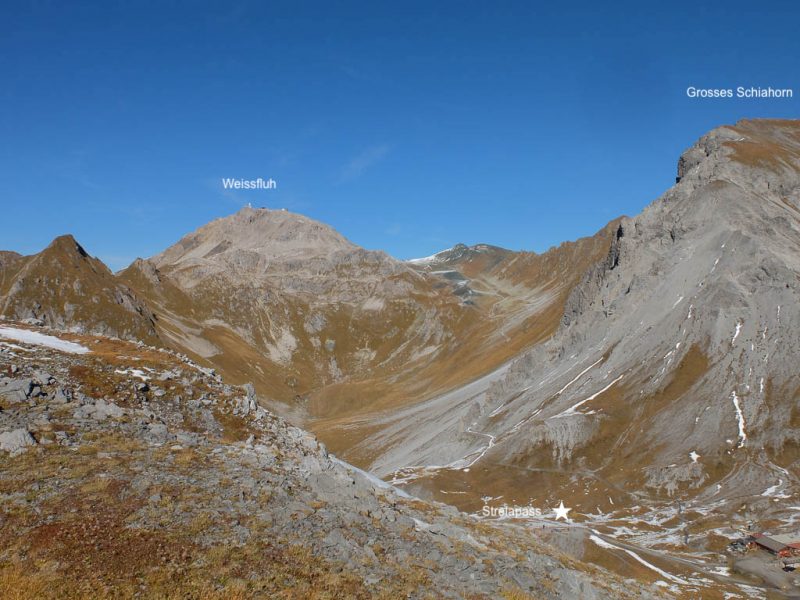 Wir halten uns nicht nur aus Zeitgründen nicht allzu lange auf dem Gipfel auf: Hier bläst der Wind noch stärker und kälter als während des Aufstiegs. Kein Wunder, dass außer uns beiden niemand hier oben ist. Aber die Kälte nehmen wir gerne in Kauf, wenn wir bedenken, was im Sommer hier für ein Trubel herrscht. Während des Abstiegs haben wir entweder die Berninagruppe vor Augen oder aber St. Moritz. Wobei der Blick meist zu unseren Füßen geht, um beim zügigen Bergablaufen nicht über die auf dem Weg liegenden Steine zu stolpern: