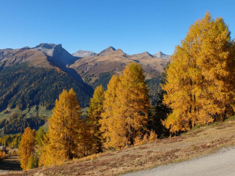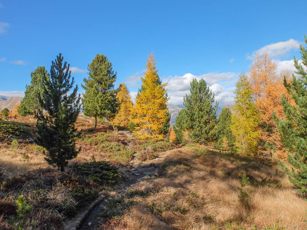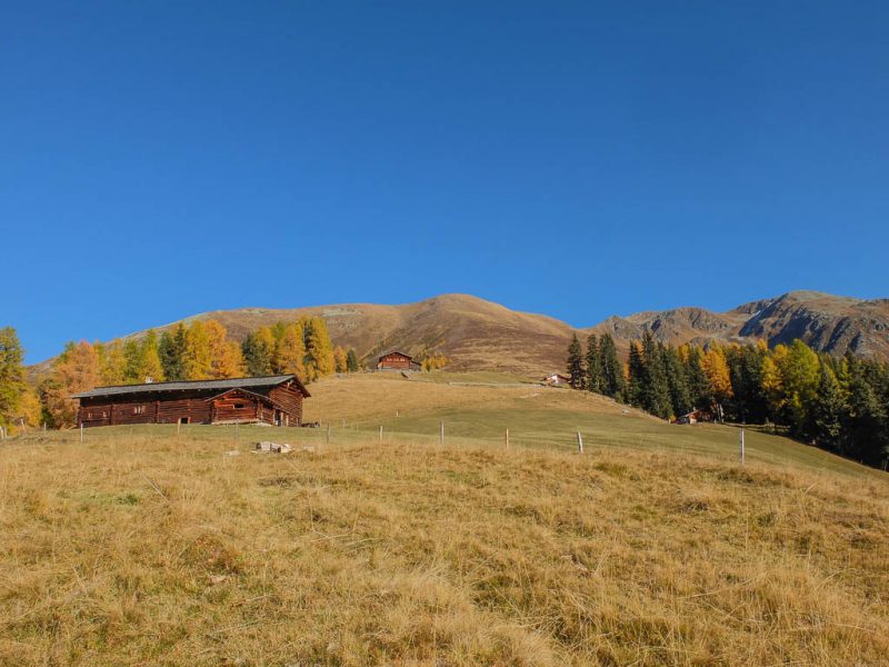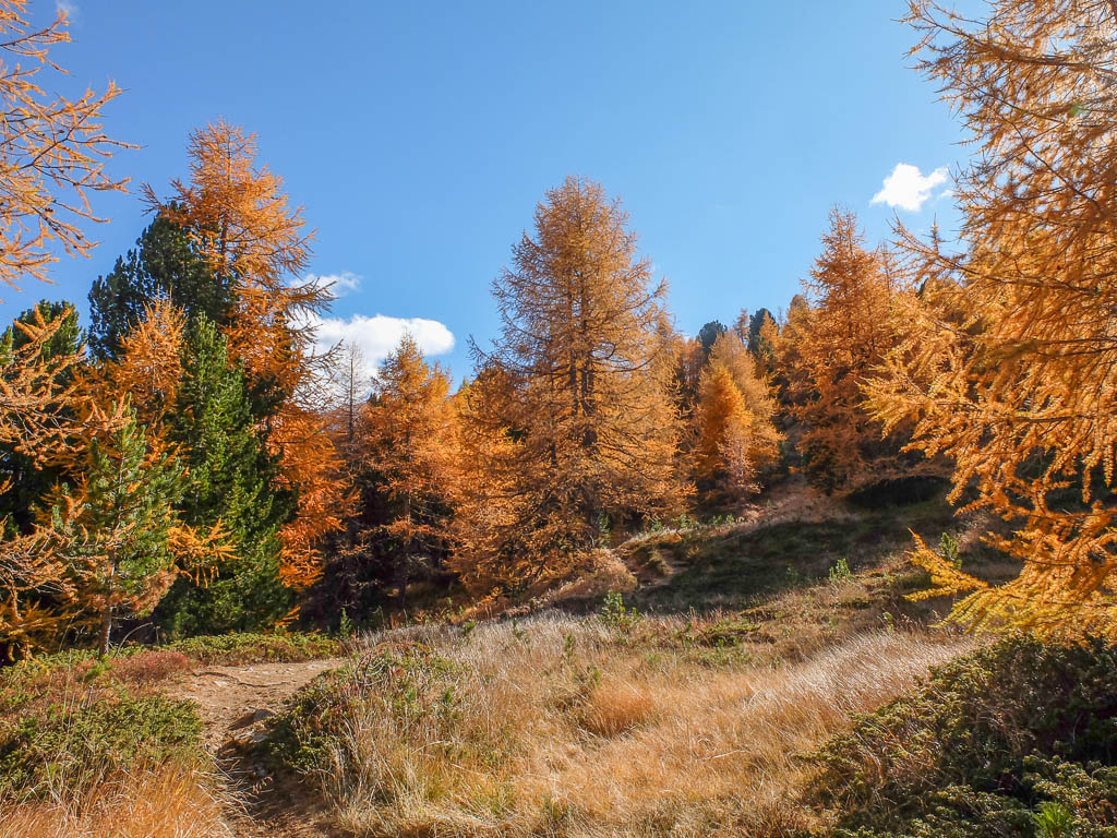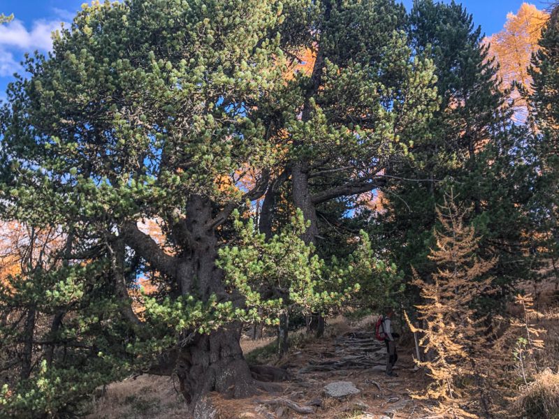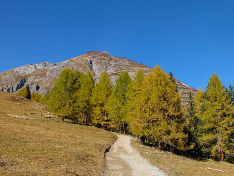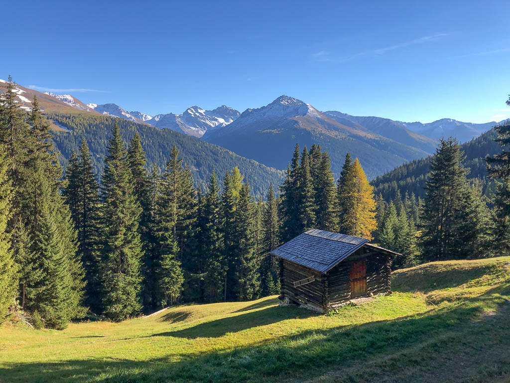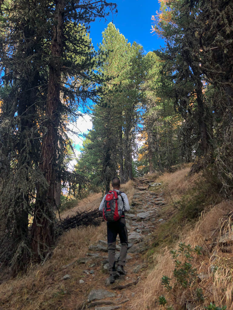 Für Auf- und Abstieg benötigt man laut Tourenplaner bei „normalen“ Wandertempo rund sieben Stunden. Wir wollen jedoch deutlich schneller unterwegs sein, damit wir um 19 Uhr wieder zu Hause sein können. Für die ersten 600 Höhenmeter bis hinauf zu den Weiden der Alp Languard, die durch einen wunderschönen Nadelmischwald führen, benötigen wir gerade einmal 45 Minuten: