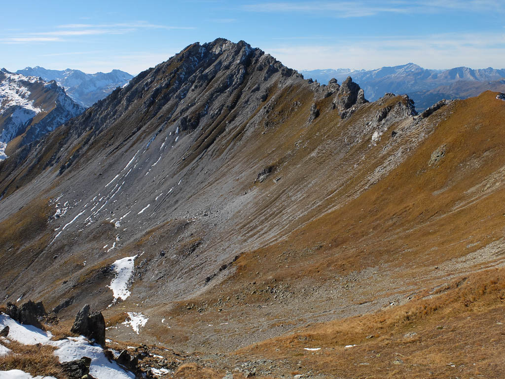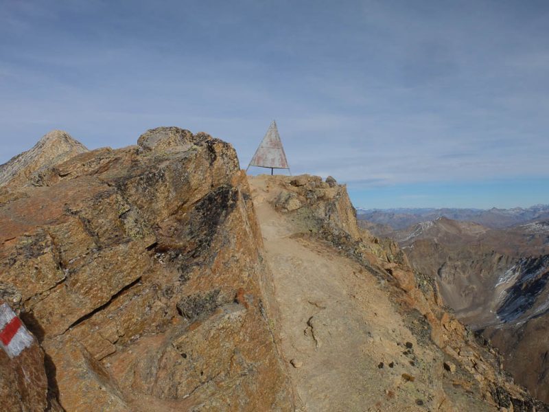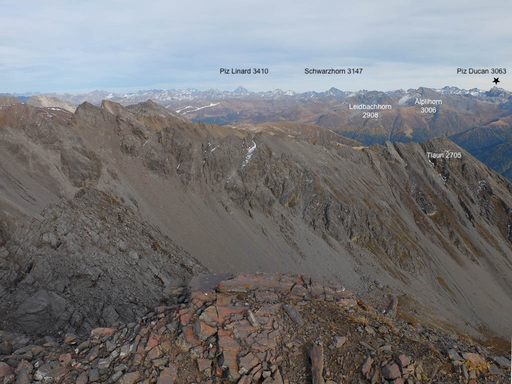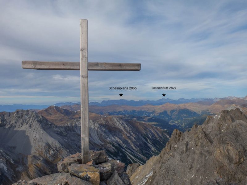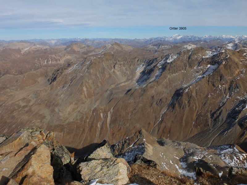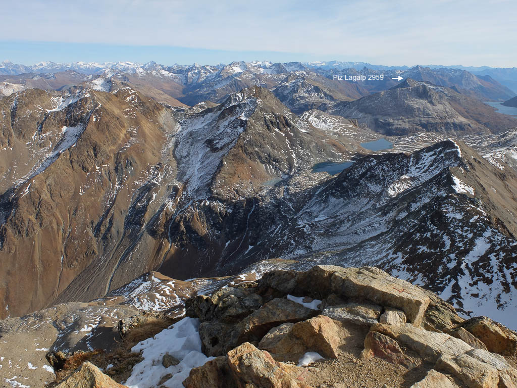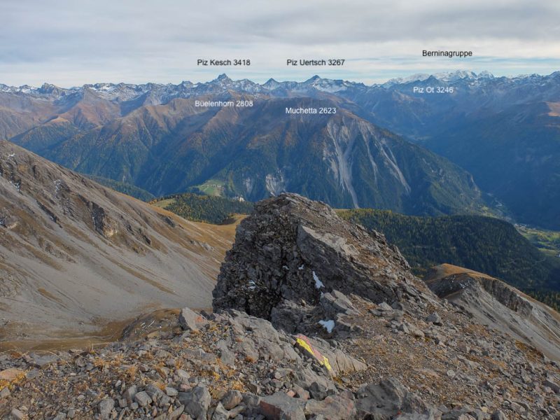 Die im Bild zu sehende Pyramide steht zentrisch über einem Vermessungspunkt und dient der Signalisation des Messpunktes. Dadurch kann dieser von allen Seiten für die trigonometrische Positionsbestimmung angezielt werden. Die Aussicht vom Gipfel ist grandios, allerdings sind mir die wenigsten der zu sehenden Berge namentlich bekannt. Richtung Osten erkenne ich immerhin den Ortler, im Südosten den Piz Lagalp: