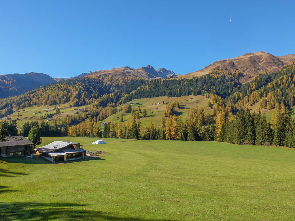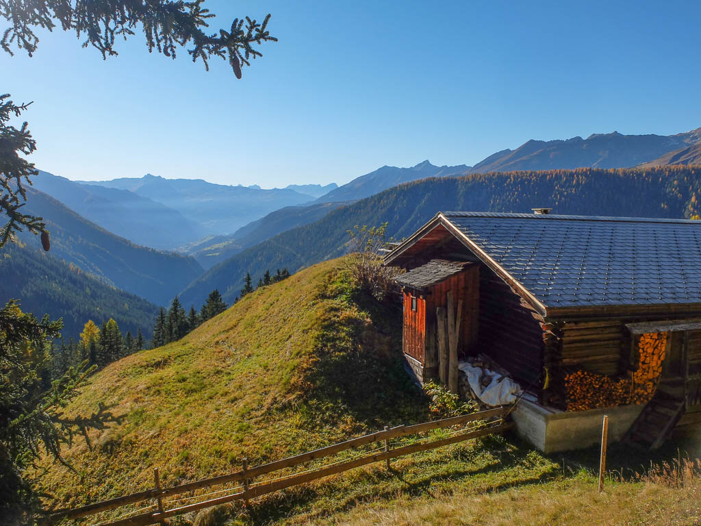 Hier nochmals die Berninagruppe, dieses Mal etwas weiter westlich, auf dem Bild ist außerdem Georgys Hütte zu sehen: