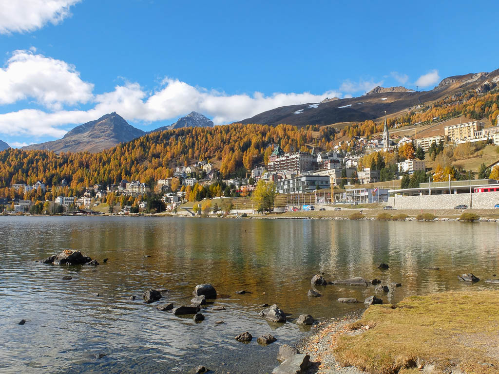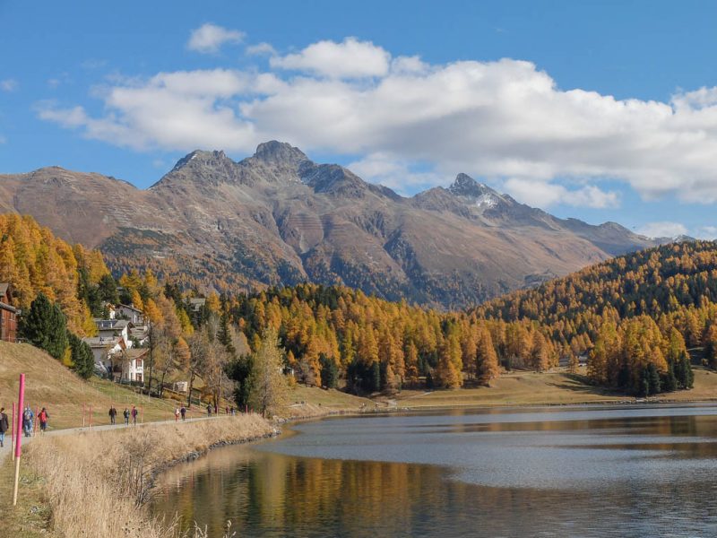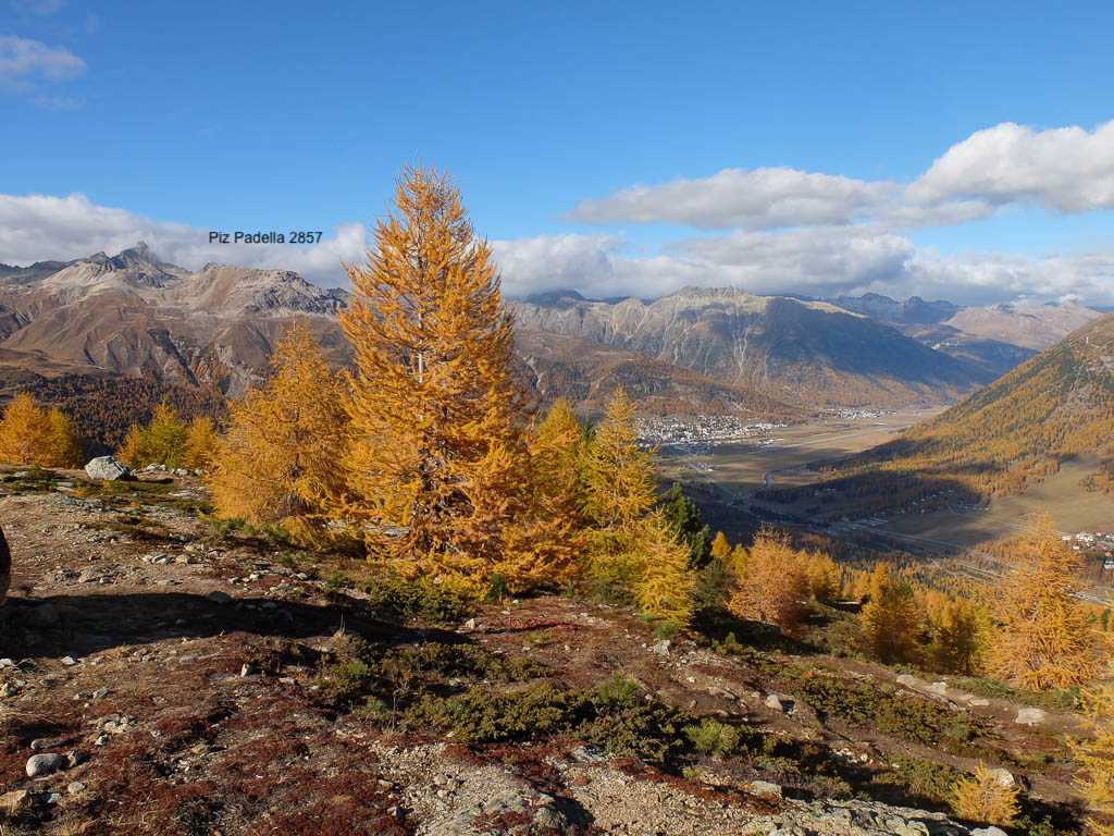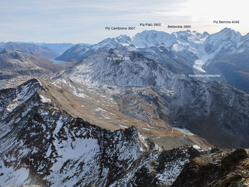 Im Westen liegen Piz Corvatsch, St. Moritz mit See und Piz Julier: