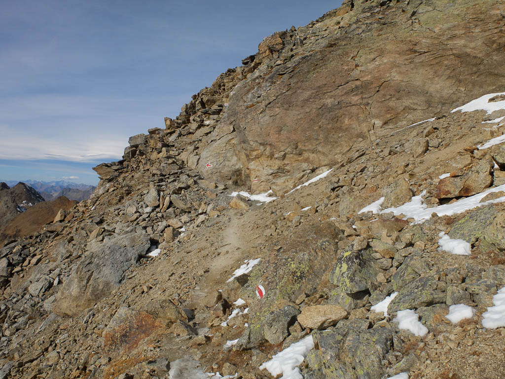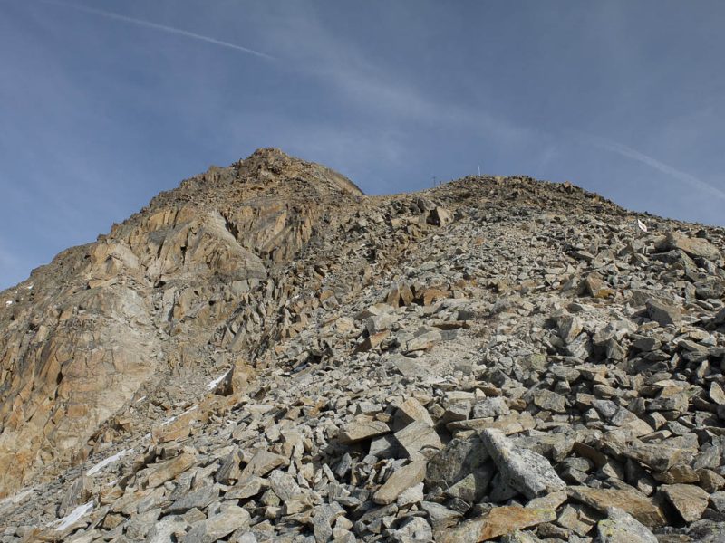 Hier passiert uns dann allerdings ein kleines Mischgeschick: Statt dem offiziellen Wanderweg Richtung Piz Languard zu folgen, laufen wir Richtung „Paradis“ (ohne „e“!). Nun ja, der Fehler ist zu entschuldigen, ins Paradies will schließlich jeder, auch wir. Allerdings nicht unbedingt heute! Gott sei Dank bemerken wir unseren Fehler recht schnell und laufen querfeldein zurück zum Wanderweg. Anschließend geht es nicht mehr ganz so zügig wie noch zu Beginn der Tour weiter. Das liegt nicht daran, dass wir k.o. sind, sondern an dem eisigen Wind, der uns entgegen bläst. Ich habe mittlerweile nicht nur eine Jacke übergezogen, sondern auch Stirnband und Handschuhe. Hier sind wir etwa 250 Meter unter dem Gipfel, die Stangen zeigen die Lage einer kurz unterhalb des Gipfels liegenden Hütte namens „Georgys“ an: