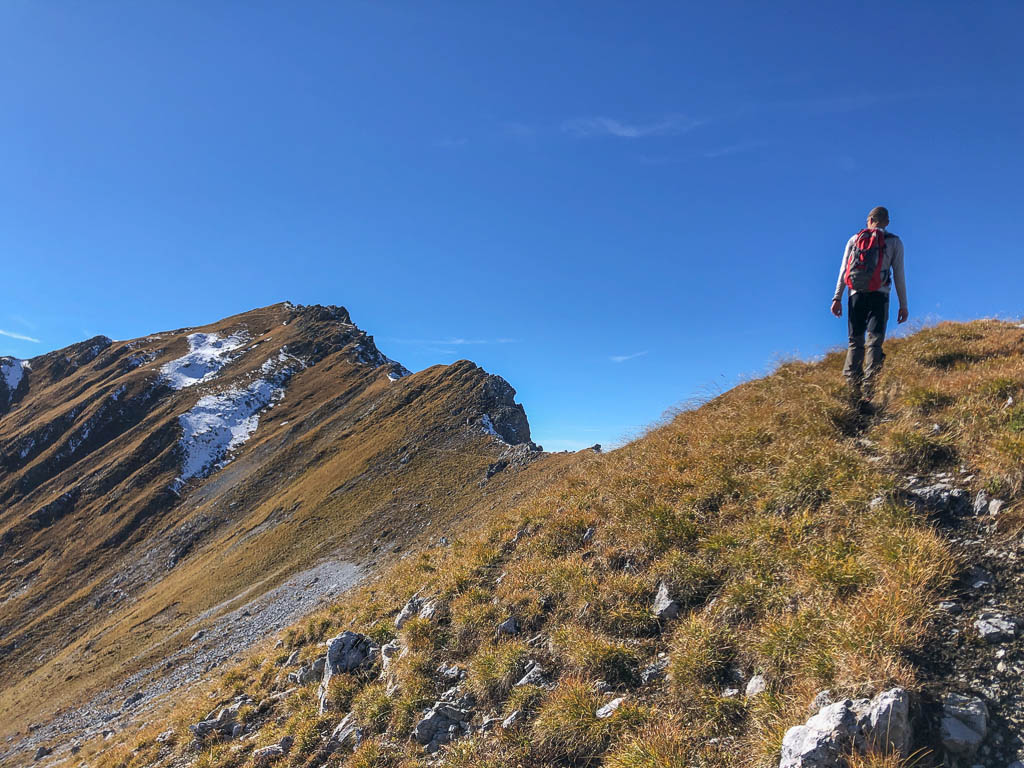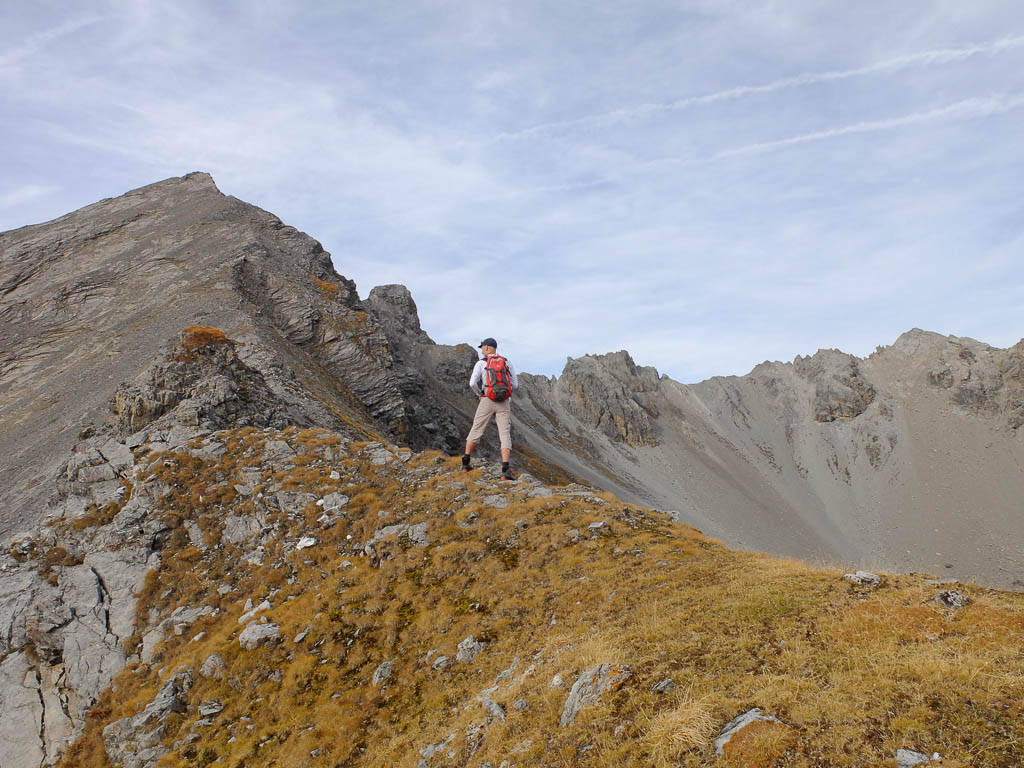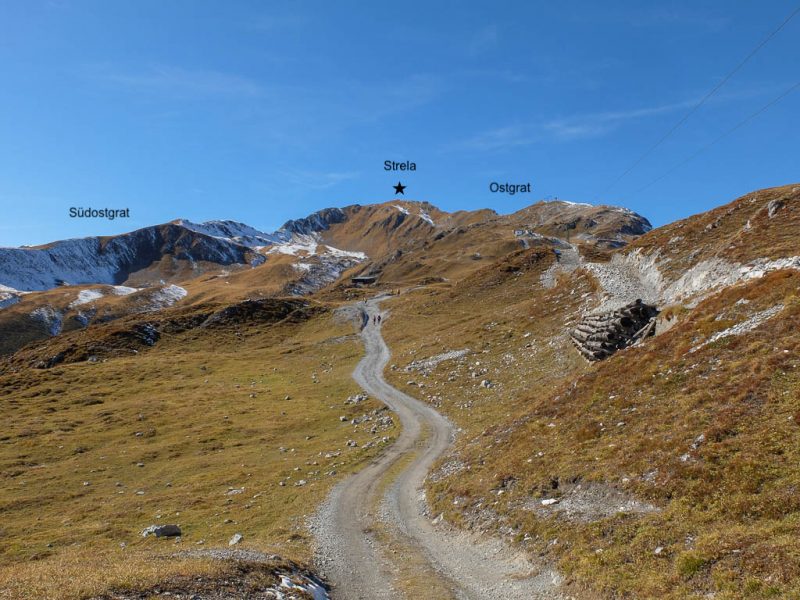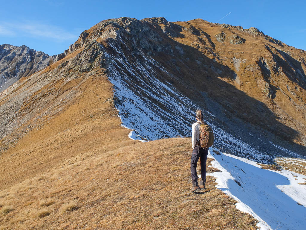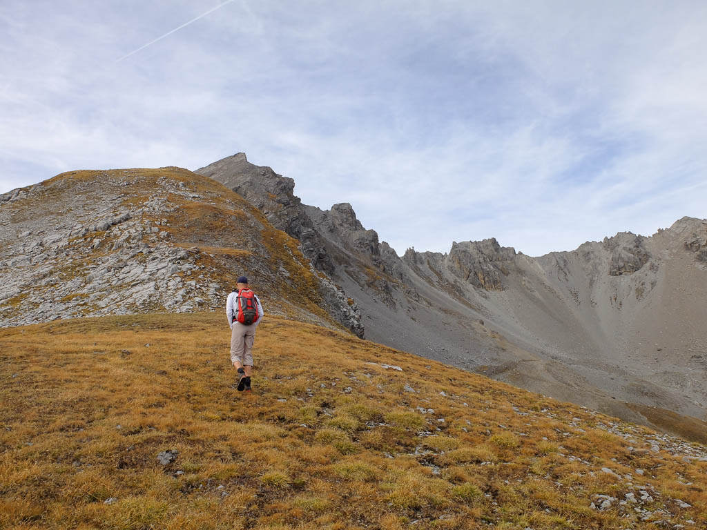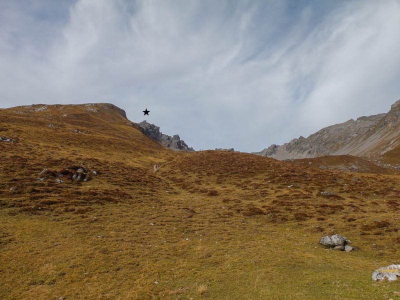 Georgys Hütte befindet sich auf 3175 Höhenmetern, 87 Höhenmeter unterhalb des Gipfels, und ist damit die höchstgelegene Berghütte des Kantons Graubünden. Während Guido die Hütte näher inspiziert, passiere ich sie zügig und steure direkt den zum Gipfel führenden Wanderweg an: