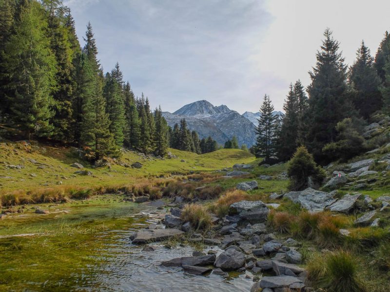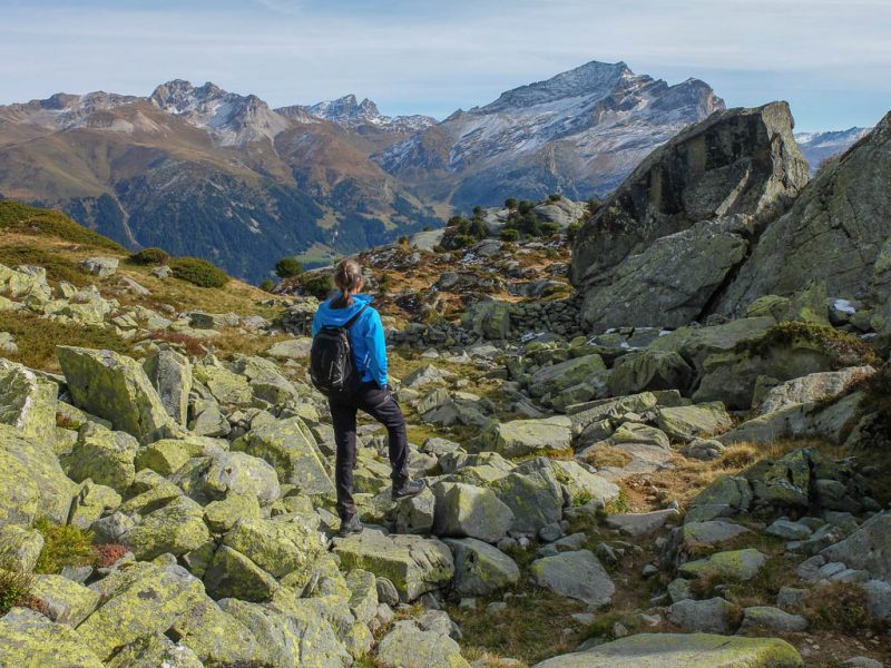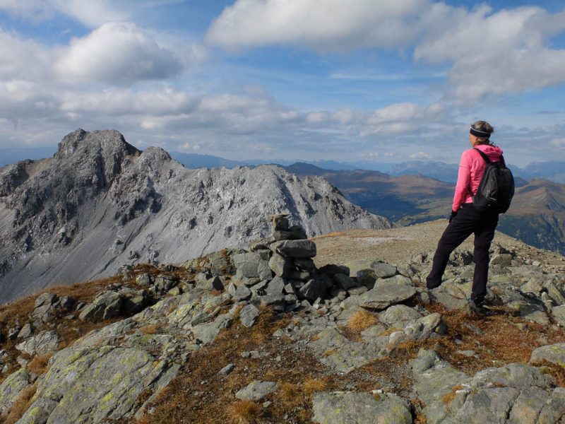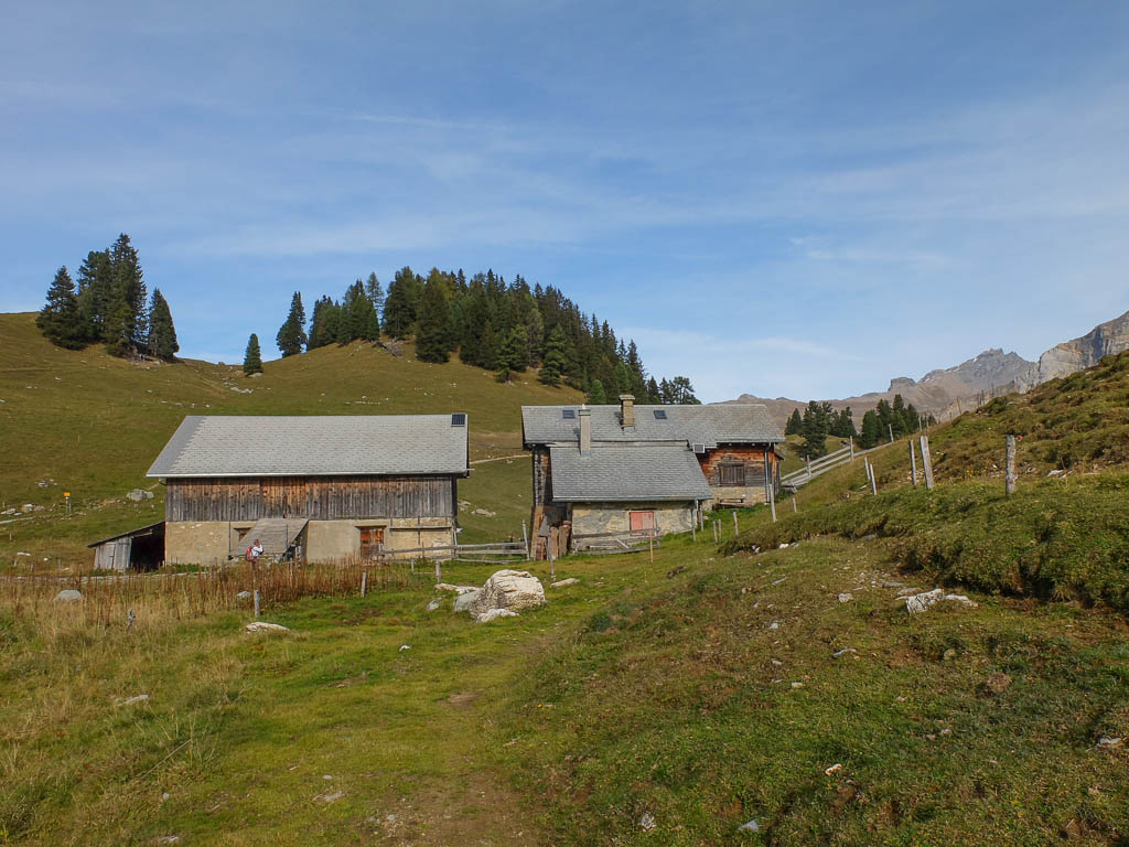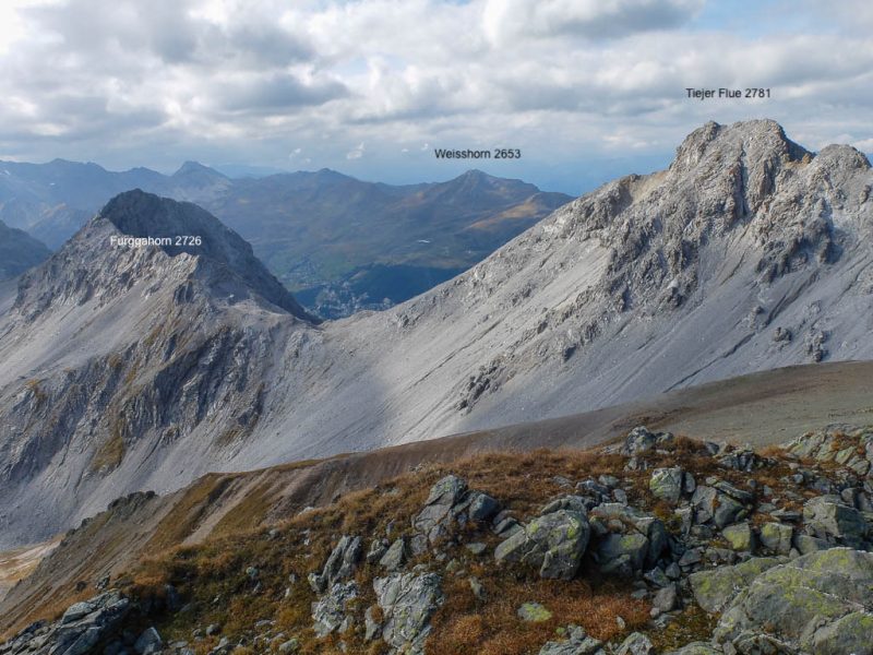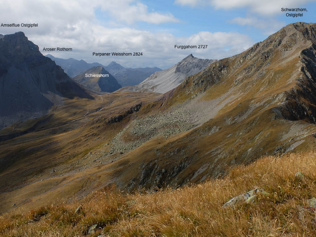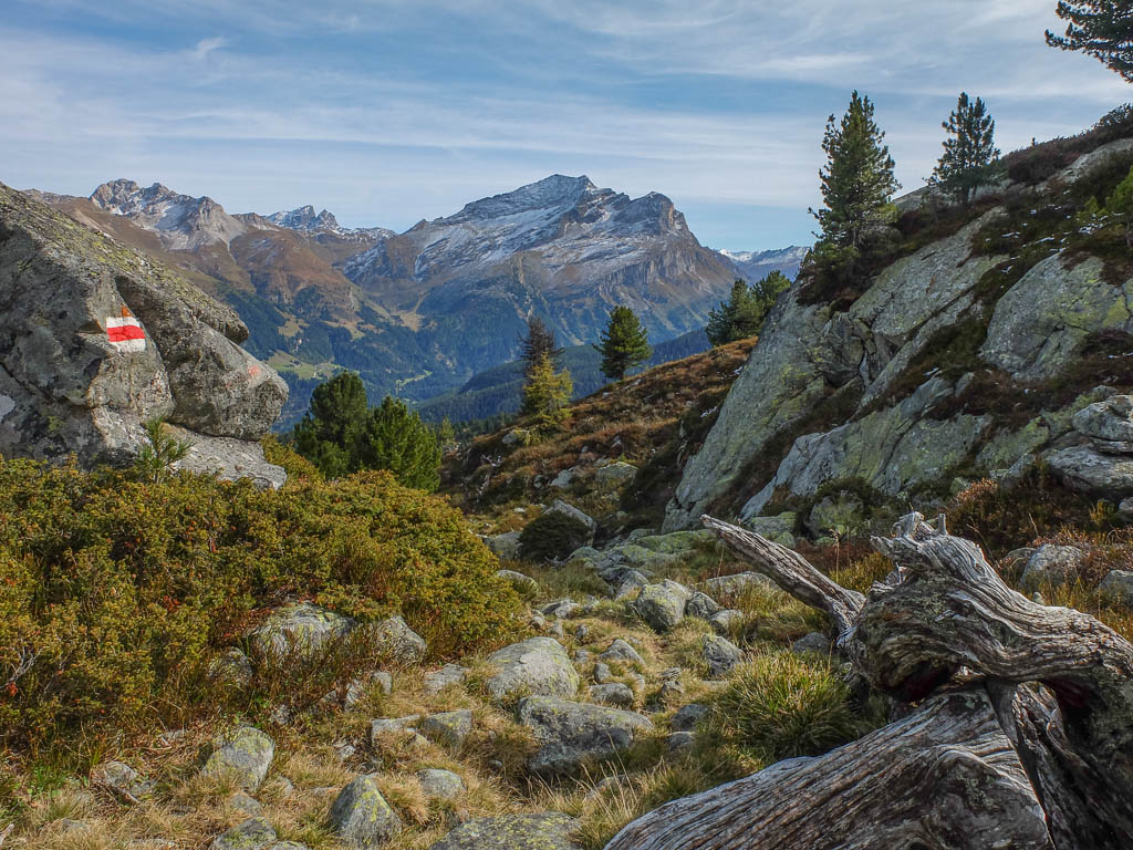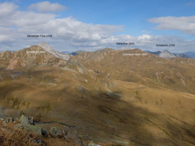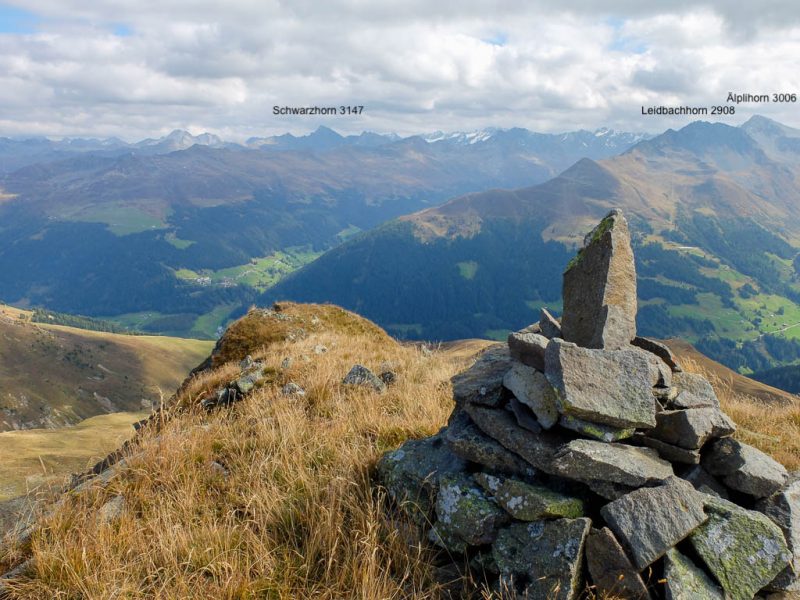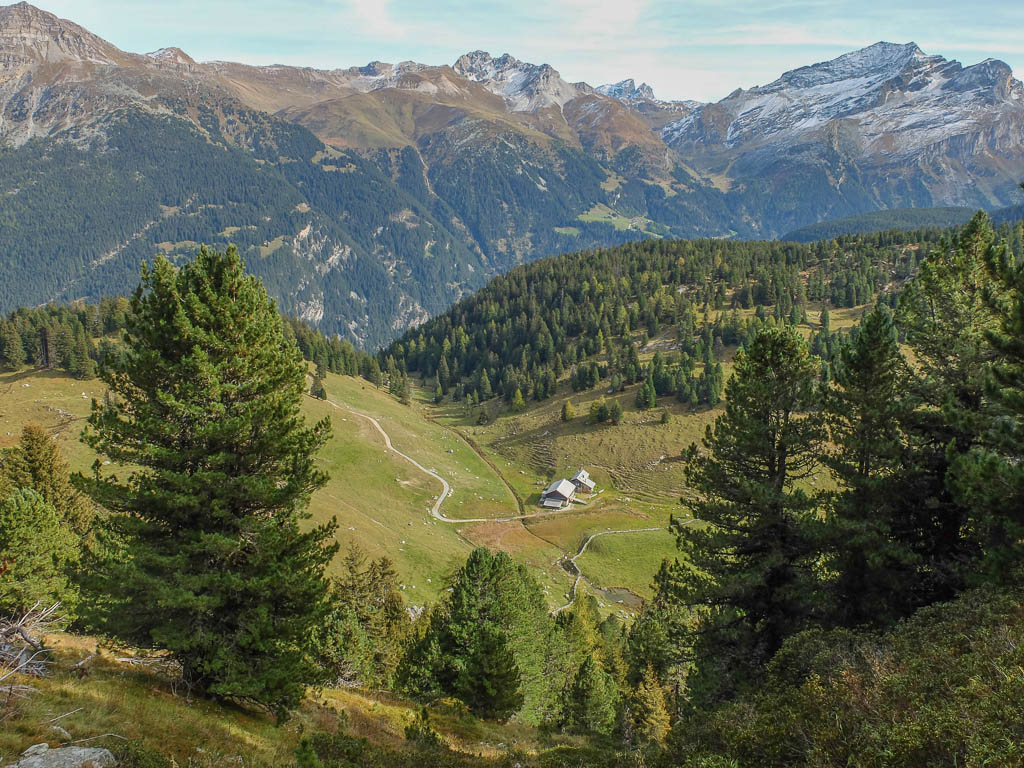 Vom Tschiertschen aus wandern wir über die Häuser von Clüs und durch den schattigen Oberwald hinauf zu den auf rund 1900 Höhenmetern gelegenen Weiden der Schafalp. Der Blick von der Schafalp auf das Aorser Weisshorn: