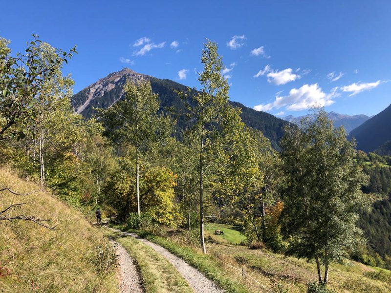 Anschließend geht es auf einem sehr sonnigen Weg weiter nach Innerurden. Die Herbstsonne zu spüren, tut einfach nur gut! Der Blick von Innerurden zurück auf den Wanderweg: