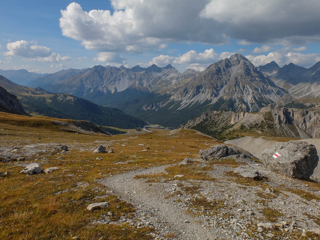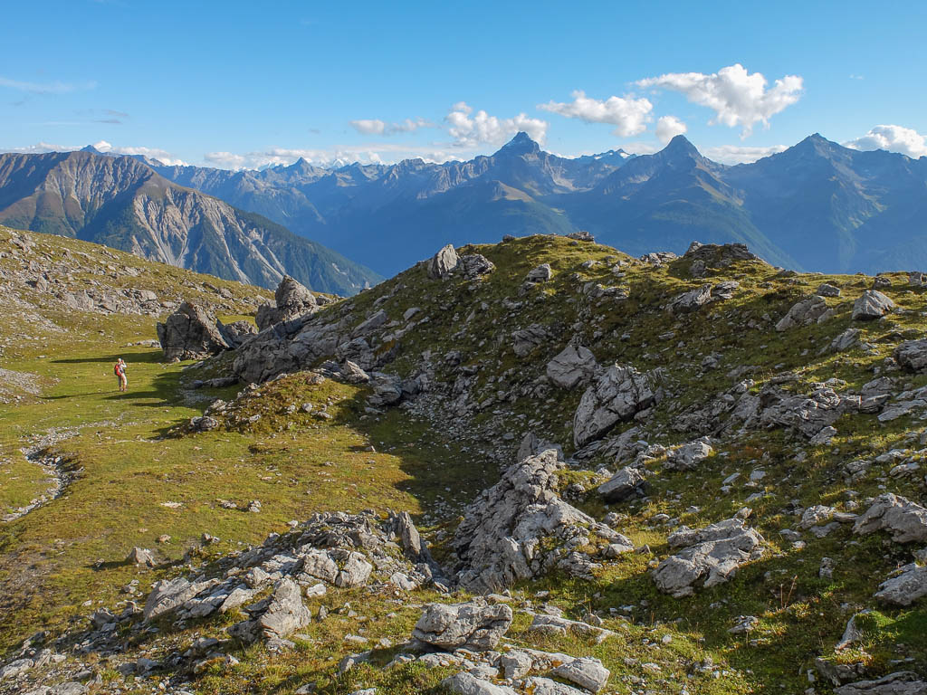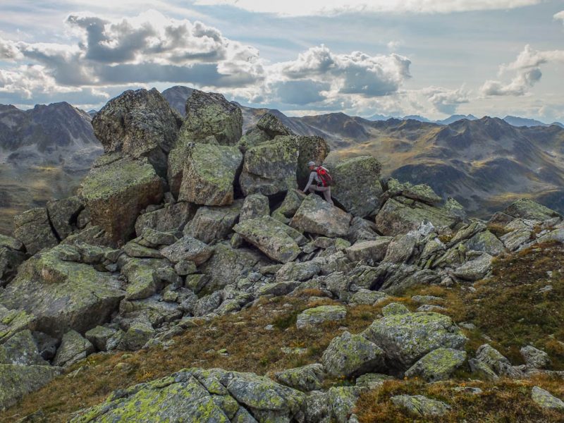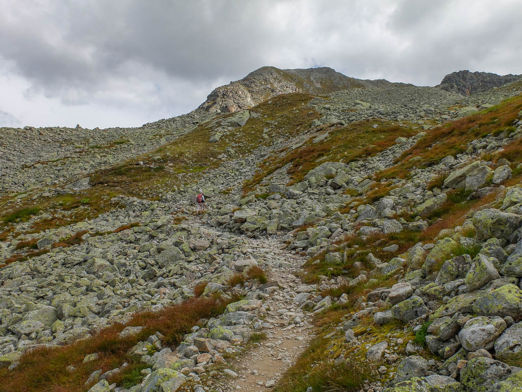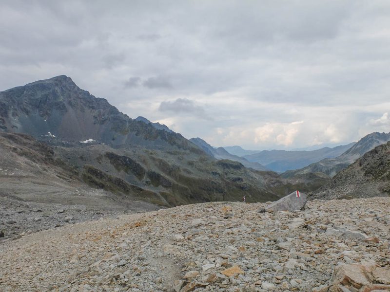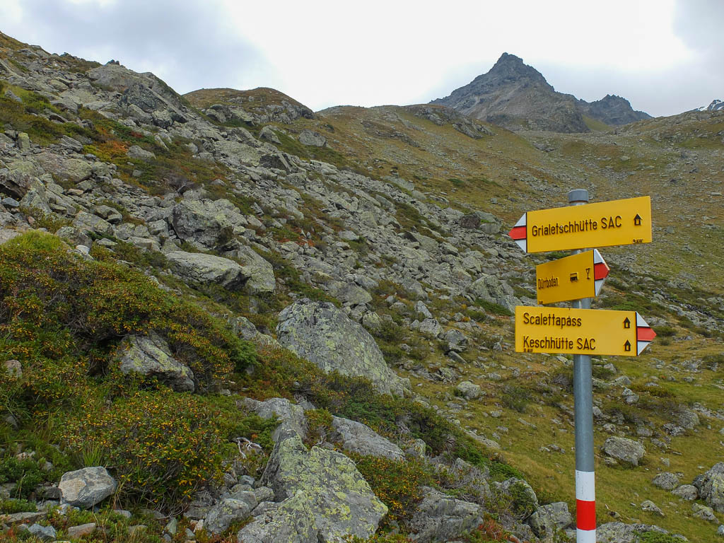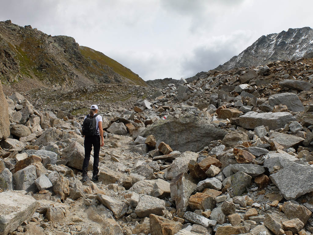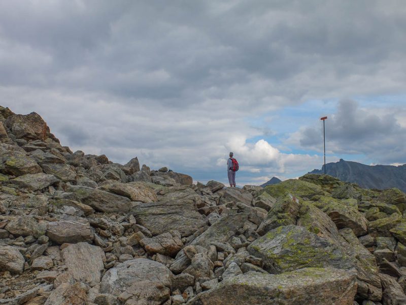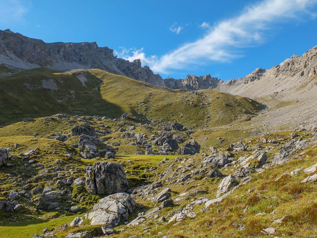 Von dort aus steigen wir eine halbe Stunde und knapp 150 Höhenmeter hinauf bis zu einer Weggabelung und halten uns dann rechts Richtung „Winterlücke“. Es ist eine Bauchentscheidung, die meisten anderen Wanderer steigen – zumindest heute – in Richtung „Jöriflüelafurgga“ auf. Schon jetzt gefällt mir die Wanderung ausgesprochen gut, es geht nämlich über sehr felsiges Gelände nach oben:
