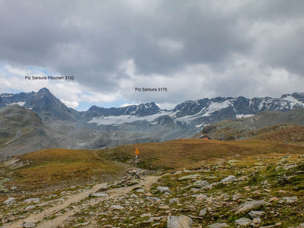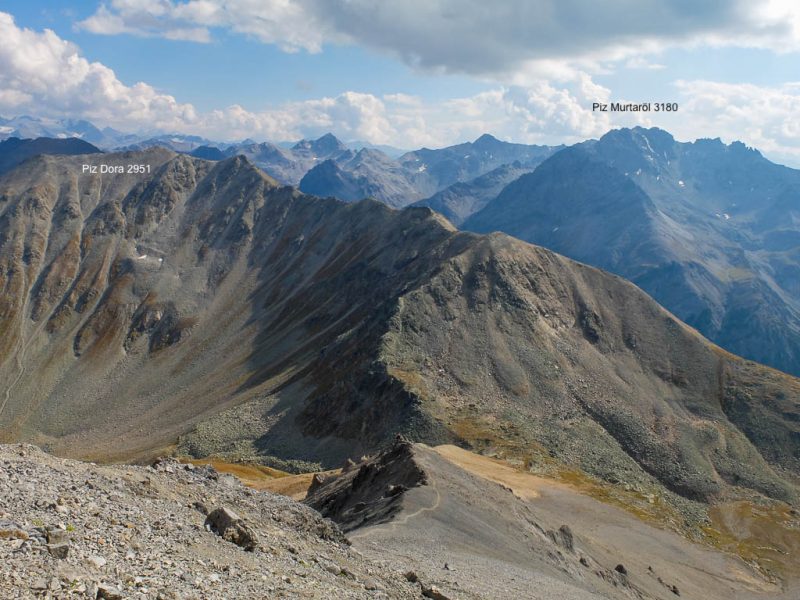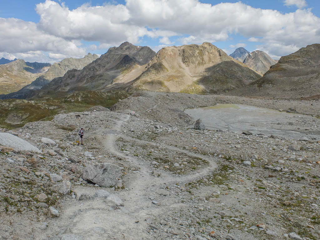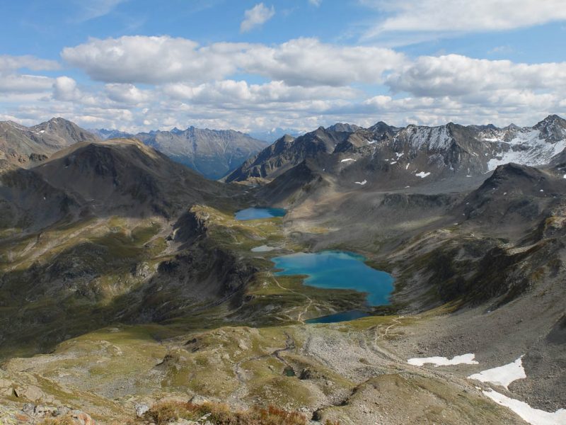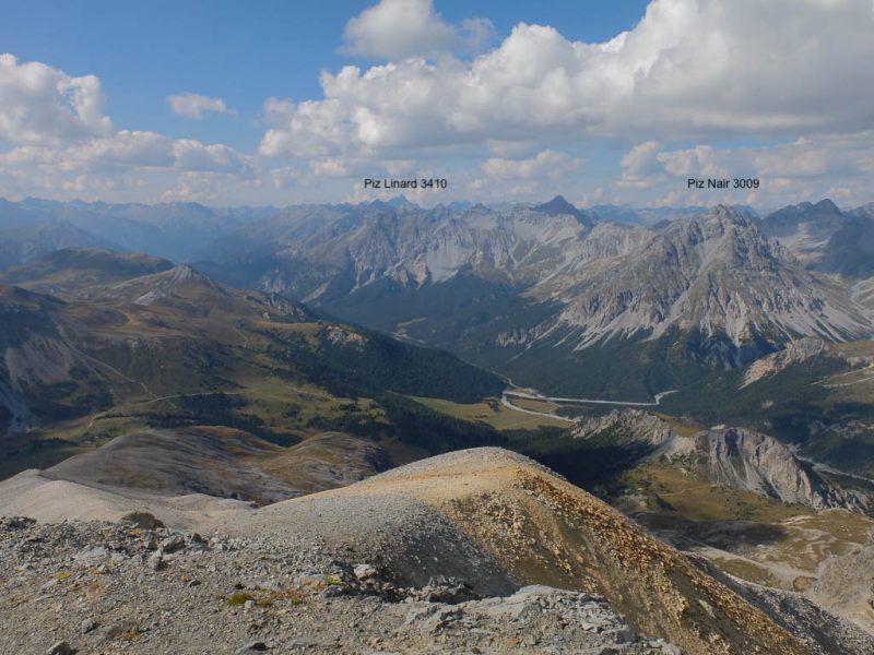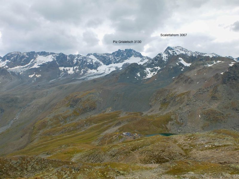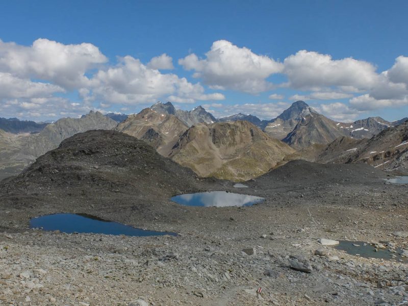 In der rechten Bildhälfte ist der 3410 Meter hohe Piz Linard zu sehen, nicht zu verwechseln mit dem 2767 Meter hohen Piz Linard bei Lenz. Von der Winterlücke aus geht es bergab zu den beiden größten der Jöriseen. Rechter Hand liegt dabei das Flüela Wisshorn mit den Resten des Jörigletschers: