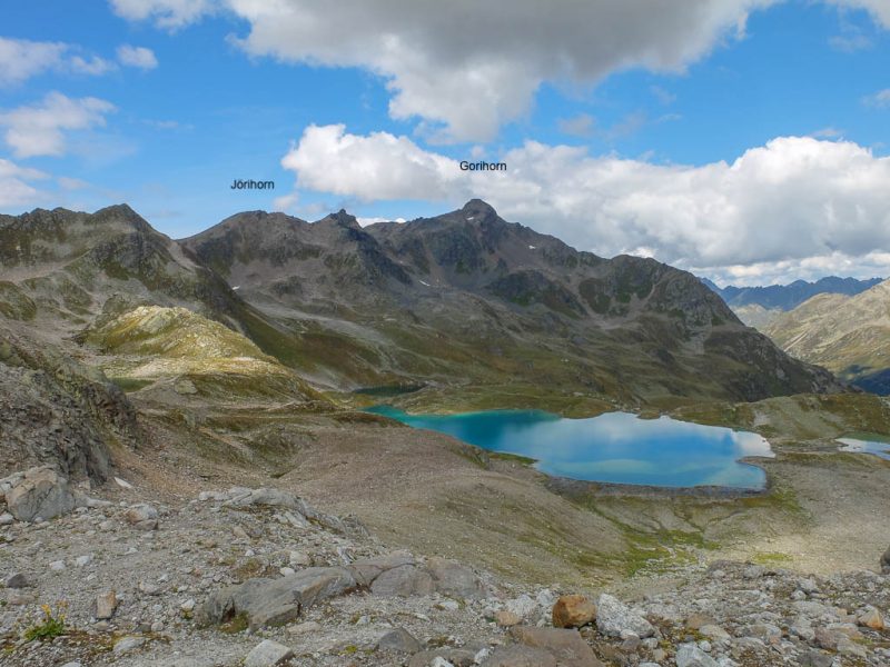 Linker Hand leuchtet uns schon der nächste der Seen entgegen, im Hintergrund ragen das Jörihorn und das Gorihorn auf: