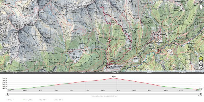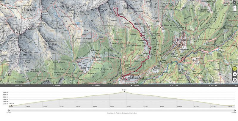 Ich nutzte den gestrigen Tag nicht nur, um die Tour auf den Guggernell zu verdauen, sondern auch, um neue Touren zu planen. Im Fokus lagen dabei Touren, die von der Flüelapassstraße aus starten. Mit dabei ist eine leichte T3-Rundwanderung um die Jöriseen und wir sind uns einig, dass diese Tour genau das richtige für den heutigen Tag ist. Um kurz nach 10 Uhr starten wir daher mit dem Bus Richtung Davos Platz und steigen dort in die Flüelapasslinie um. Start und Ziel der Wanderung ist die Bushaltestelle „Wägerhus“, die wir um 11.15 Uhr erreichen: