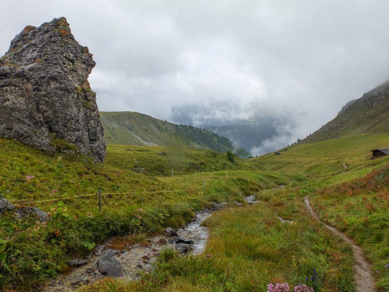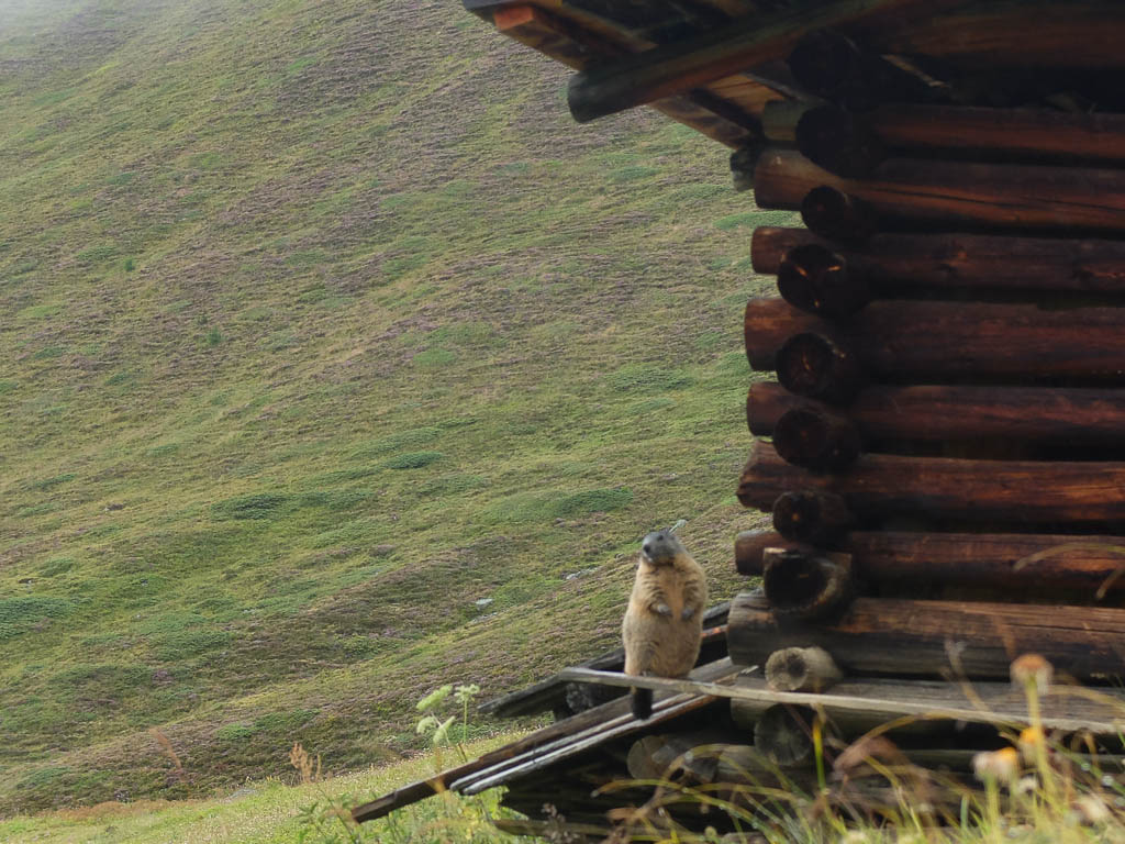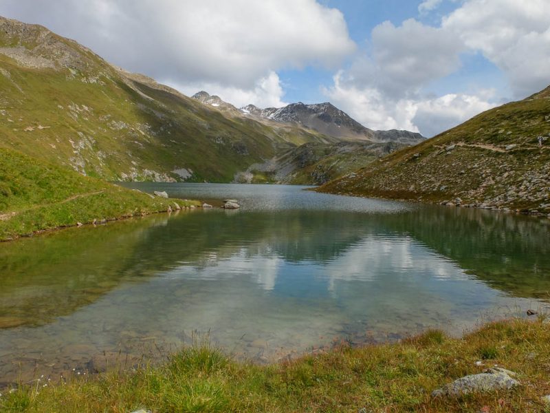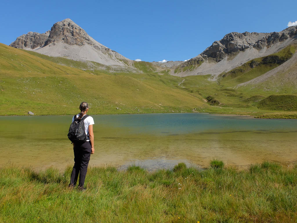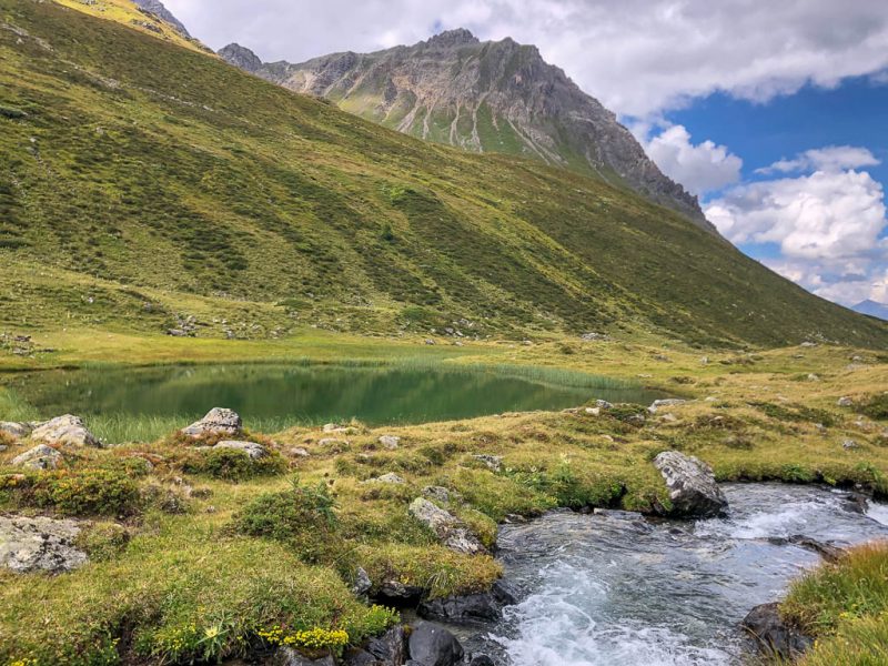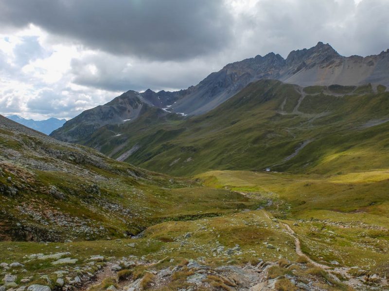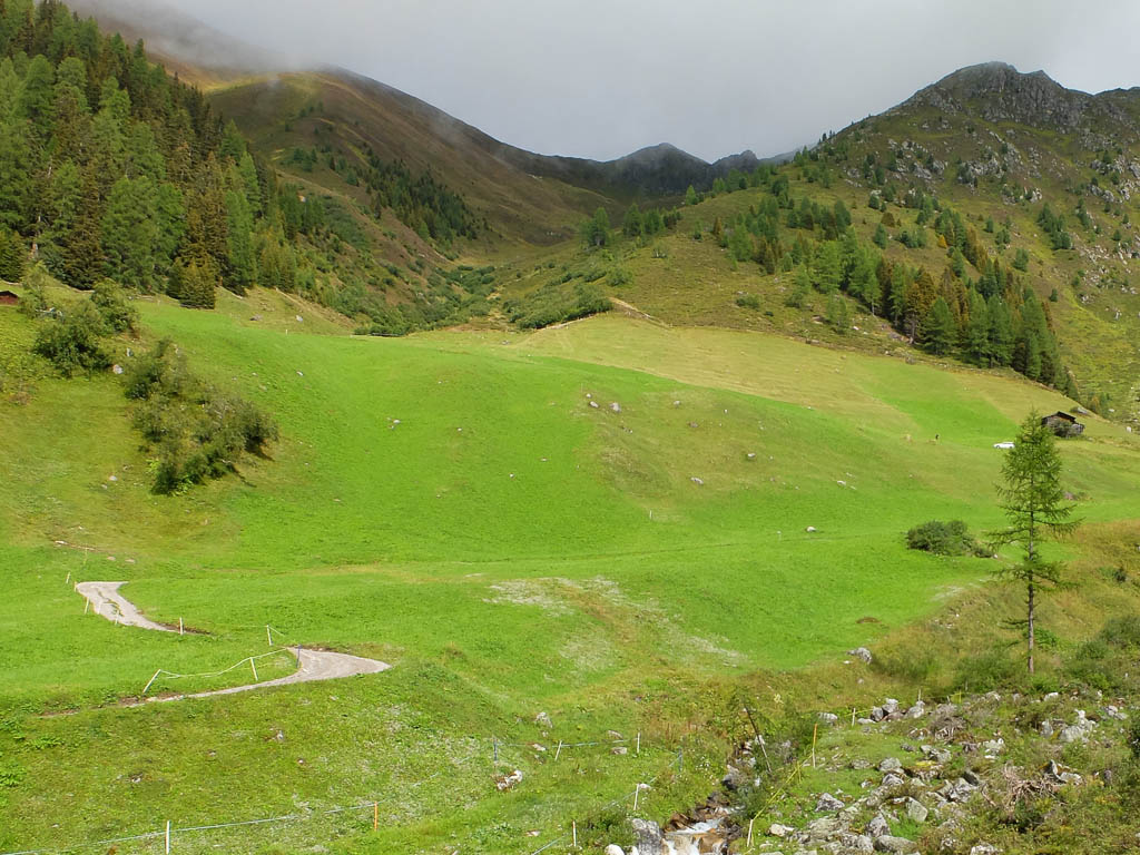 Der weitere Abstieg erfolgt über den Lai Grond und die Alp da la Creusch. Mit flotten Schritten über das Weidegelände der Alp da la Creusch: