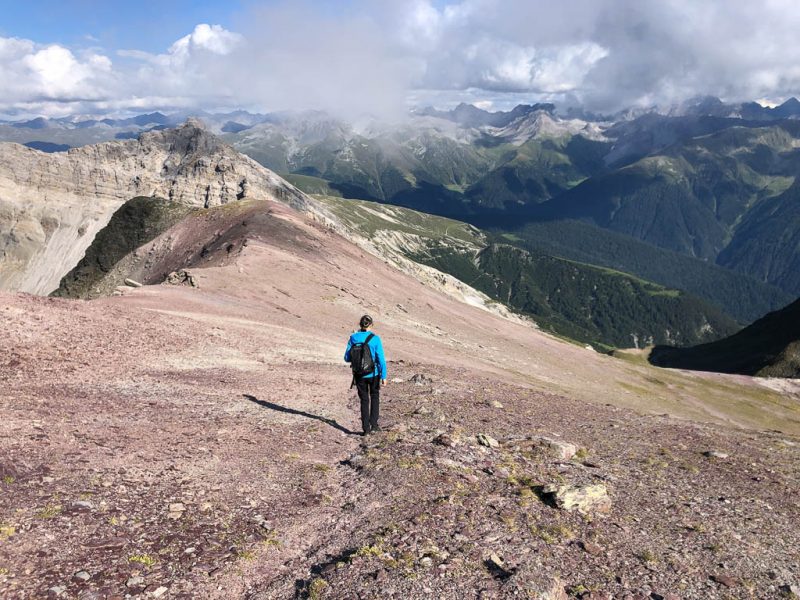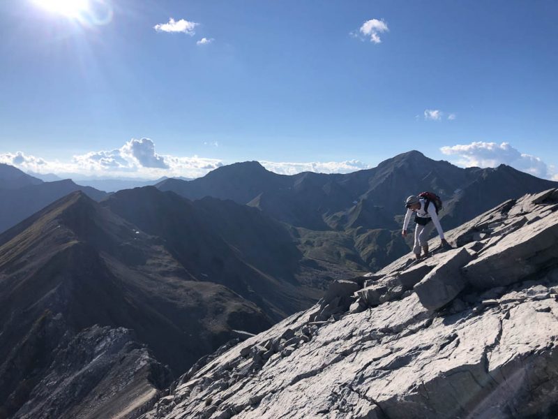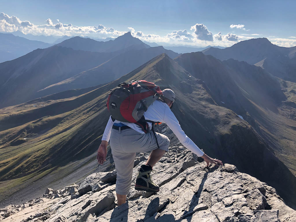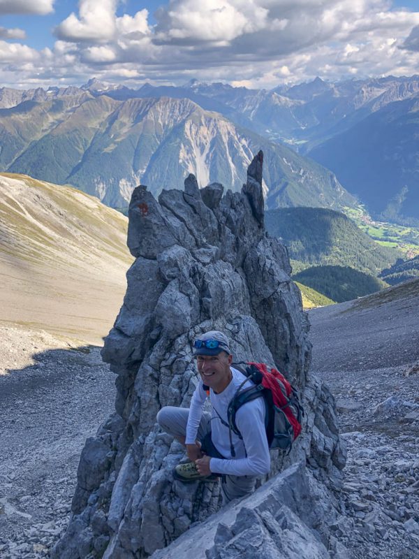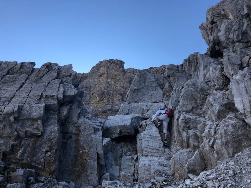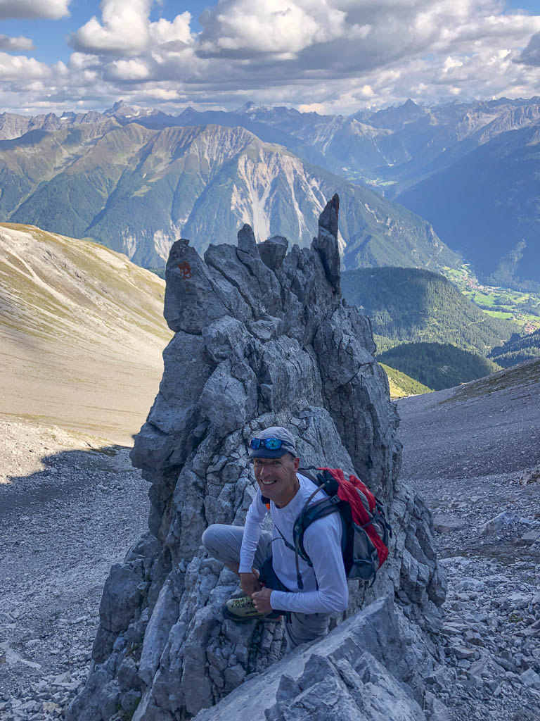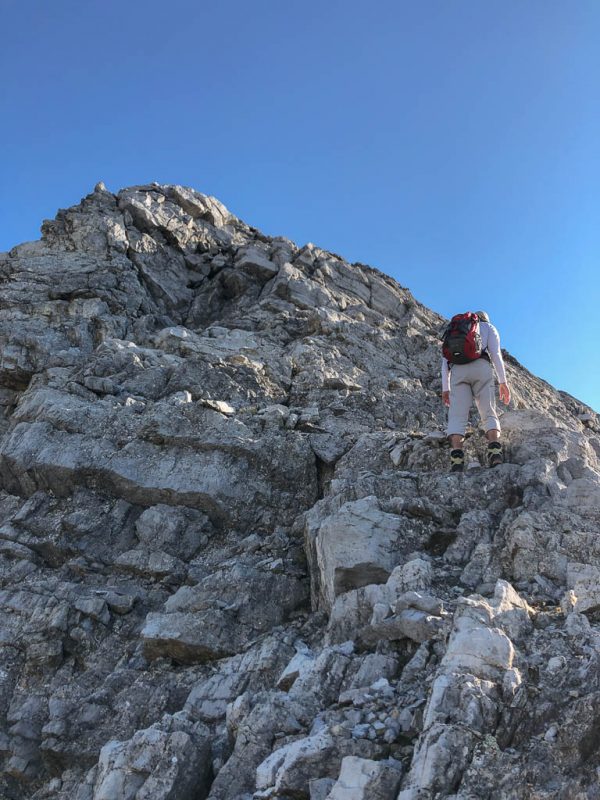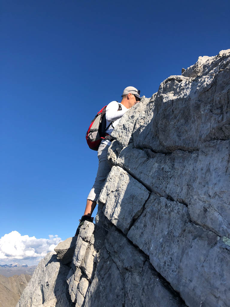 Meter für Meter arbeiten wir uns nach oben, ich immer in einem sicheren Abstand zum vorauskletternden Guido, damit mir keine Steine auf den Kopf fallen. Denn nicht nur wir sind in Bewegung, auch der Berg! Kurz unterhalb des Grats: