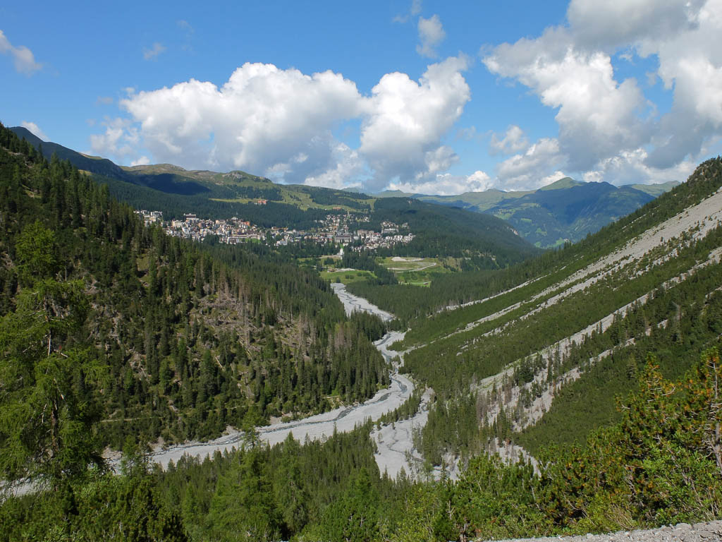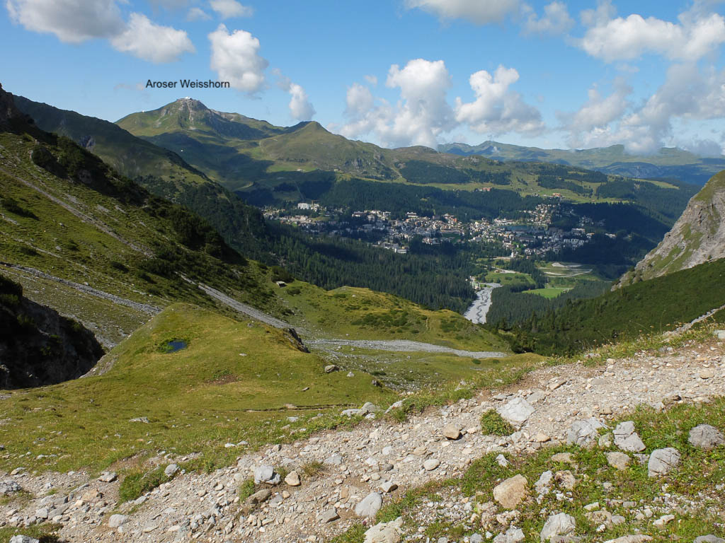 Der Blick Richtung Nordosten über das Welschtobel nach Arosa, im Hintergrund sind unter anderem die in Österreich liegenden Gipfel Sulzfluh, Drusenfluh und Schesaplana zu sehen:
