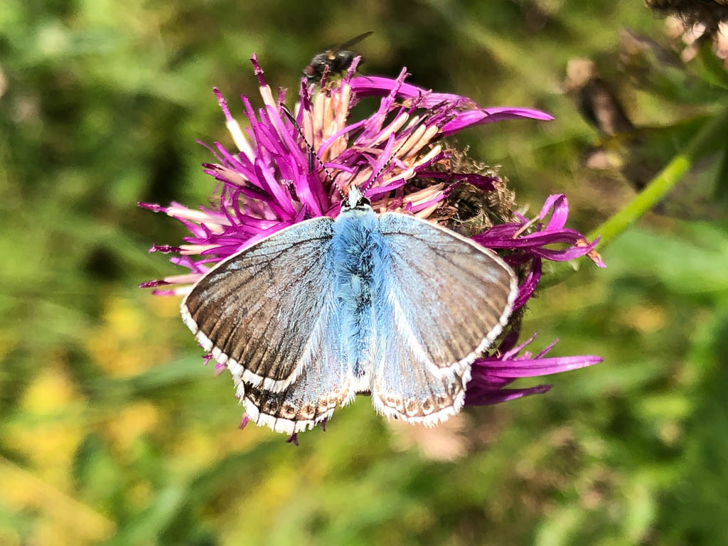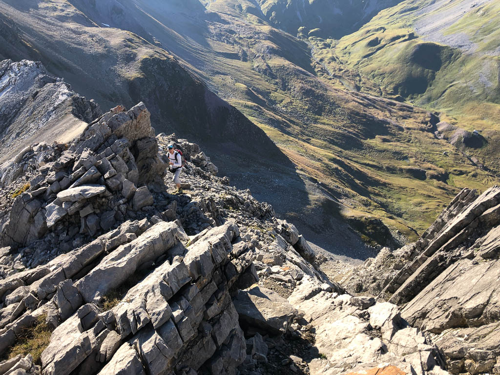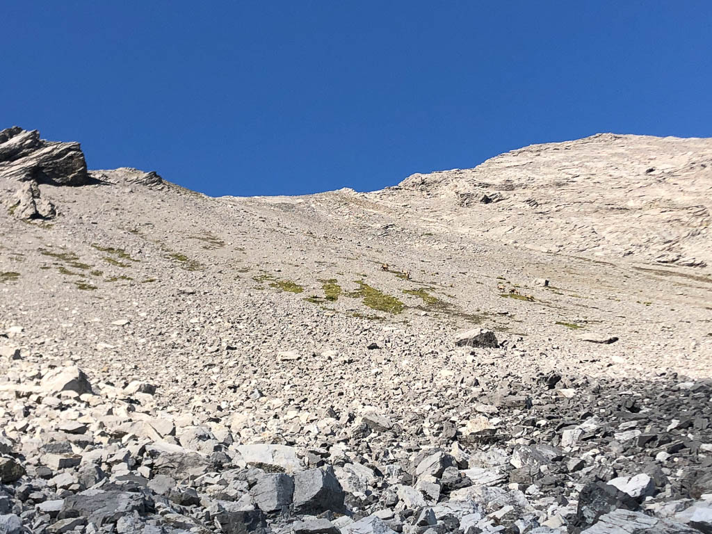 Das grobe Geröll lässt sich sehr gut begehen, so das wir zügig vorwärts kommen. Im steilen Gelände unterhalb des Grats tummeln sich vor uns rund 30 Gämsen. Als wir näher kommen, trennt sich die Herde und die Tiere flüchten in zwei verschiedne Richtungen: