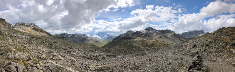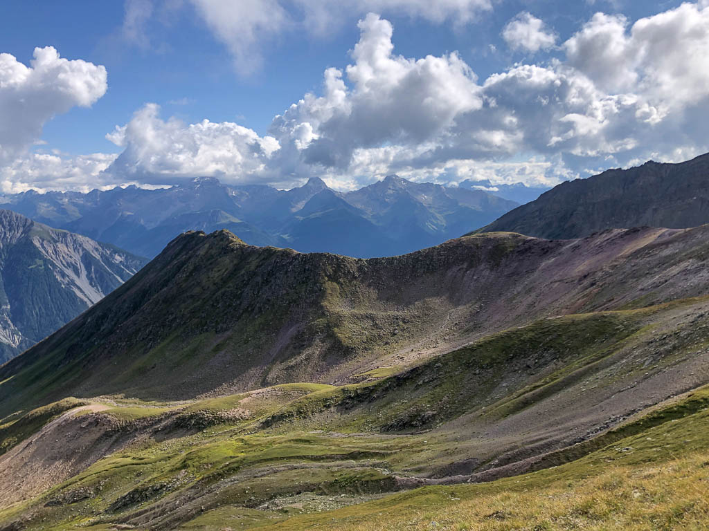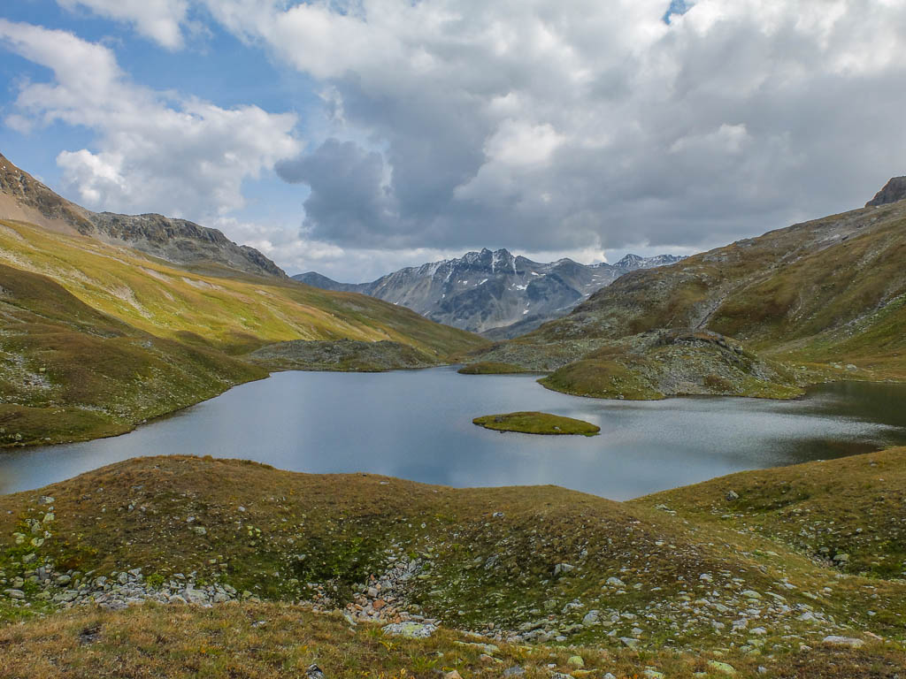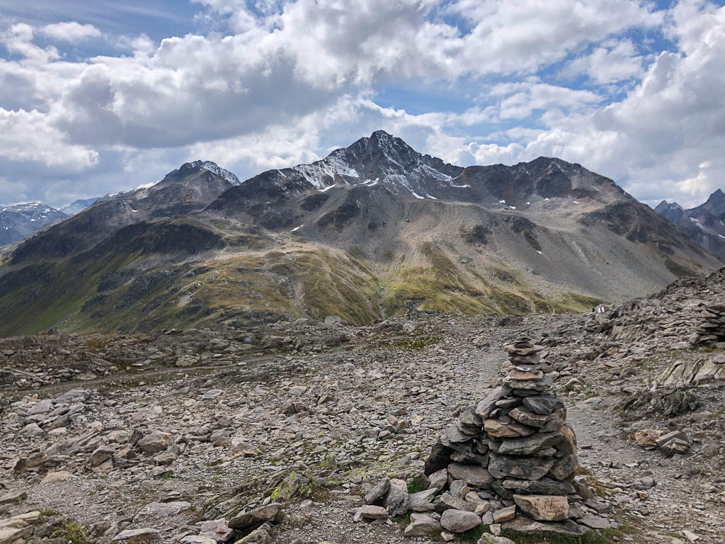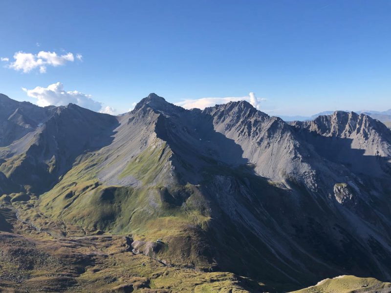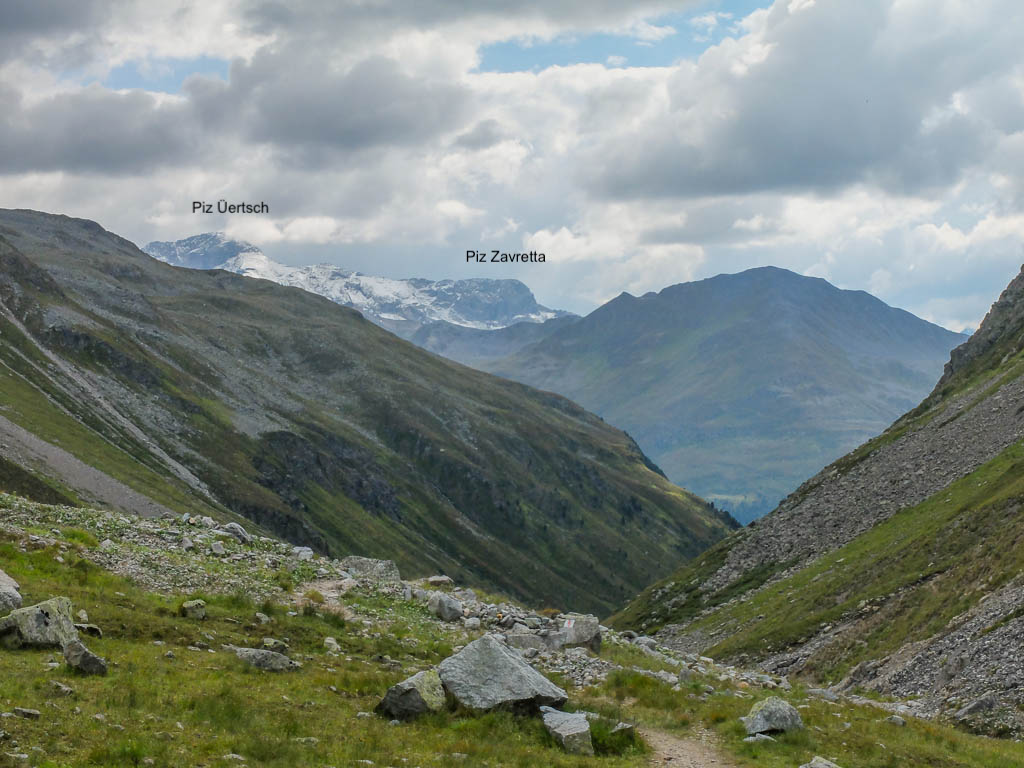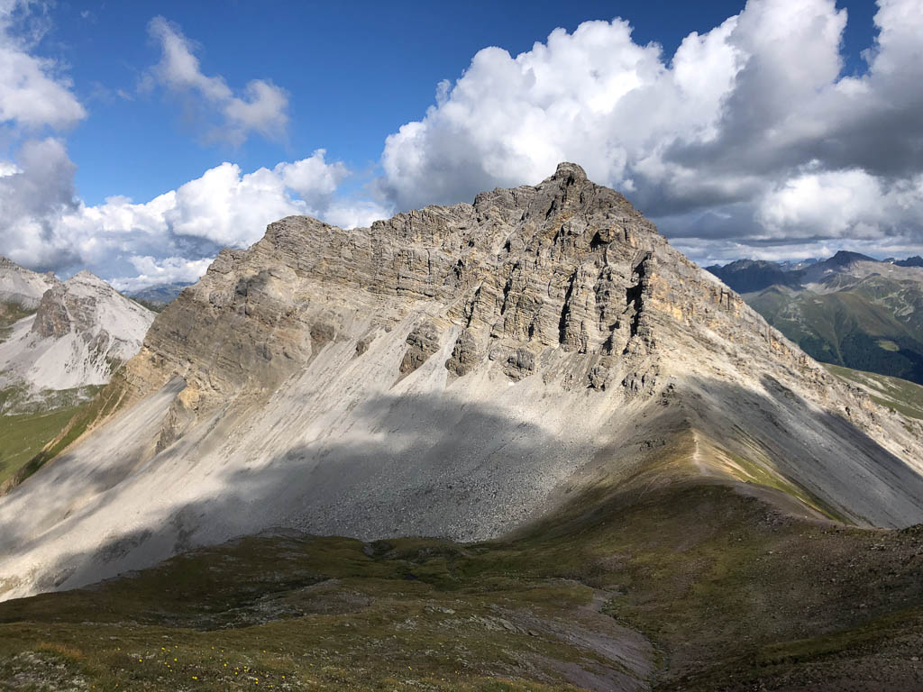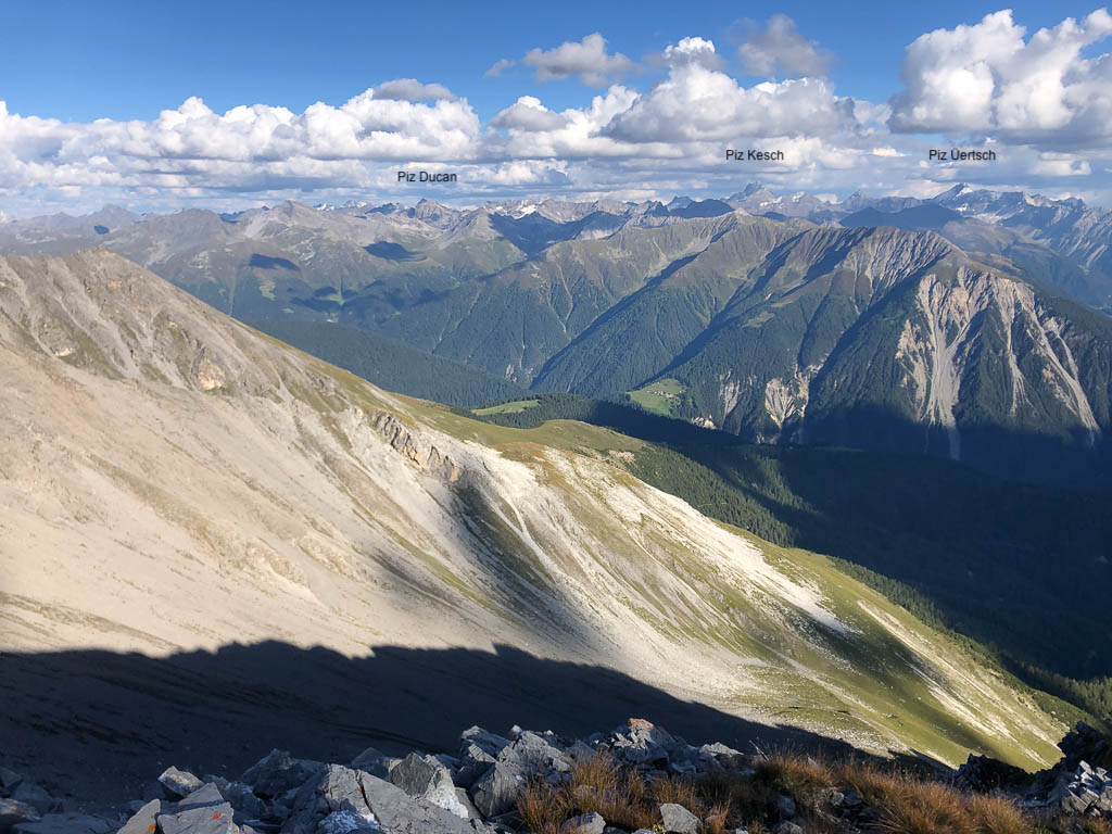 Im Osten bzw. Südosten überragt der Piz Kesch die am Horizont entlang ziehende Gipfelkette: