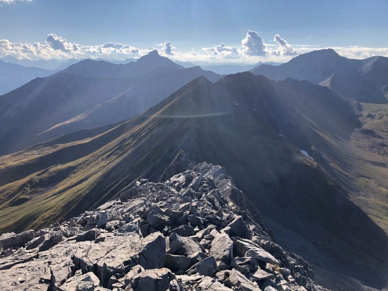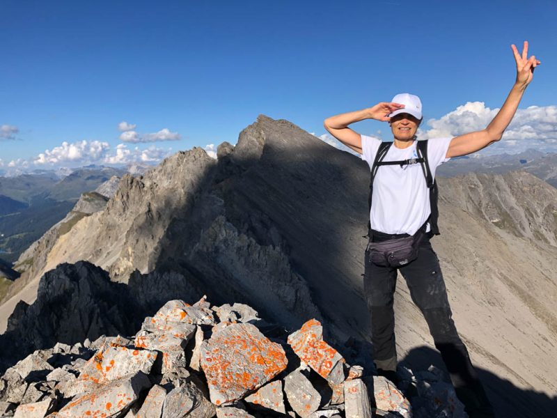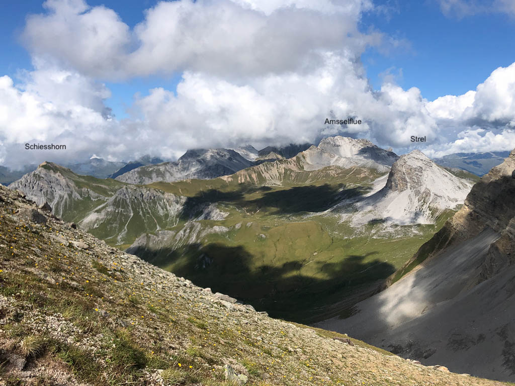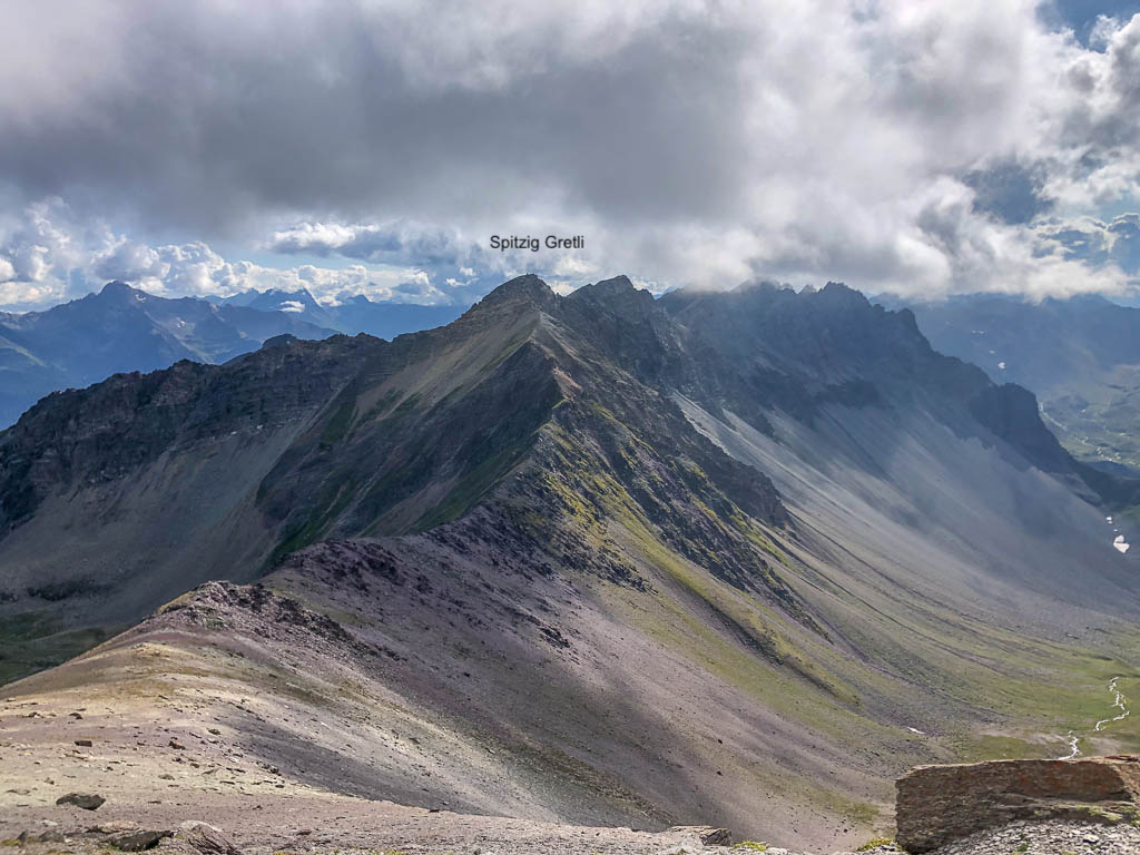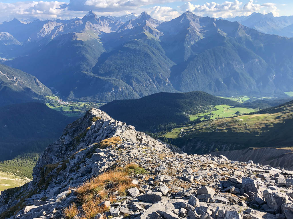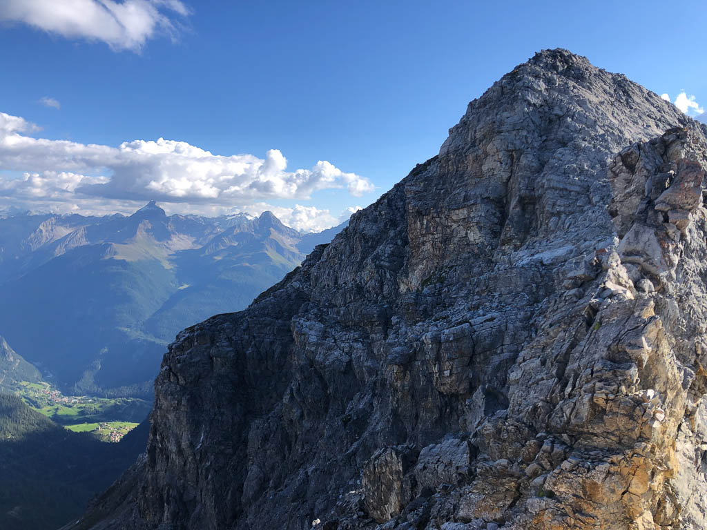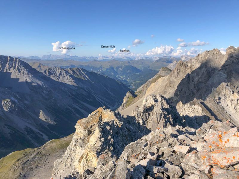 Das Gefühl, hier oben zu stehen, lässt sich nicht in Worte fassen. Kein anderer Gipfel hat in diesem Jahr solch intensive Emotionen bei mir ausgelöst. Es ist, als fielen sämtliche Lasten von mir ab. Warum, wieso, kann ich nicht sagen, es ist einfach so. Der Blick vom Gipfel über den Südgrat hinunter auf Schmitten, im Hintergrund sind die Bergüner Stöcke zu sehen: