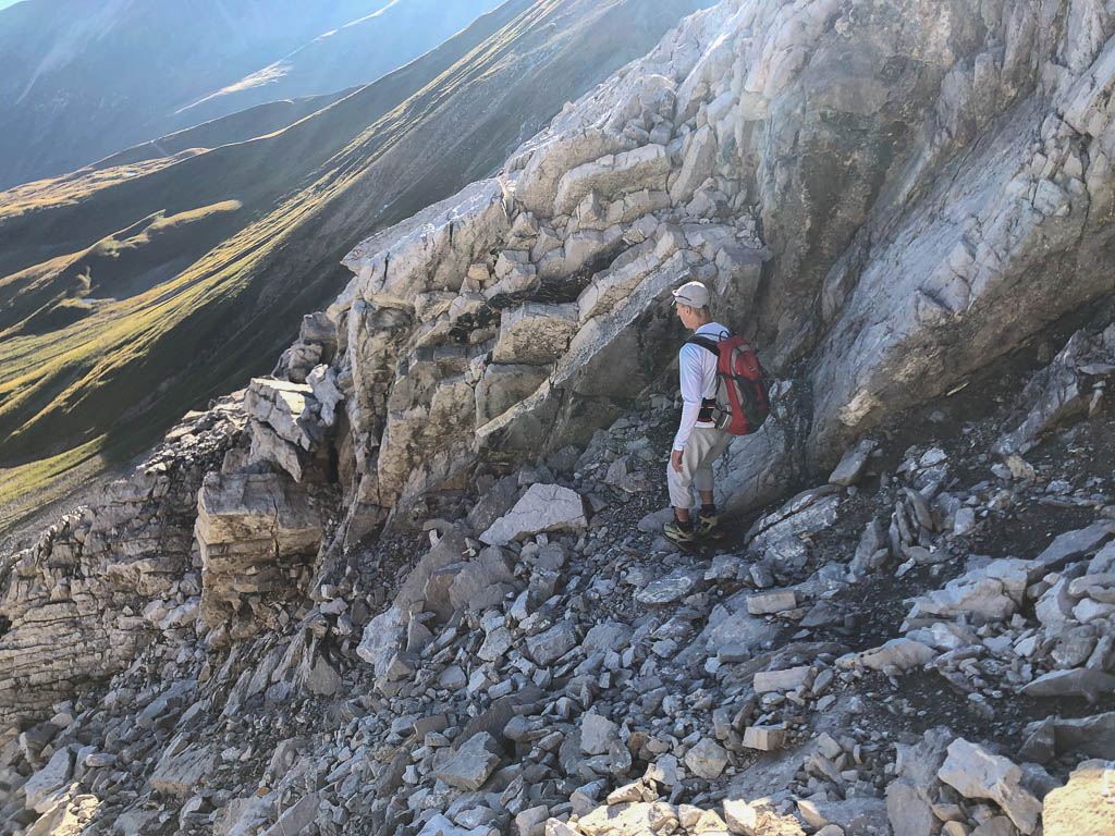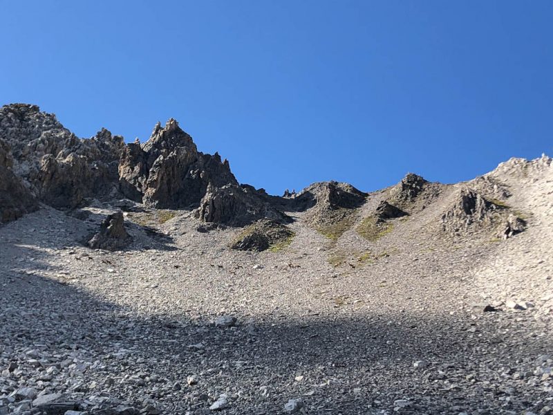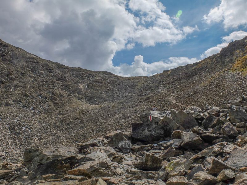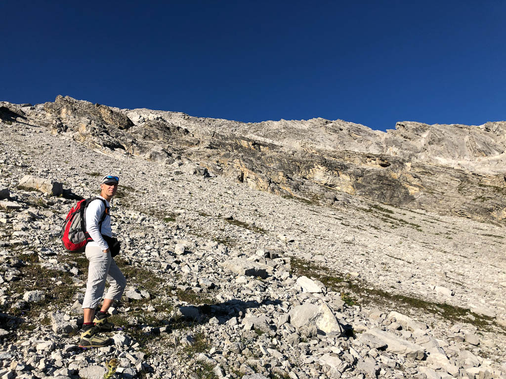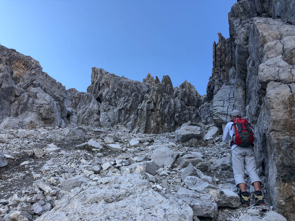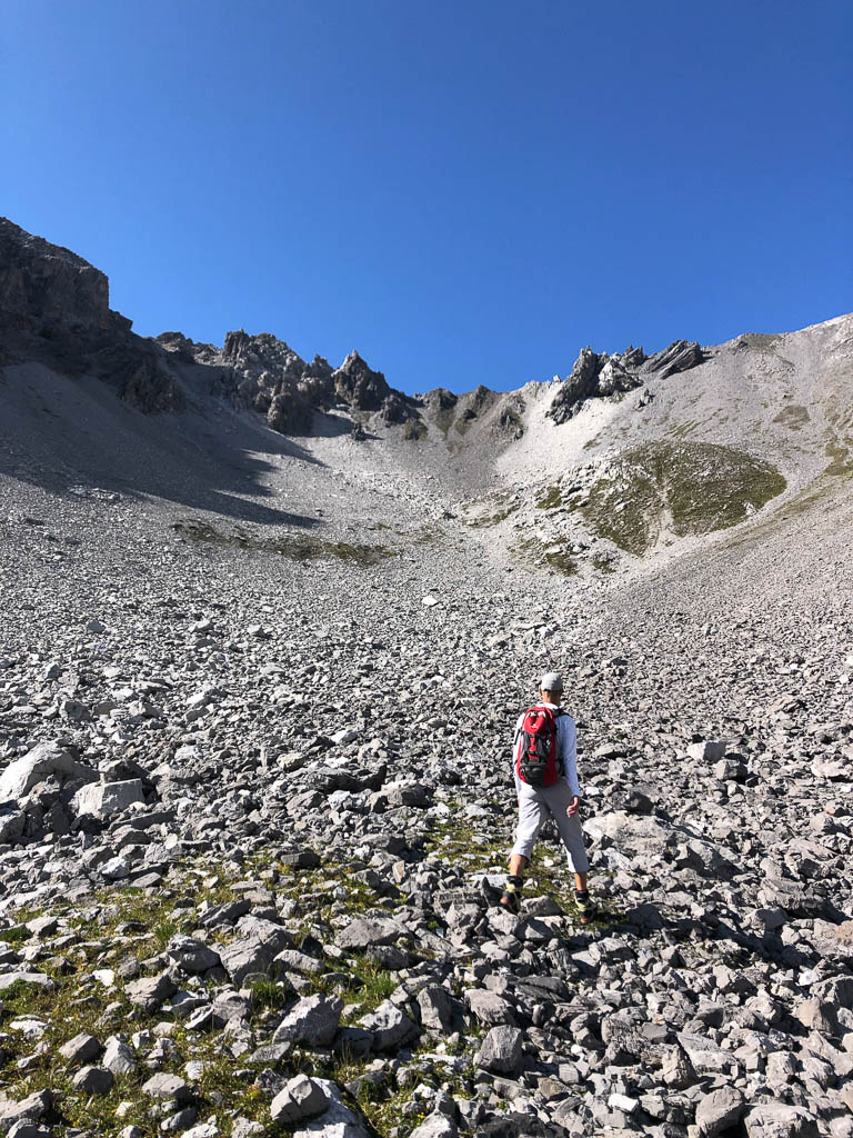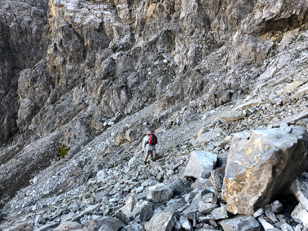 Schließlich erreichen wir eine Schutthalde, über die wir bequem Richtung Süden absteigen können: