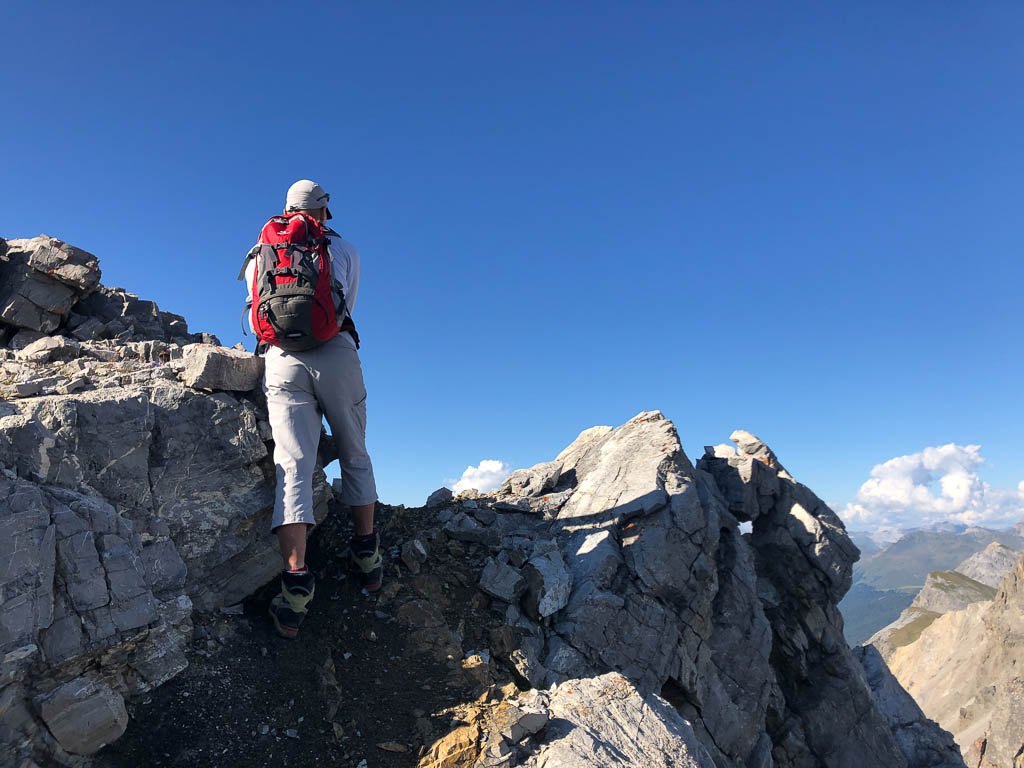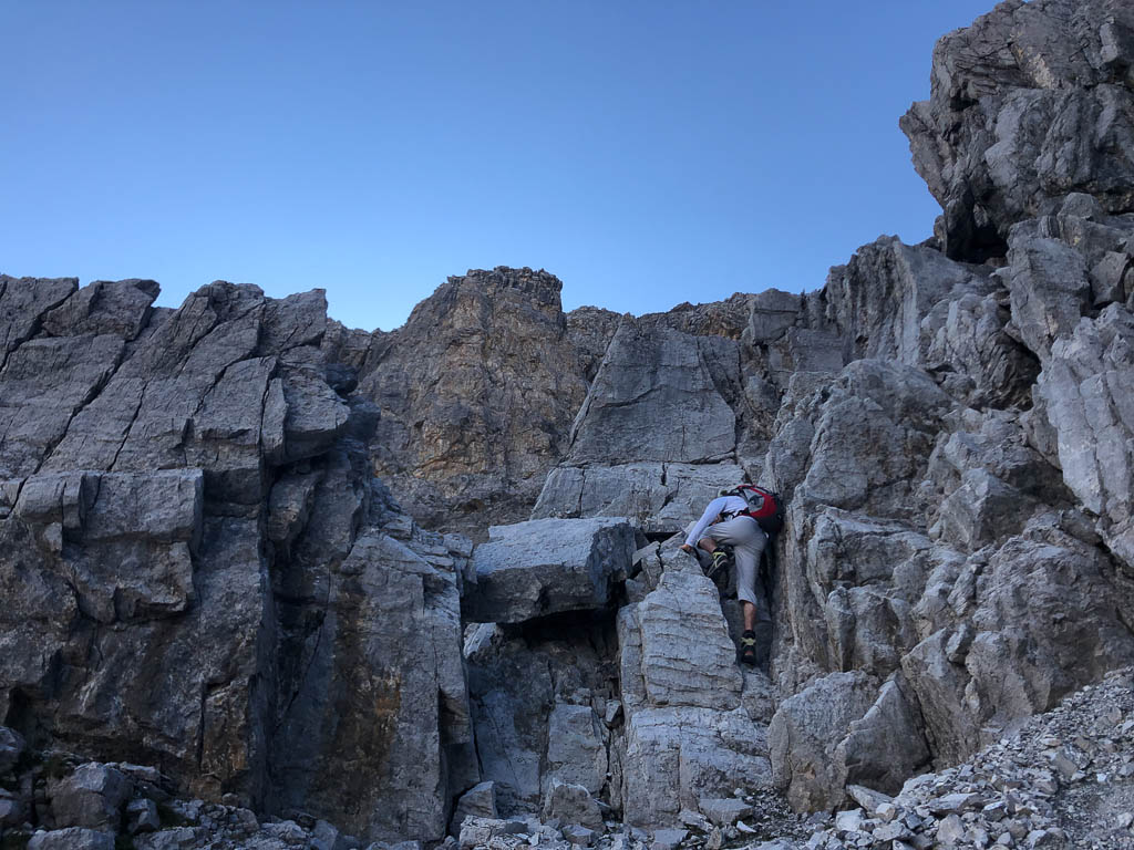 Bei diesem Anblick erfasst mich eine tiefe Dankbarkeit, aber auch Zufriedenheit und das Erreichen des Gipfels ist nicht mehr wirklich wichtig. Doch der Gipfelaufschwung erweist sich aus der Nähe gesehen freundlicher als erwartet. Wir klettern also weiter, die Schwierigkeit überschreitet nirgends den I. Grad. Einige Meter können wir sogar aufrecht gehend zurücklegen: