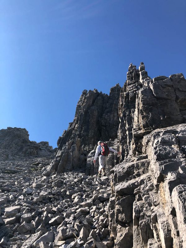 Aber wir geben nicht auf, doch noch einen Weg hinauf zum Gipfel zu finden: Wir verlassen den Grat wieder und queren unterhalb des Grats Blockgeröll und Felsrippen Richtung Gipfelaufschwung: