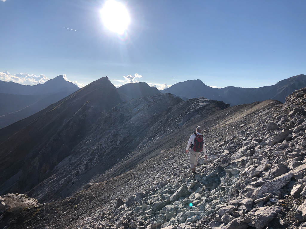 Eine Option ist der Abstieg über die Aufstiegsroute, eine andere der Abstieg über den Südgrat bzw. den Westgrat. Wir entscheiden uns schließlich für den Westgrat, bei dem zu Beginn Platten überwunden werden müssen: