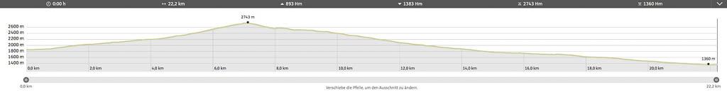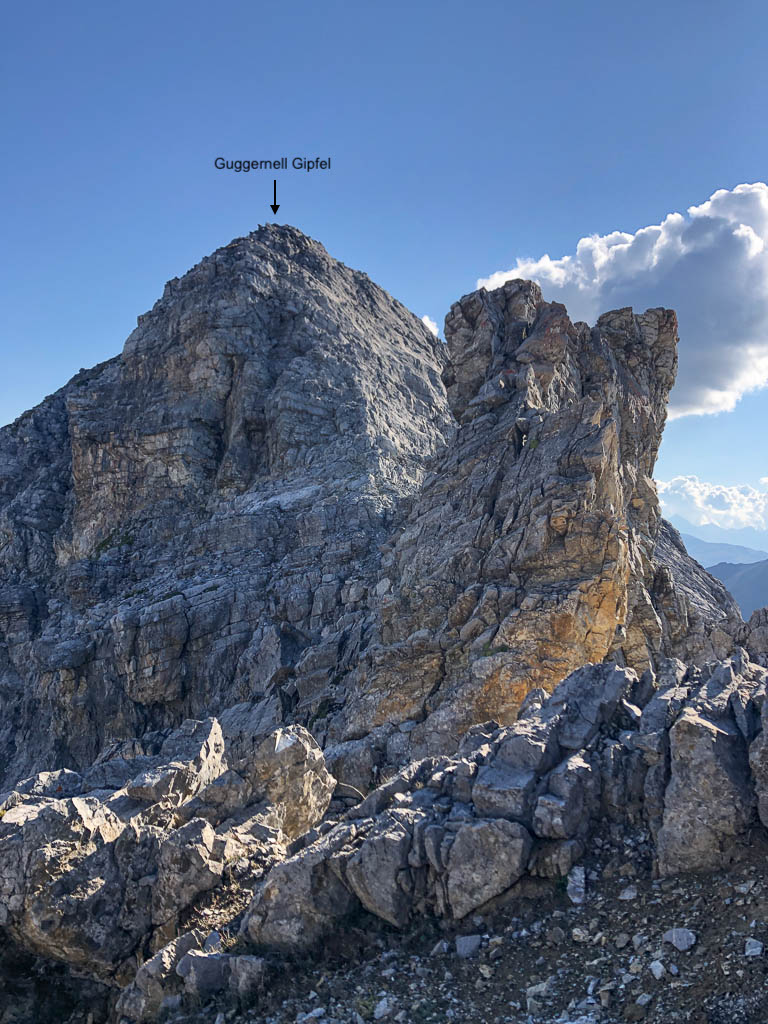 Noch ein Blick zurück auf den Gipfel, der Pfeil markiert die Stelle, an der wir während des Abstiegs den Westgrat verlassen haben: