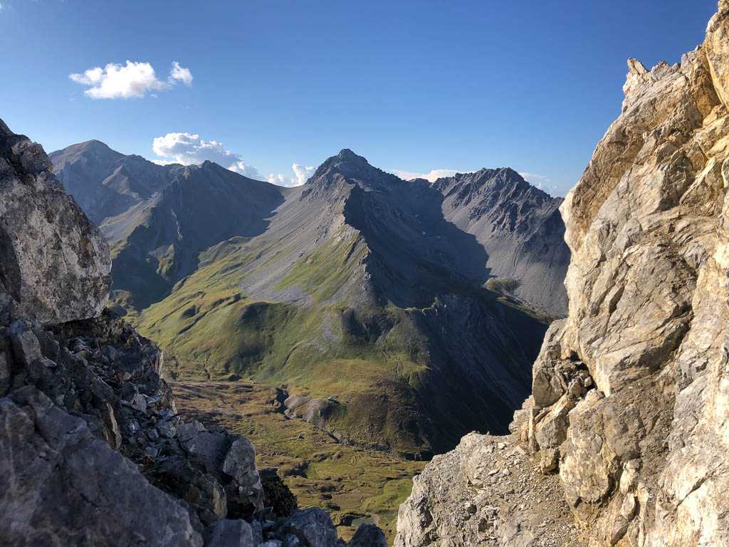 In der letzten Rinne vor dem Gipfelaufschwung klettern wir erneut nach oben und stehen zum zweiten Mal auf dem Grat. Dieses Mal reicht der Tiefblick bis hinunter zur im Welschtobel liegenden Ramozhütte:
